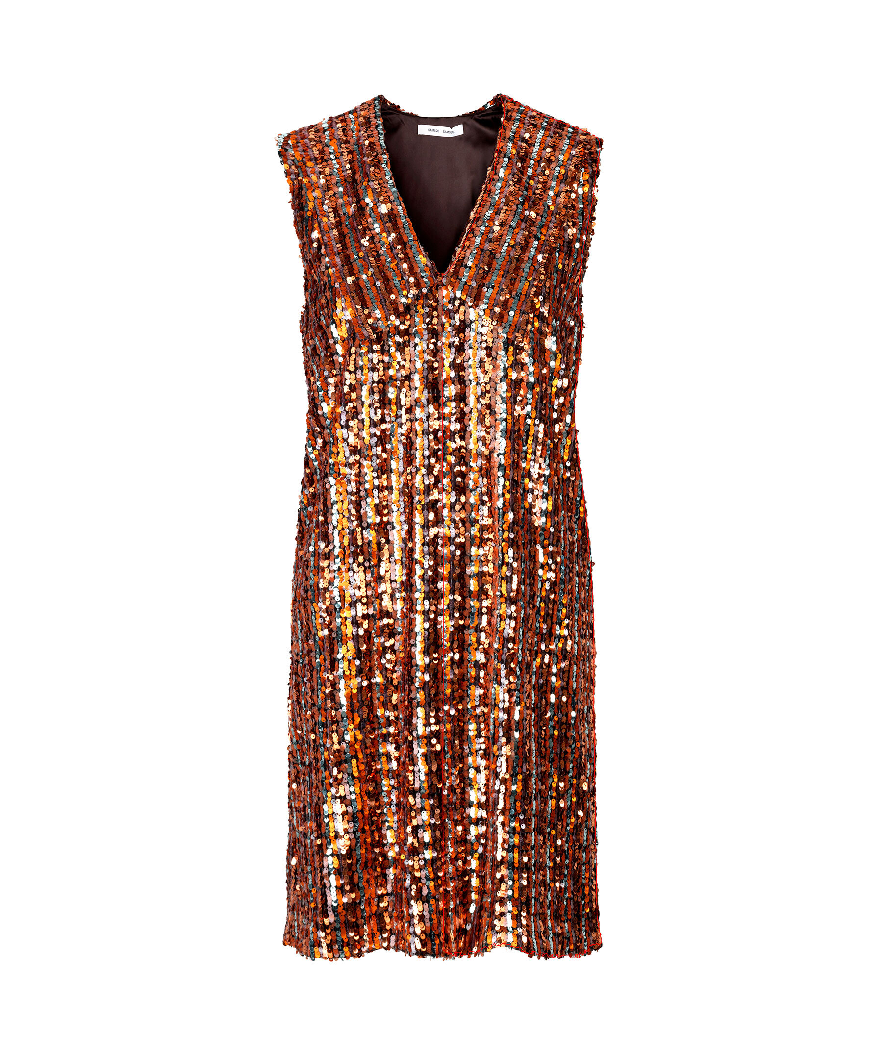 Ärmlös, glittrande paljettklänning från Samsoe Samsoe. Ärmlös, har en rak modell och en v-ringning fram. Dold dragkedja i vänster sida. Flerfärgat paljettmaterial, och foder i 100% polyester.