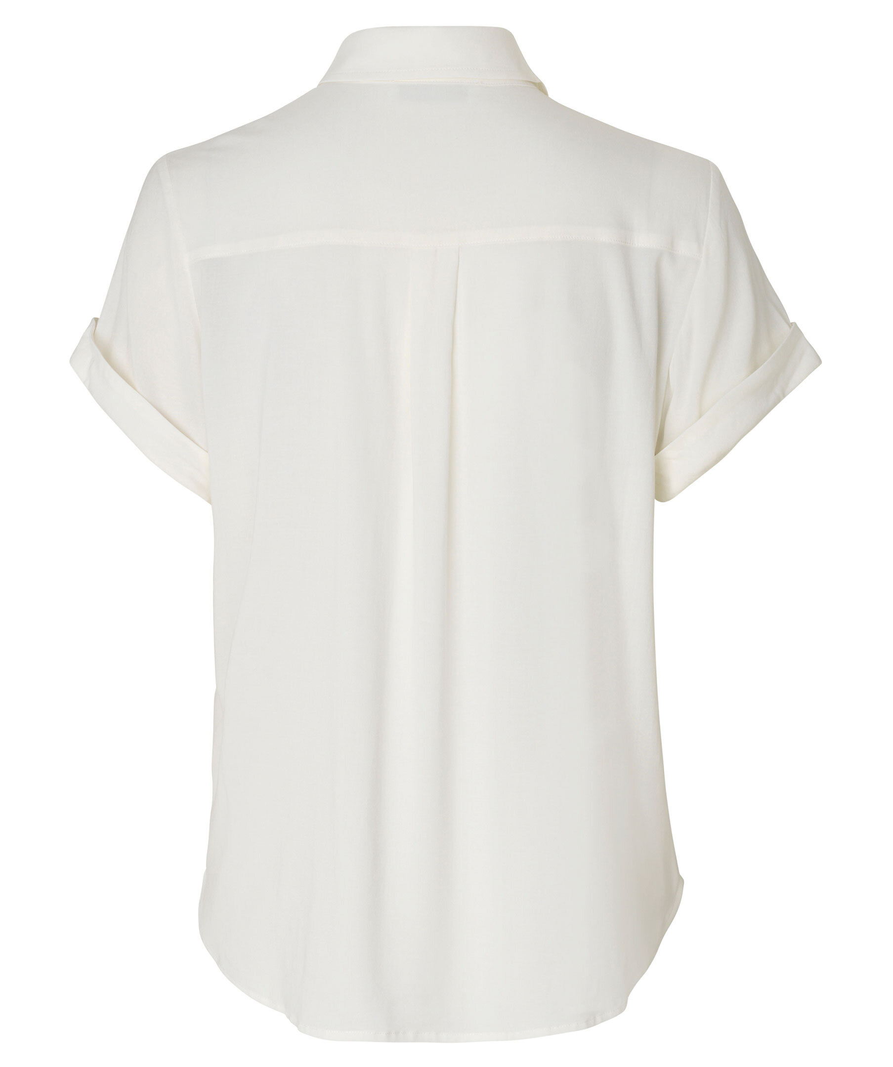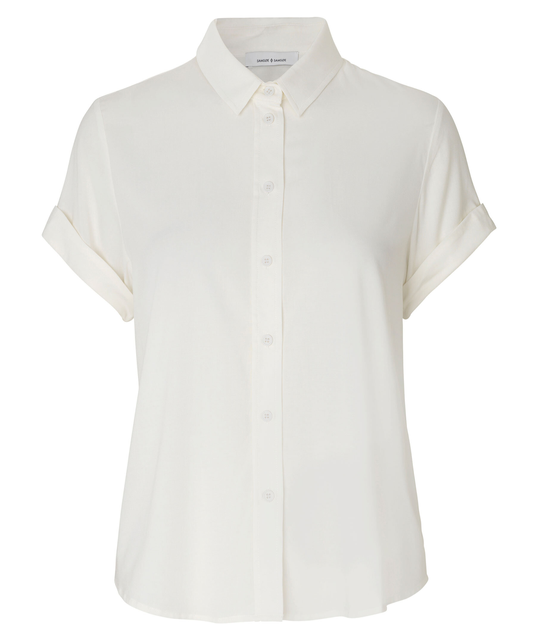 Vit kortärmad skjorta från Samsoe Samsoe. Stängs framtill med knappar. Spetsig krage. Uppvikta ärmar. Tillverkad i viskos blandning.