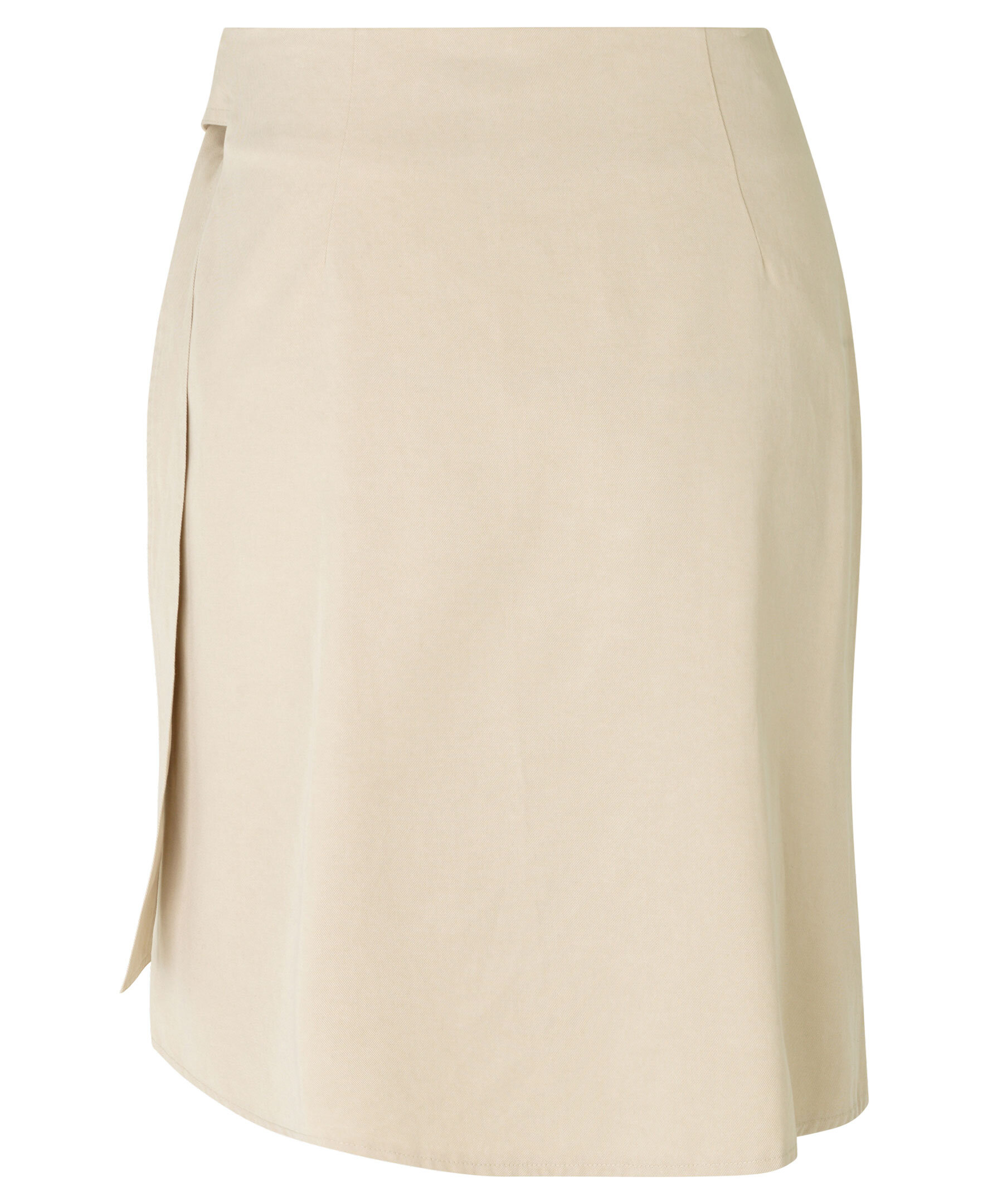 Beige, kort omlottkjol från Samsoe Samsoe. Integrerat midjeband att knyta i sidan. Tencel och ekologiskt bomullsblandat tyg med mjuk yta. Slutar strax ovanför knät.