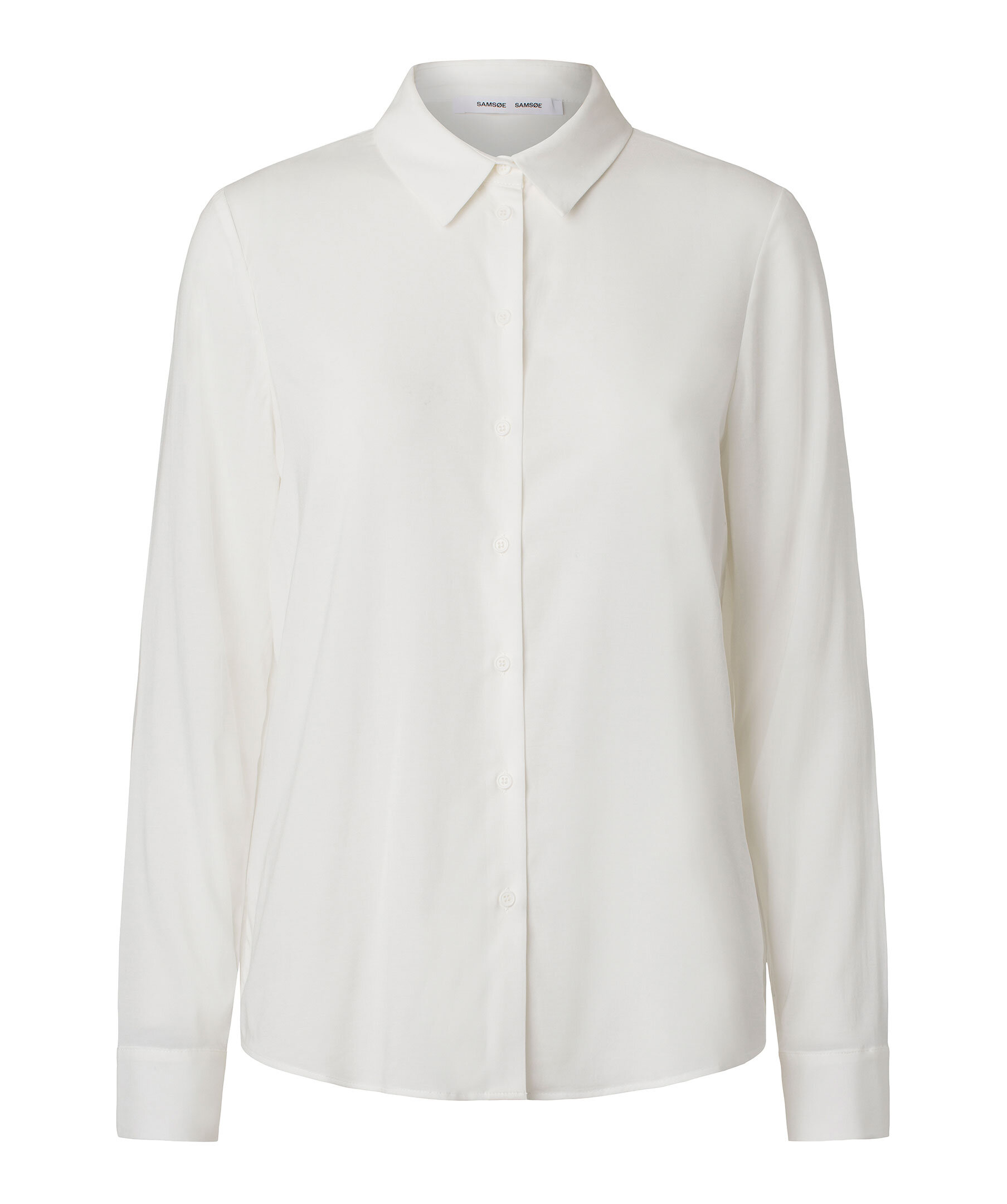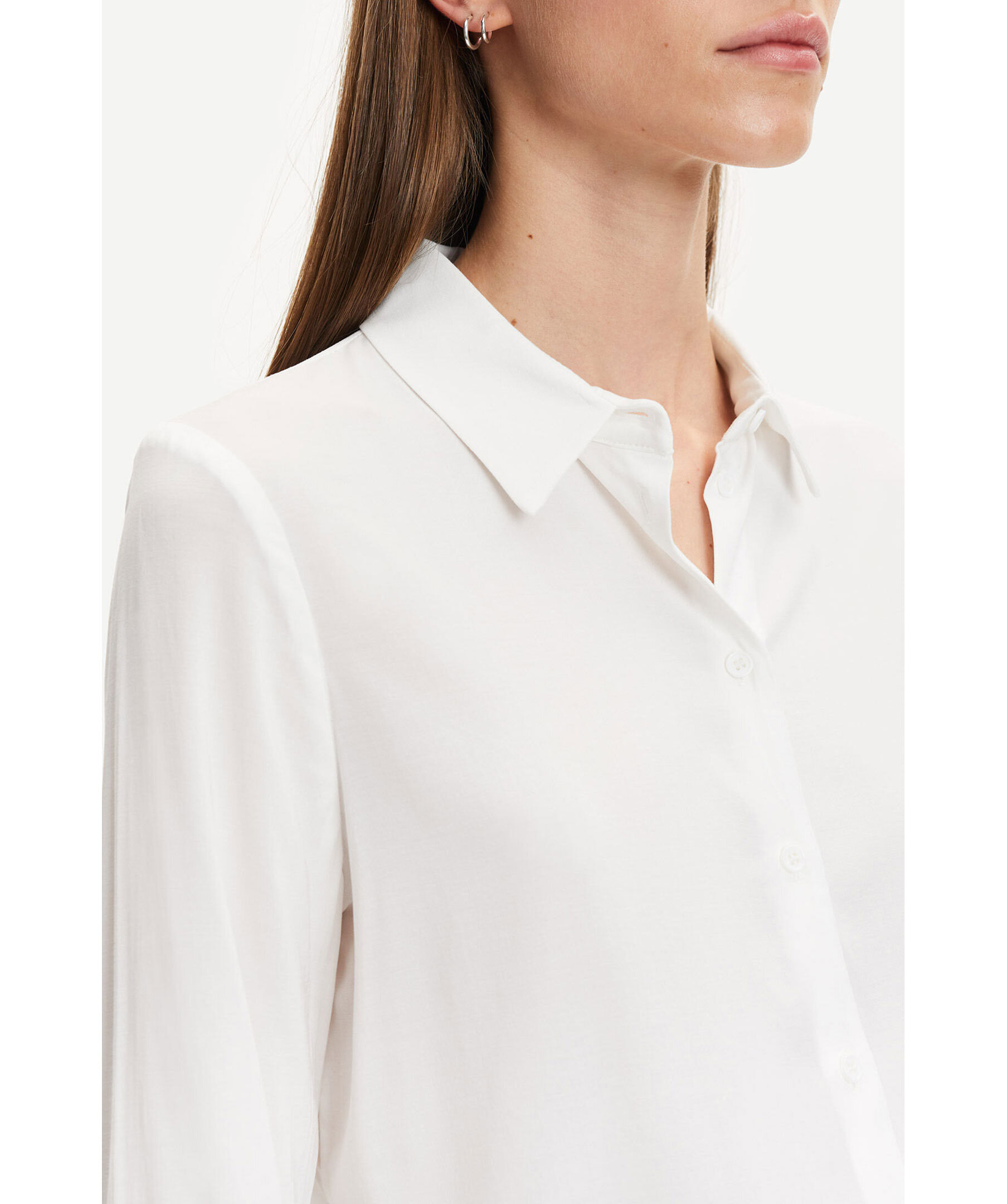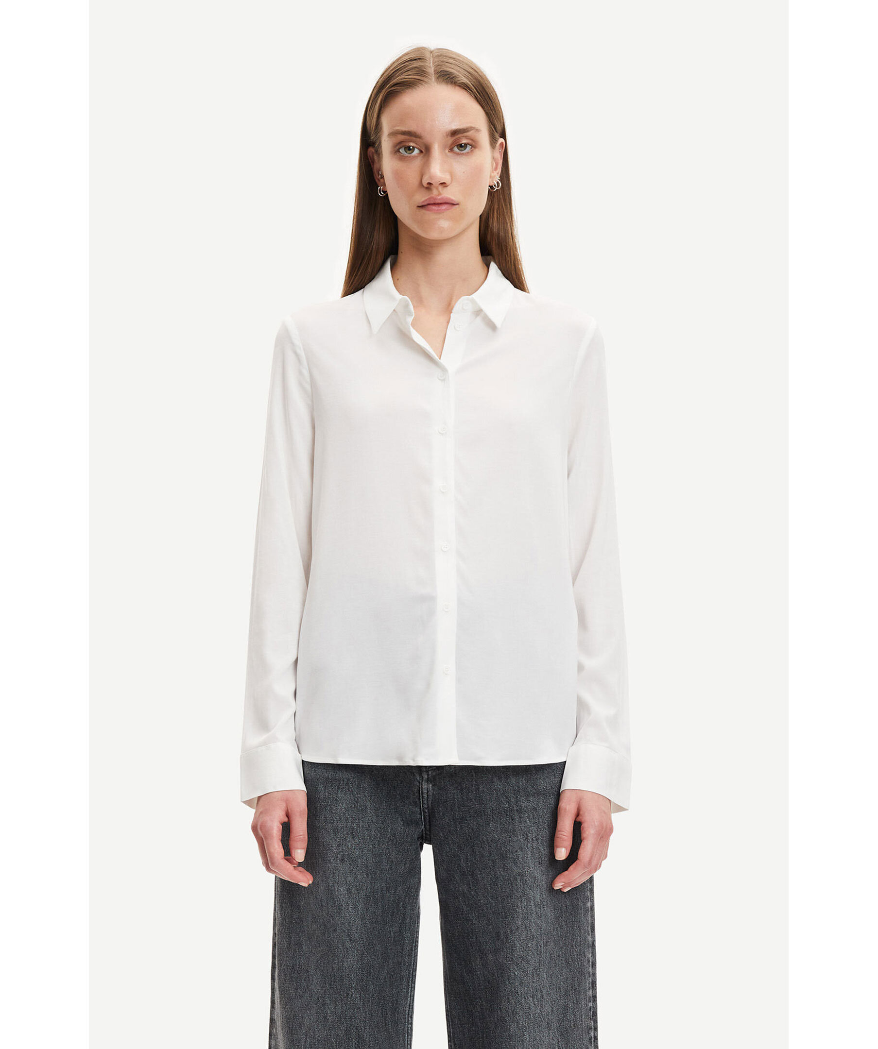 Vit skjorta från Samsoe Samsoe. Långa ärmar och svängd fåll. Spetsig krage, knäppning framtill och vid ärmslut. Huvudmaterial vävt av en elastisk viskosblandning. Denna produkt innehåller LENZING™ ECOVERO™ Viskos, certifierad med EU Ecolabel för att uppfylla höga miljökrav. Längd från High Point Shoulder på storlek small är 70,5 cm.
