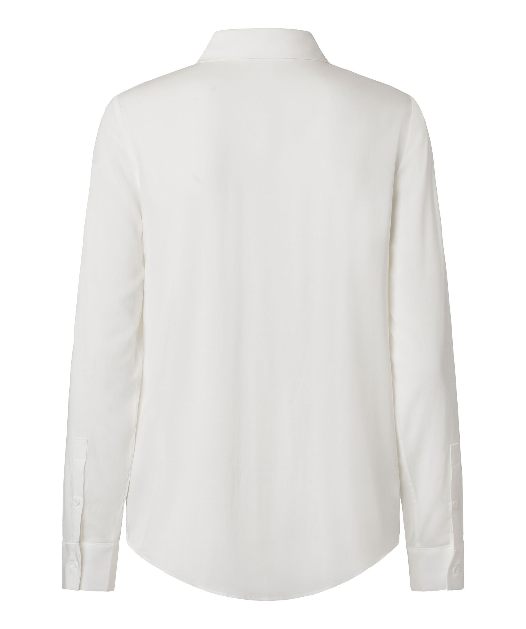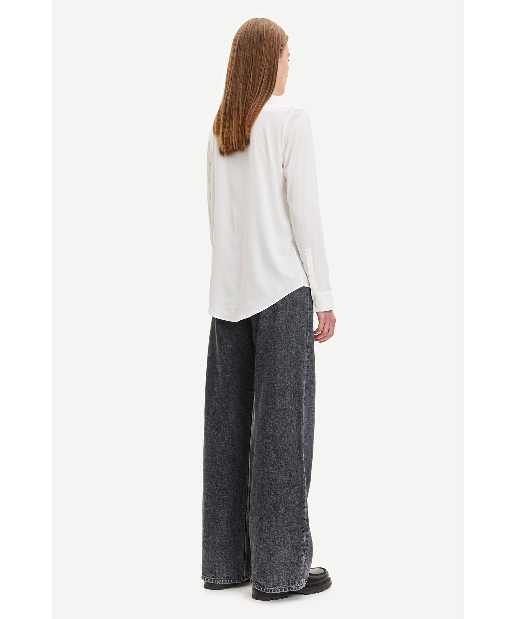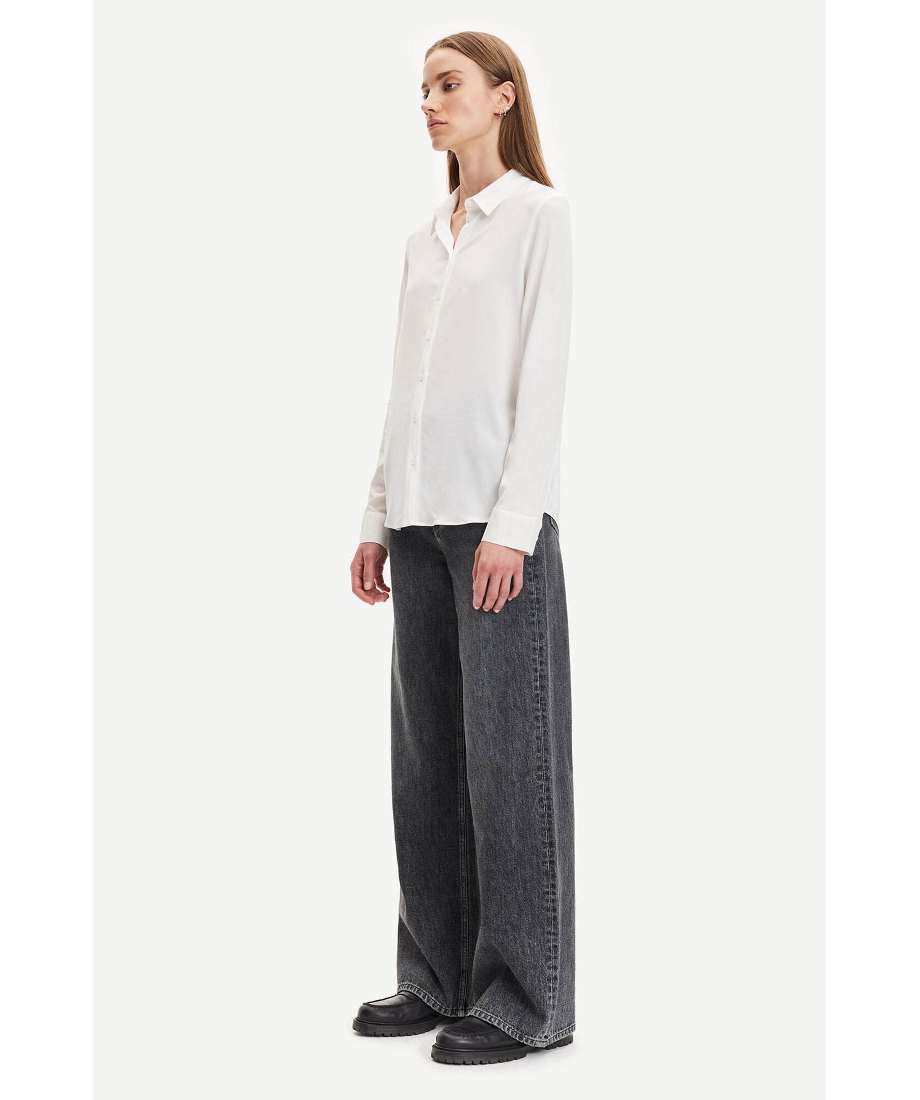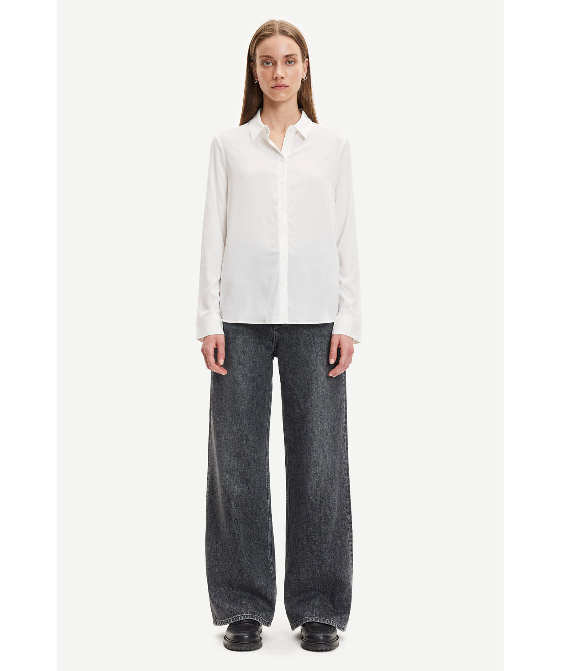 Vit skjorta från Samsoe Samsoe. Långa ärmar och svängd fåll. Spetsig krage, knäppning framtill och vid ärmslut. Huvudmaterial vävt av en elastisk viskosblandning. Denna produkt innehåller LENZING™ ECOVERO™ Viskos, certifierad med EU Ecolabel för att uppfylla höga miljökrav. Längd från High Point Shoulder på storlek small är 70,5 cm.