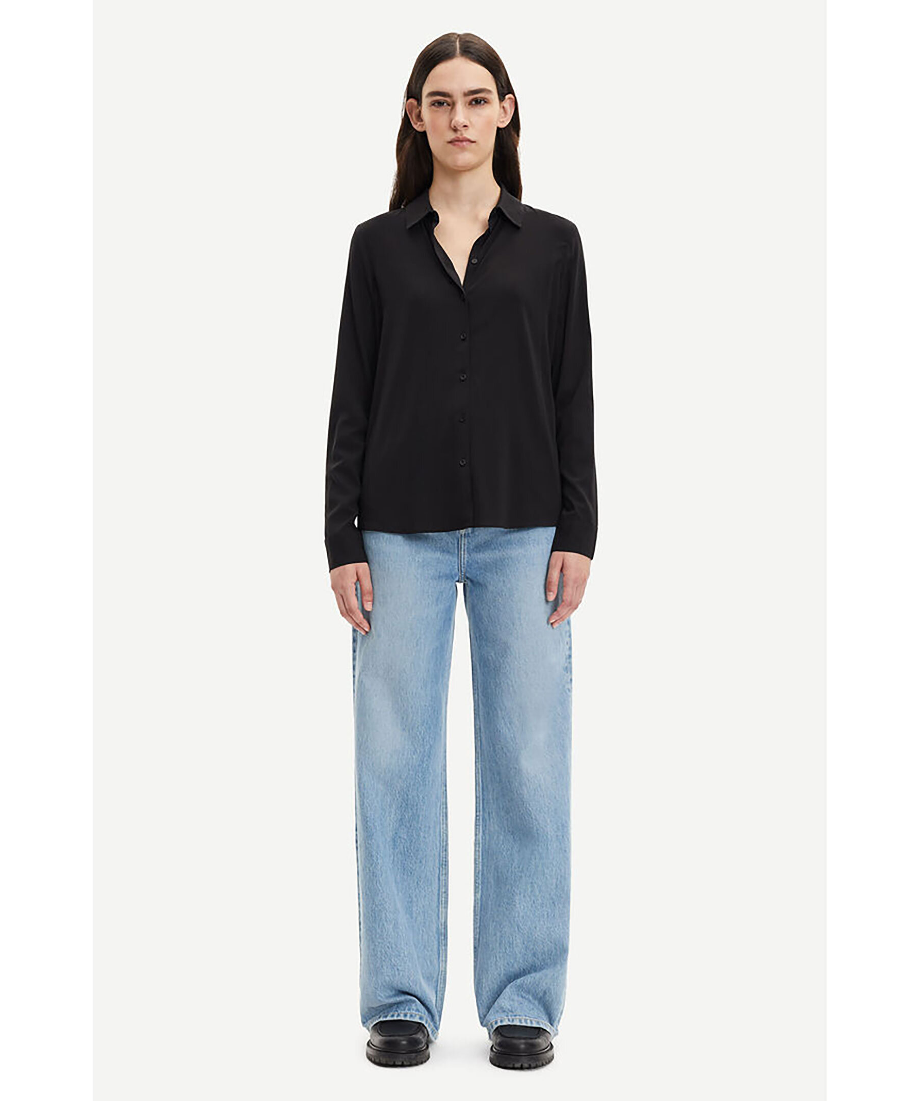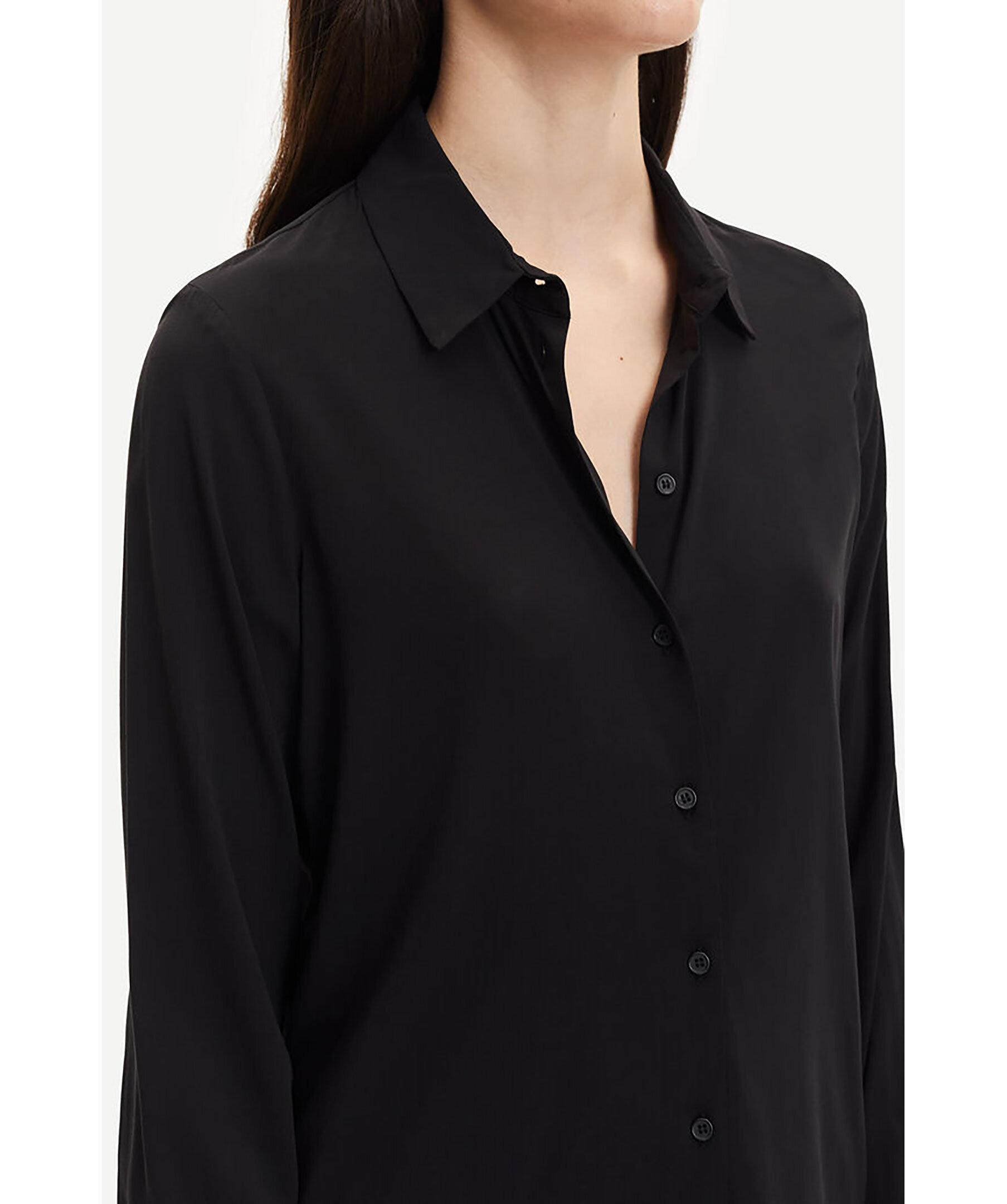 Svart skjorta med normal passform, långa ärmar och rundad fåll från Samsoe Samsoe. Spetsig krage och knäppning framtill samt vid manschetterna. Huvudmaterialet är vävt av en elastisk viskosblandning. Denna produkt innehåller LENZING™ ECOVERO™ viskos, certifierad med EU Ecolabel för att uppfylla höga miljöstandarder.