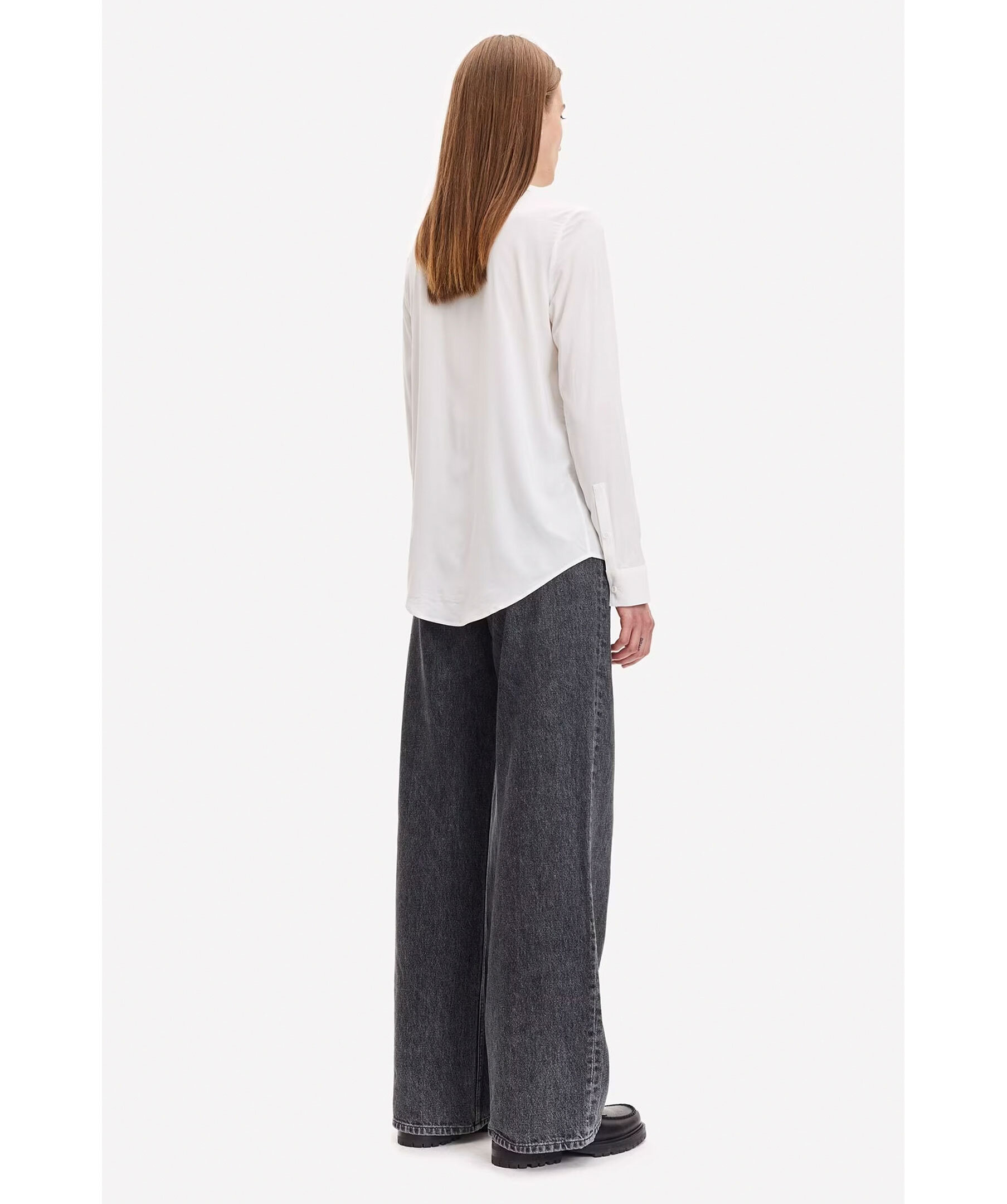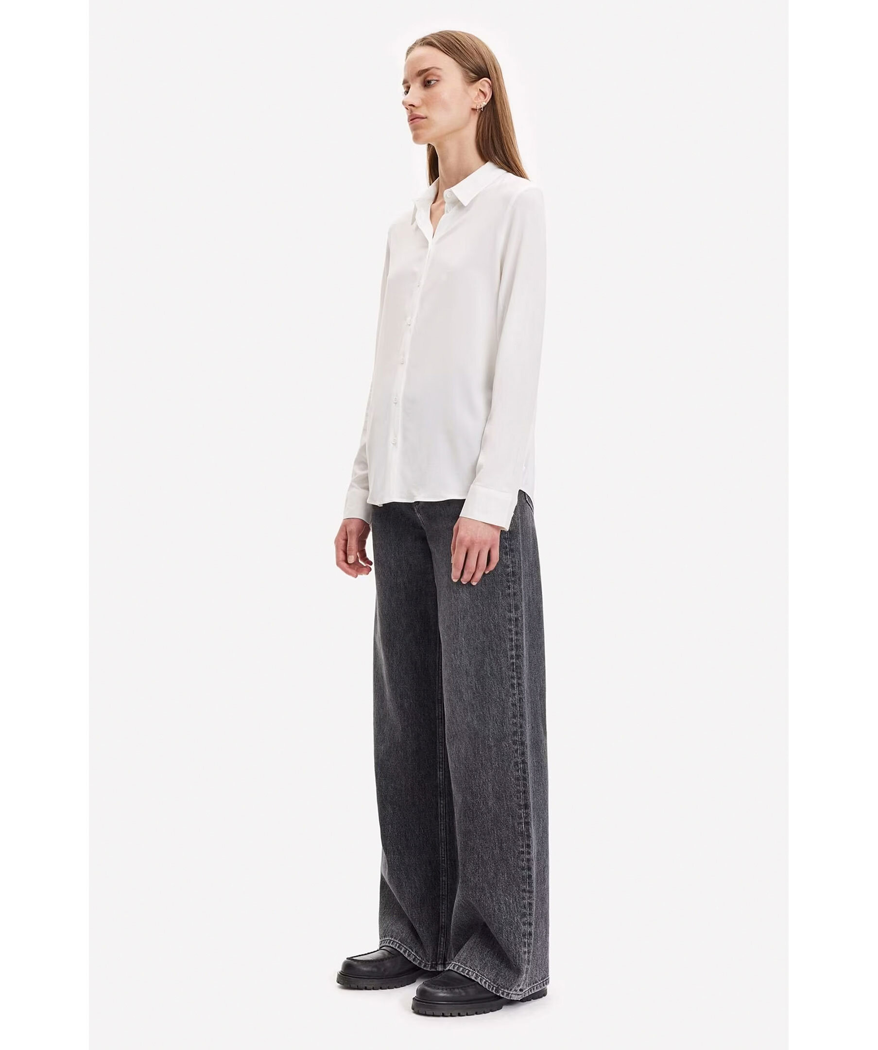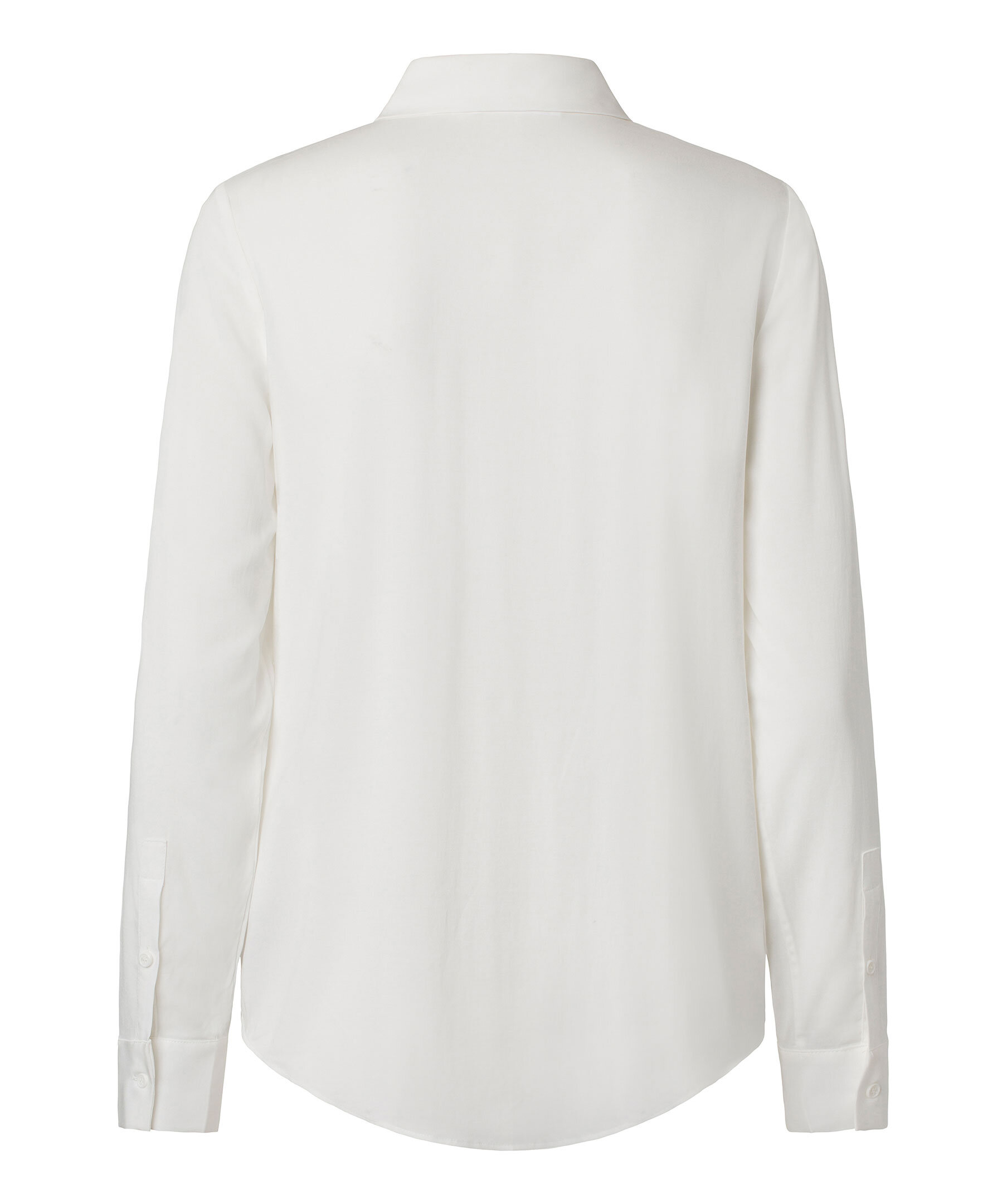 Vit skjorta med normal passform, långa ärmar och rundad fåll från Samsoe Samsoe. Spetsig krage och knäppning framtill samt vid manschetterna. Huvudmaterialet är vävt av en elastisk viskosblandning. Denna produkt innehåller LENZING™ ECOVERO™ viskos, certifierad med EU Ecolabel för att uppfylla höga miljöstandarder. Modellen är 176cm och har på sig strl S.