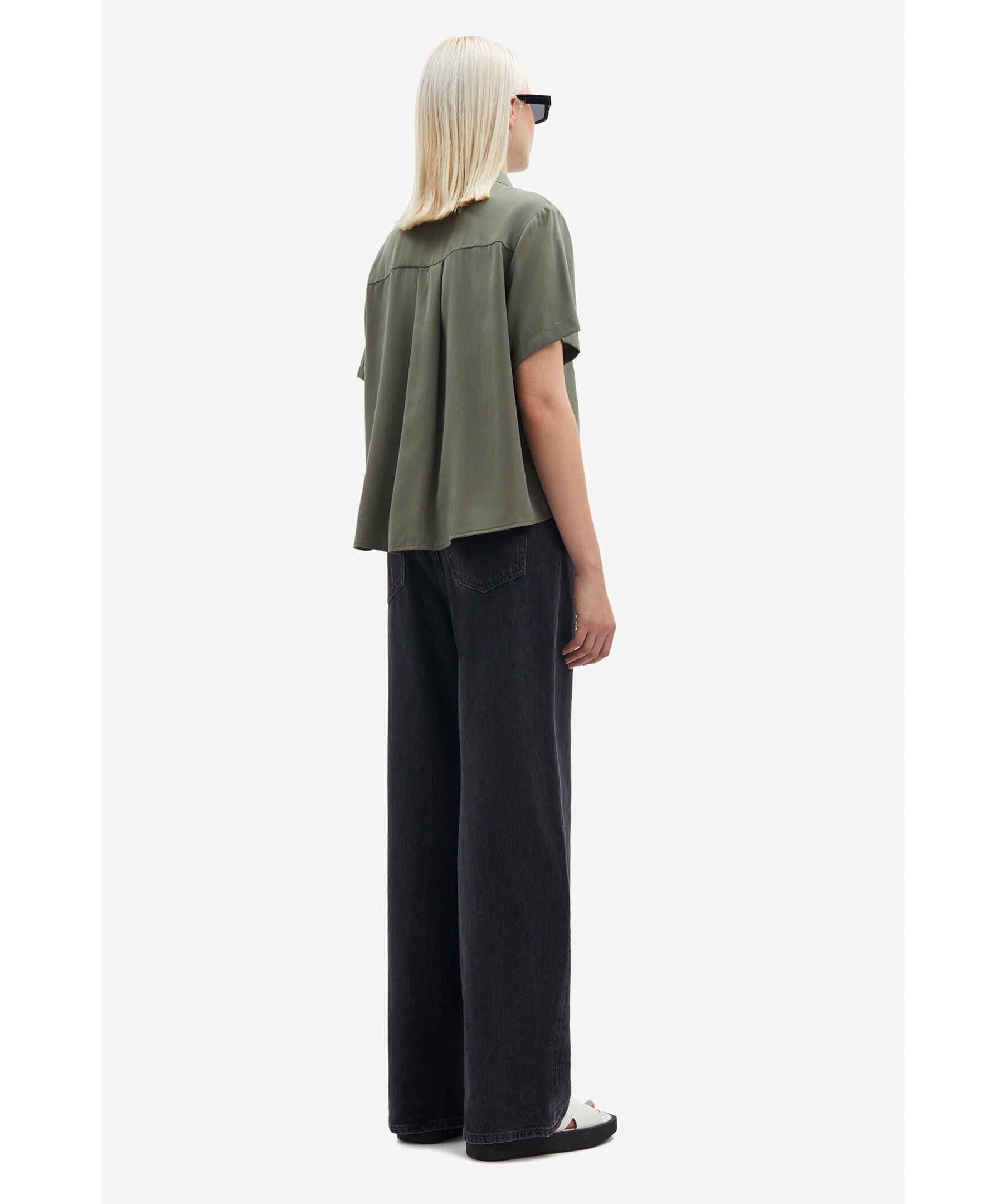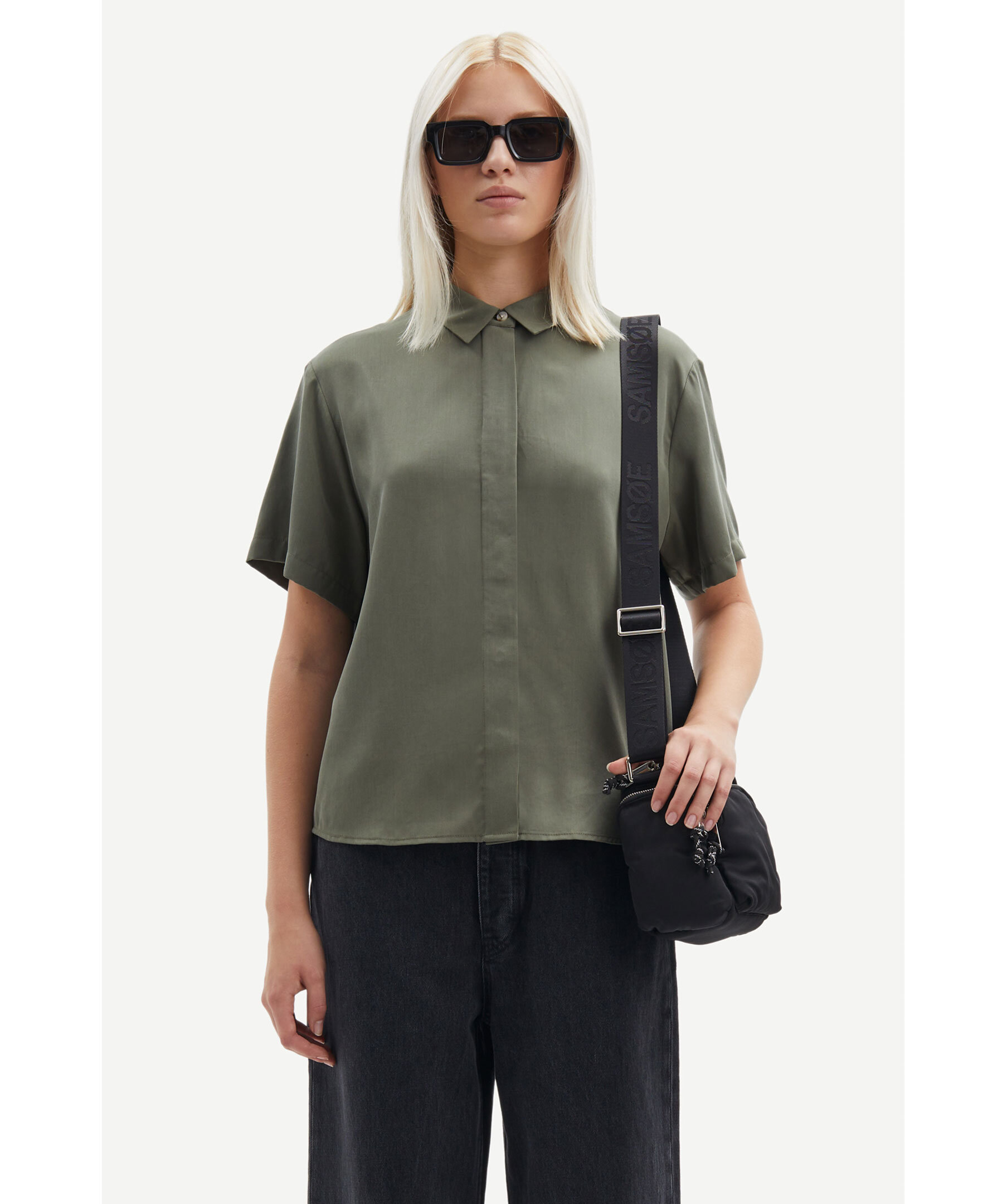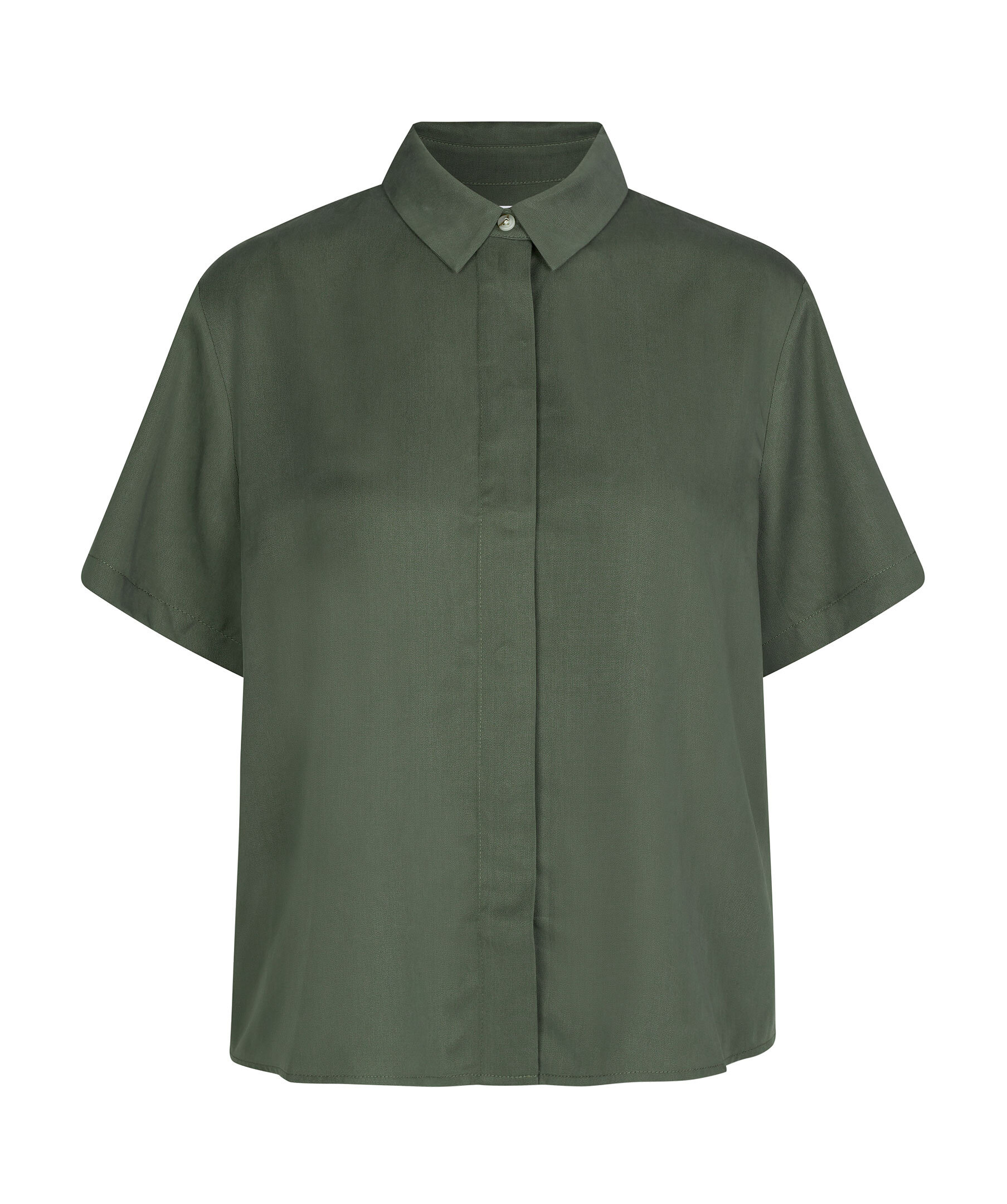 Skogsgrön kortärmad skjorta från Samsoe Samsoe. Stängs framtill med dolda knappar. Spetsig krage. Bred boxpleat i ryggen. Tillverkad i 100% TENCEL™ Lyocell.