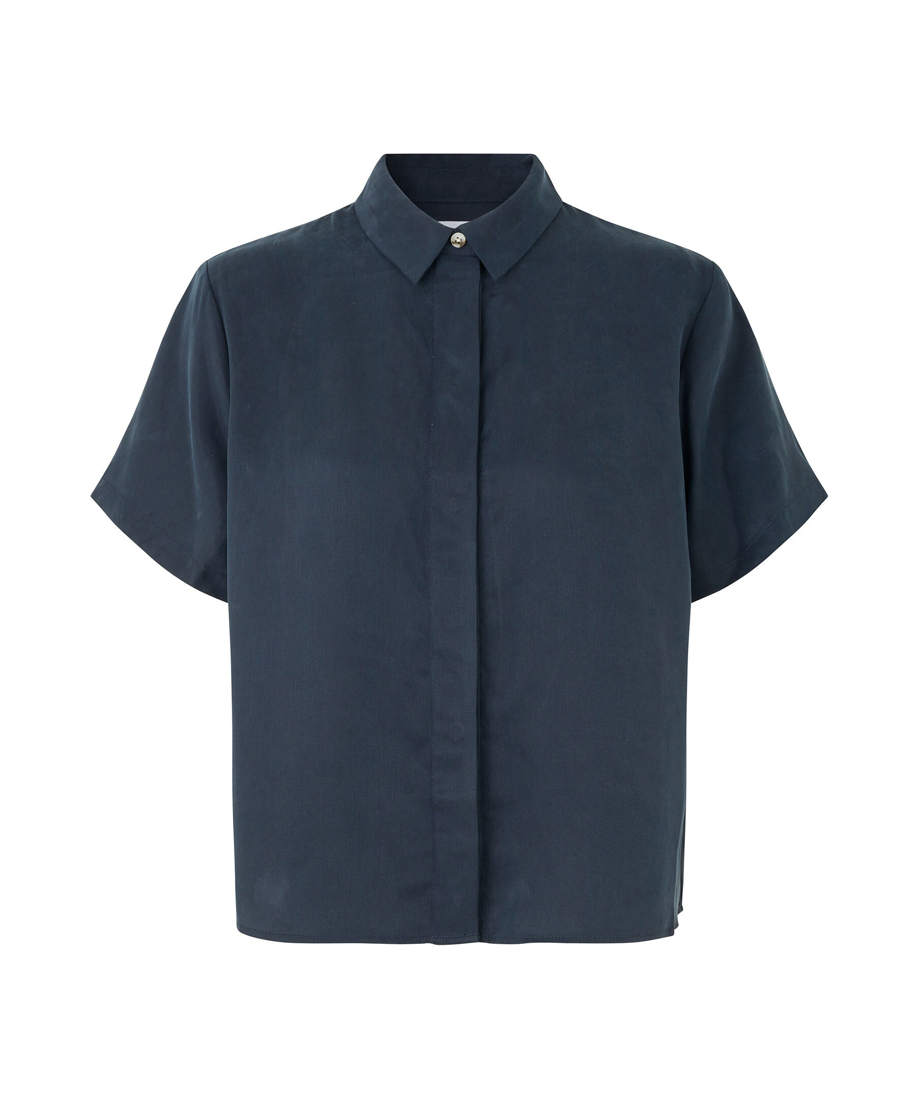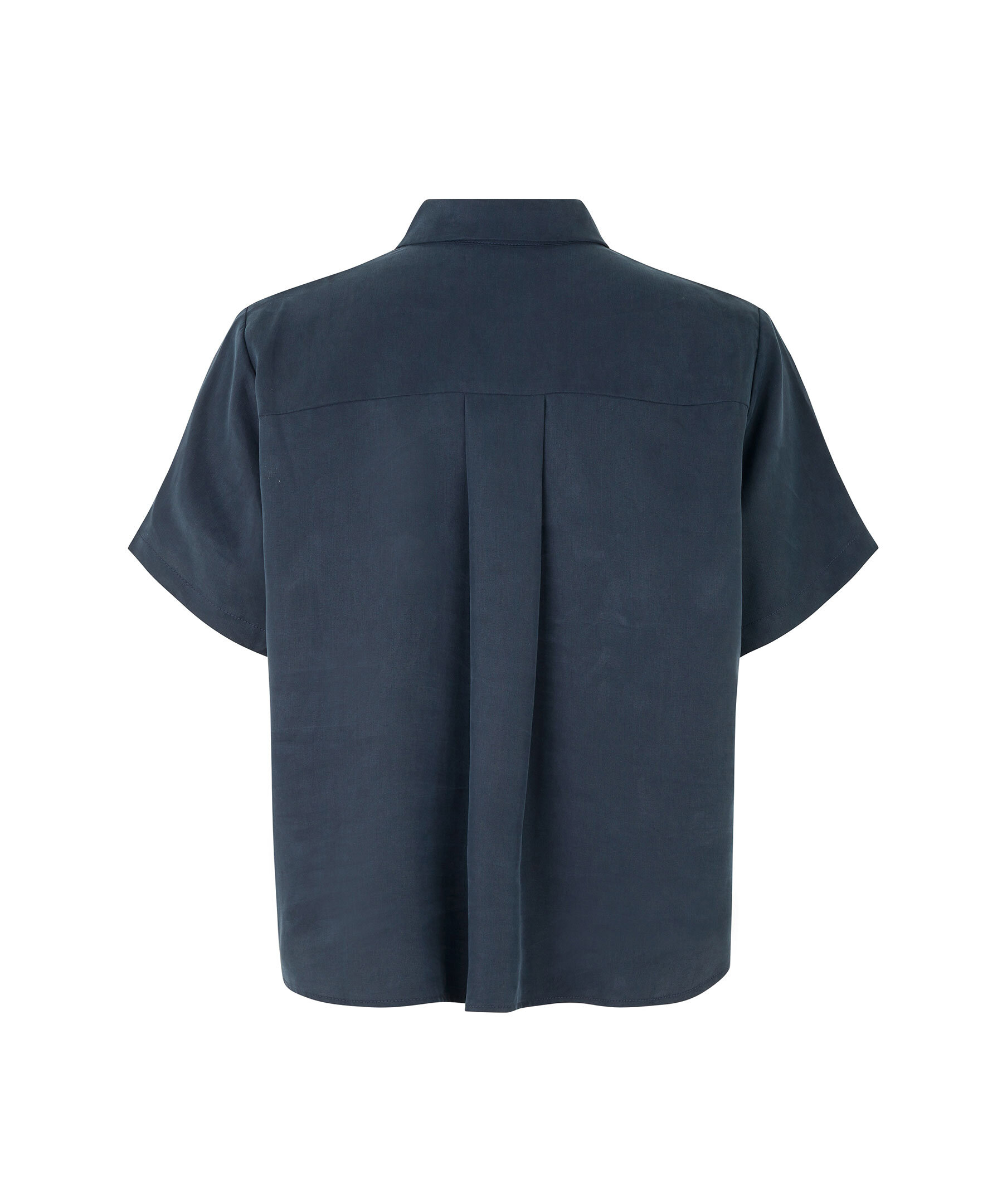 Mörkblå, kortärmad skjorta från Samsoe Samsoe. Stängs framtill med dolda knappar. Spetsig krage. Boxpleat på ryggen. Tillverkad i 100% Lyocell