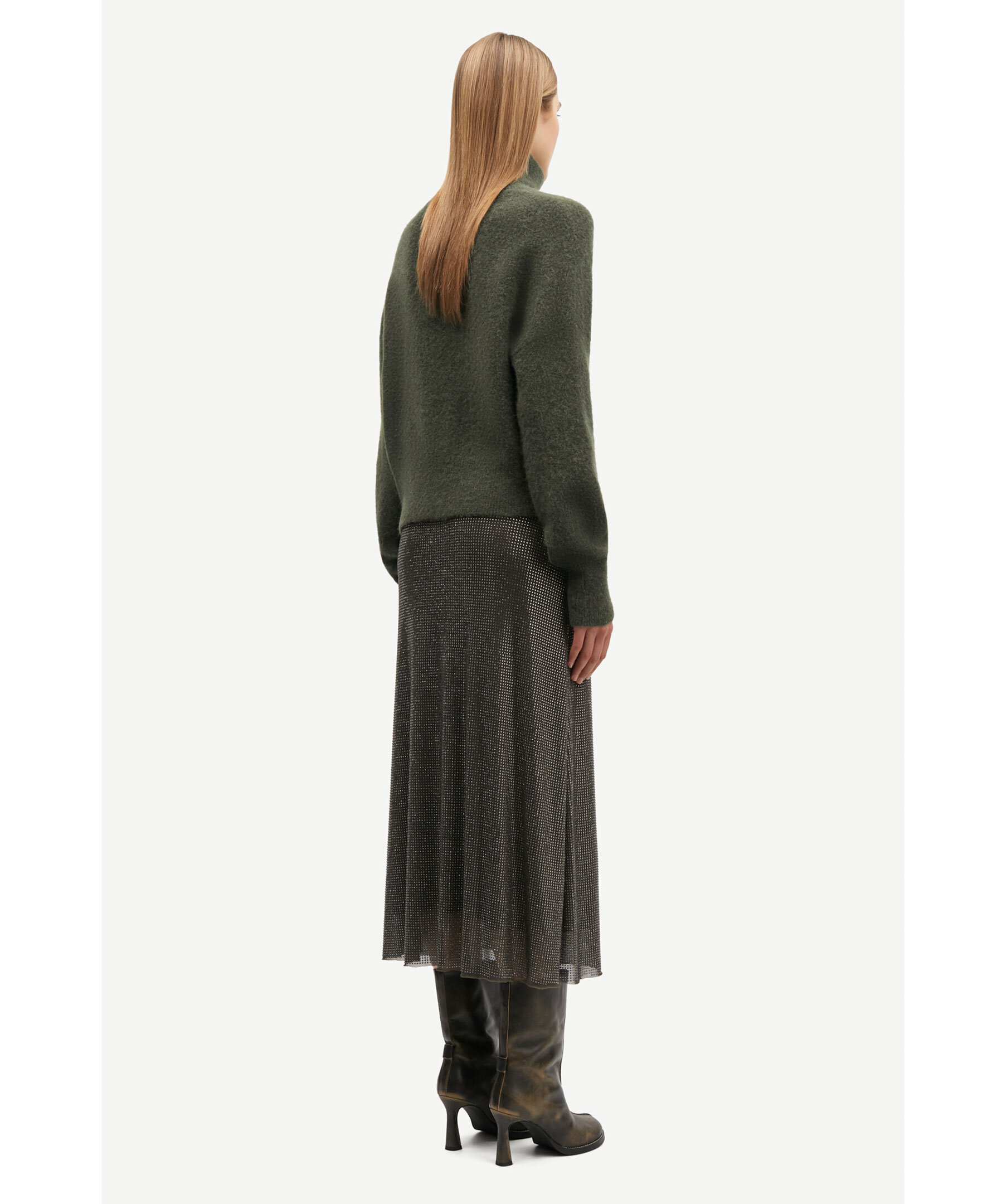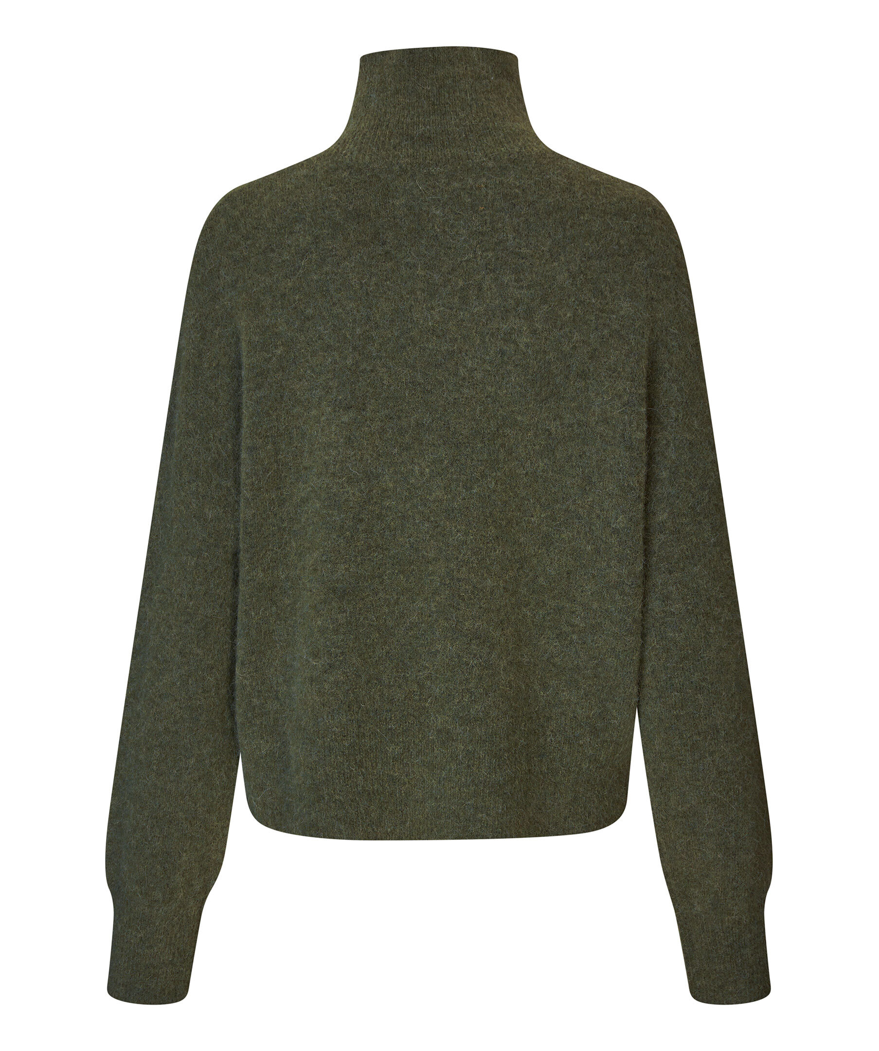 Skogsgrön, stickad polotröja från Samsoe Samsoe. Tröjan har hög krage och ribbstickade detaljer. Huvudmaterial tillverkat av en blandning med ull, alpackaull och återvunnen polyester.