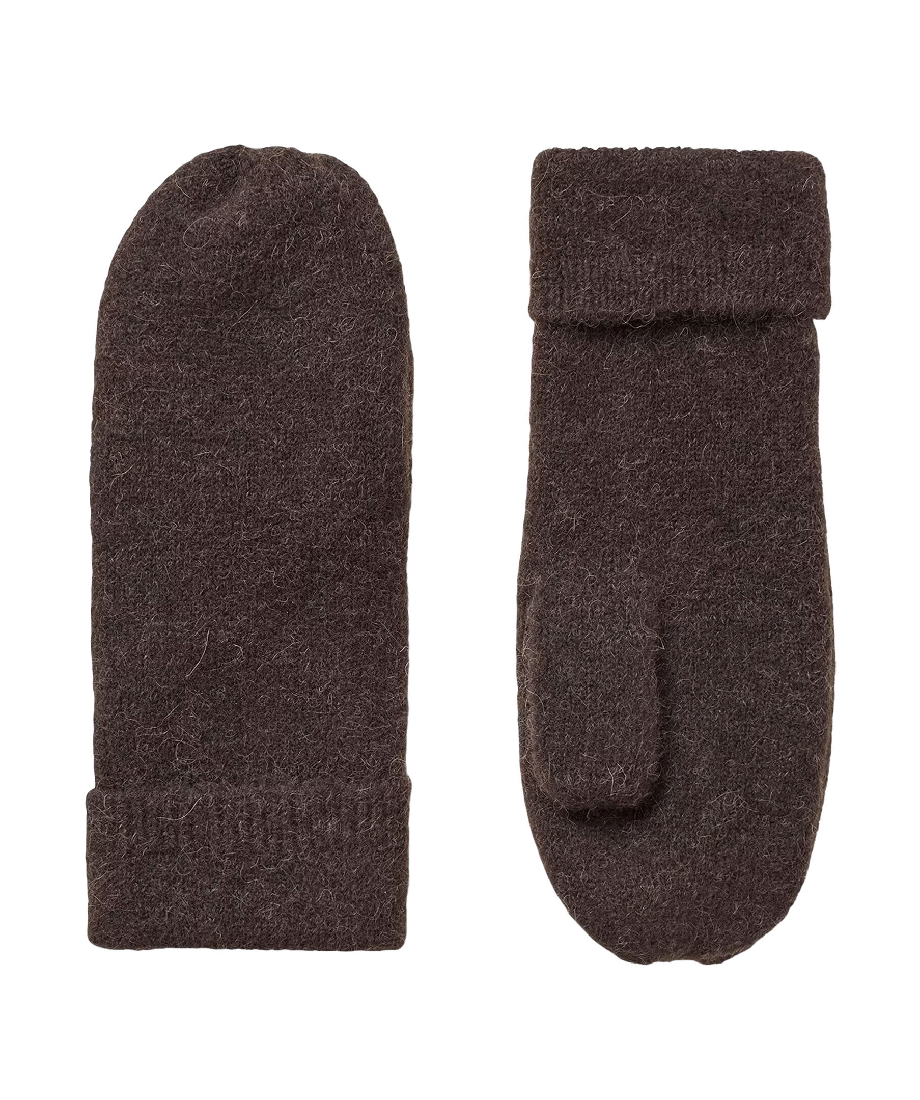 Mörkbruna stickade tumvantar från Samsoe Samsoe. Uppvikt kant vid skaftet. Tillverkad i en skön ullmix.