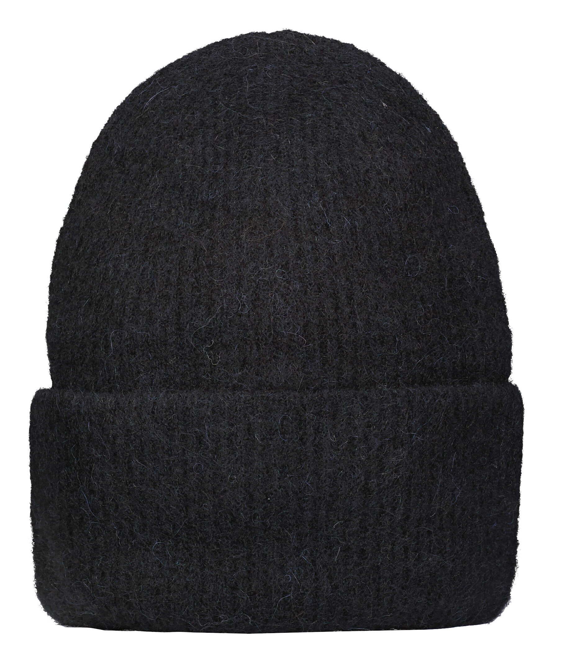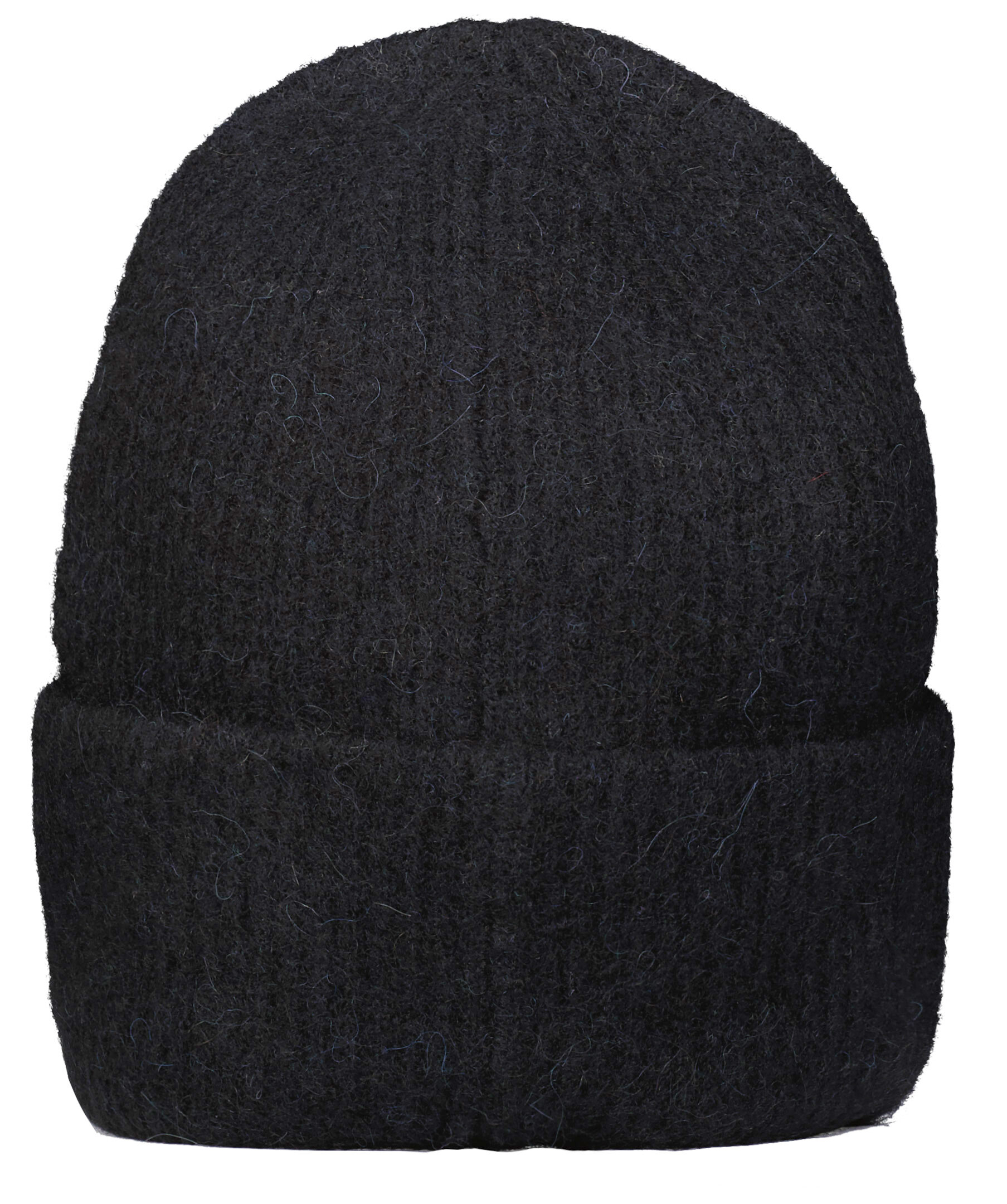 Svart stickad mössa från Samsoe Samsoe i varm och skön ullmix. Har en uppvikt kant och är ribbstickad.