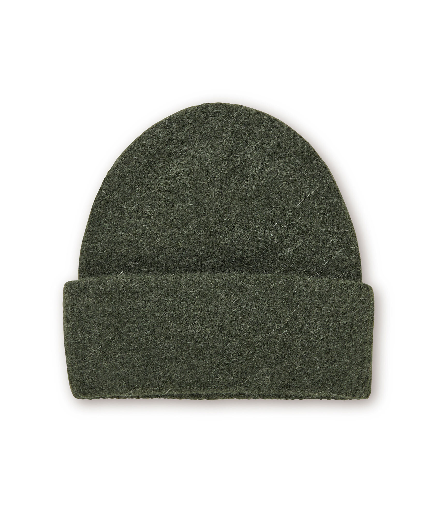Mörkgrön stickad mössa från Samsoe Samsoe i varm och skön ullmix. Mössan har en uppvikt kant och är ribbstickad.