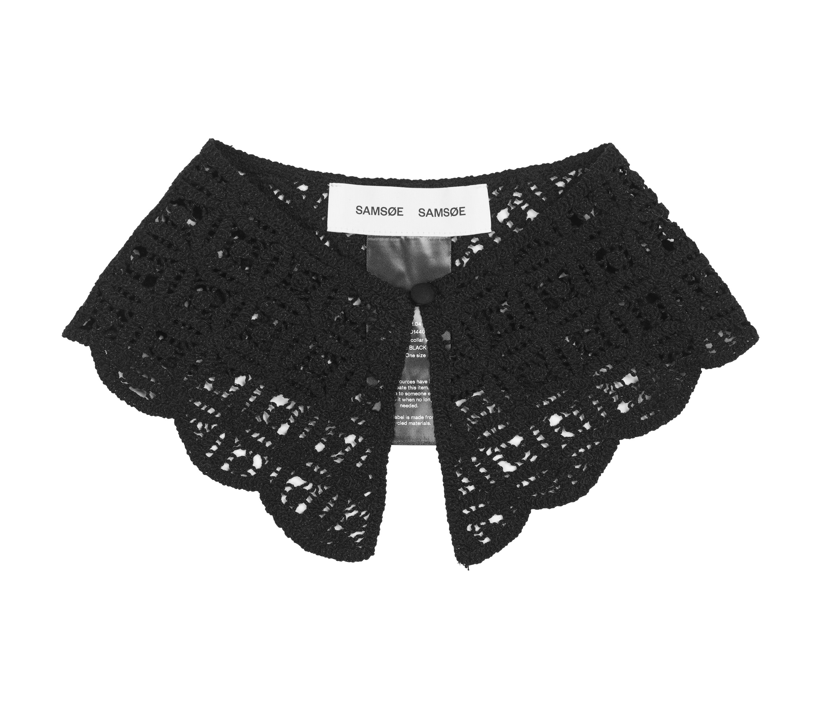 Svart Krage i spets från Samsoe Samsoe. Tillverkade i 100% Bomull. Stängs framtill med knapp och öggla. Kan bäras över alla slags ringningar över - blusar, tröjor och klänningar.