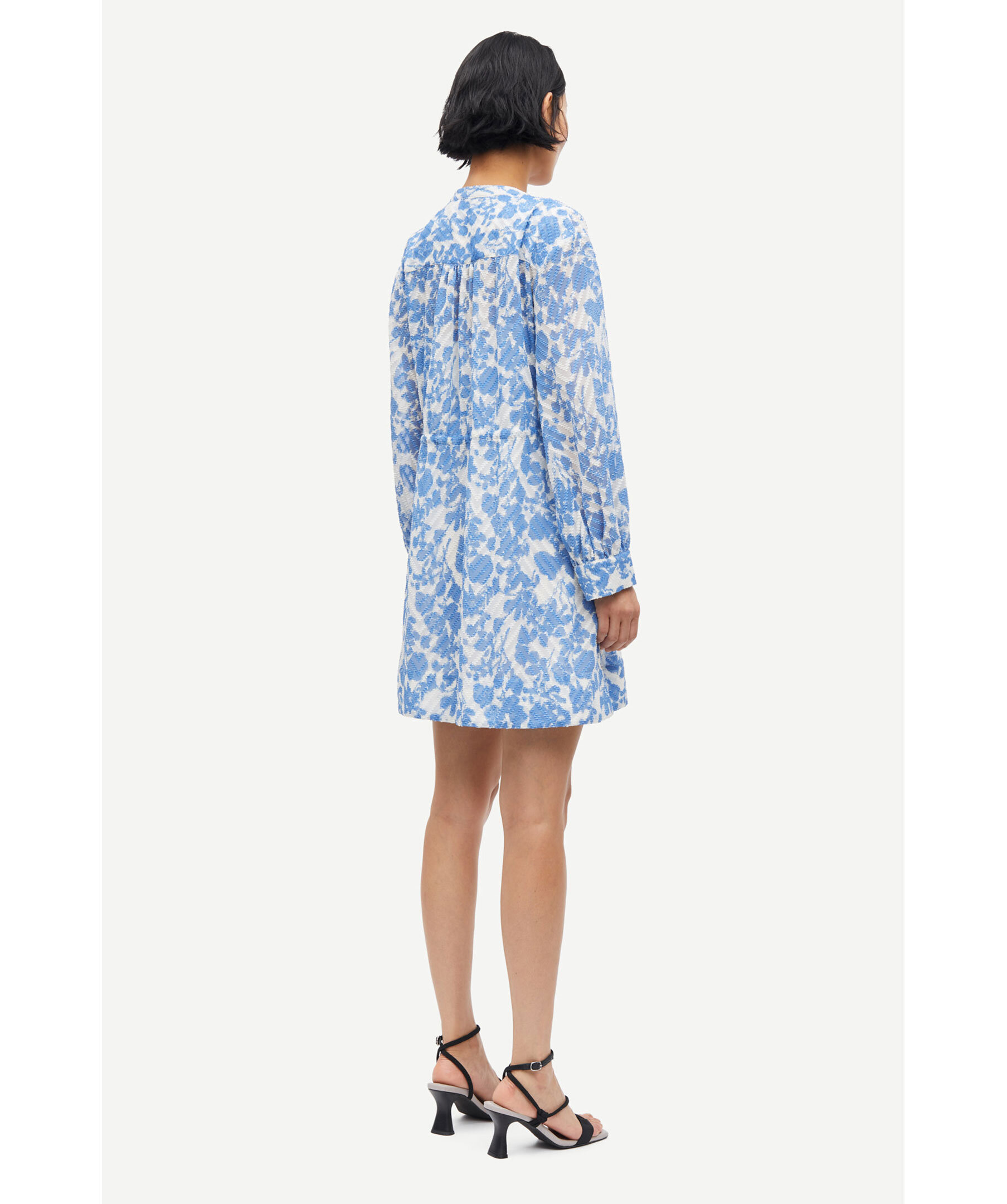 Blå och vit, blommönstrad och långärmad miniklänning från Samsoe Samsoe. Lös passform och A-linjeformad siluett. V-ringad hals med knäppning framtill, dragsko i midjan och ärmslut med knäppning. Sidofickor. Slipklänning fastsydd. Tillverkad i 100% polyester.