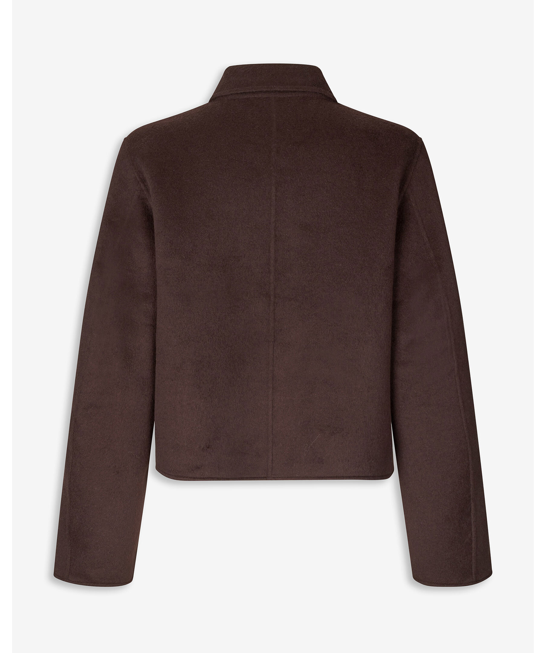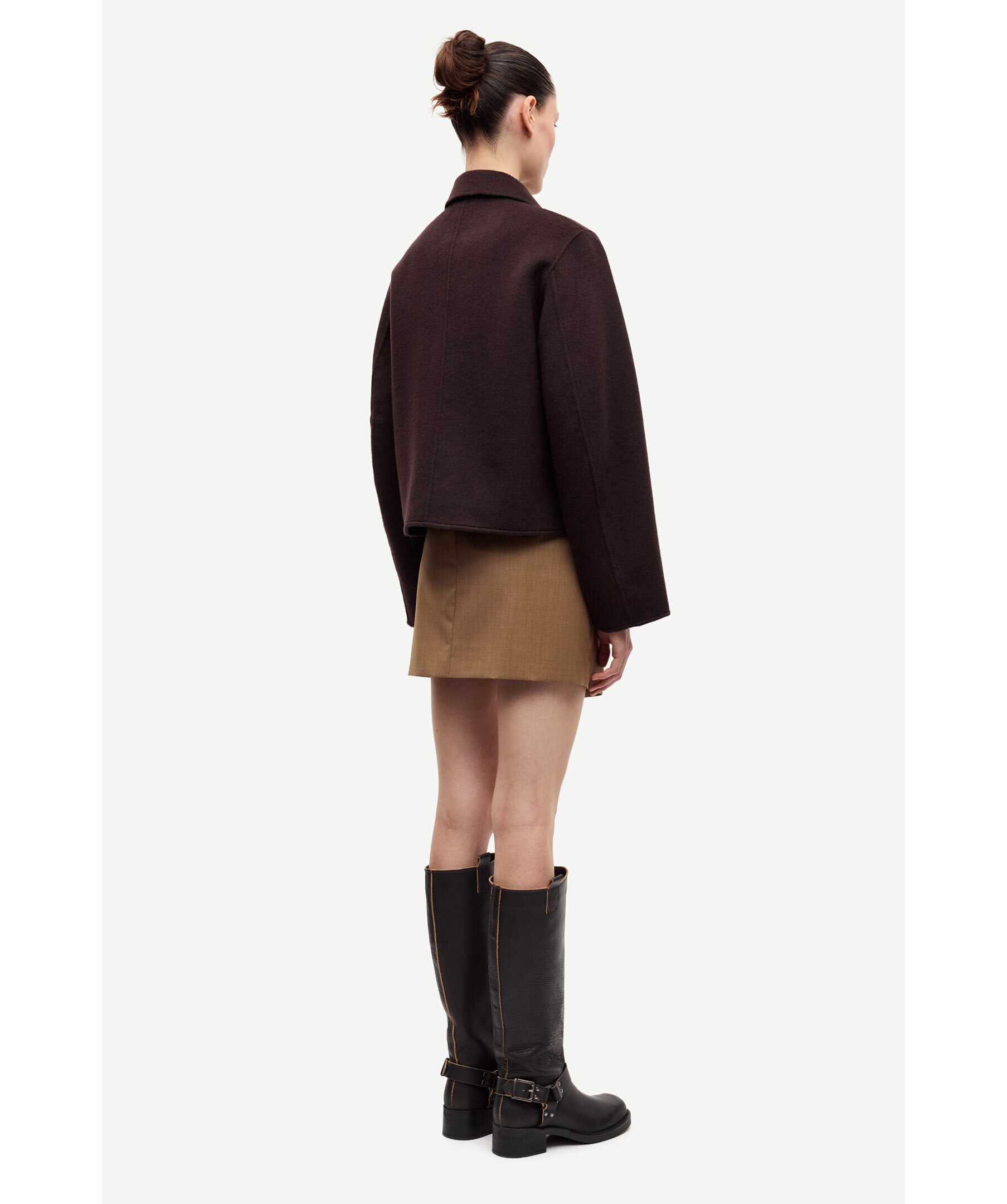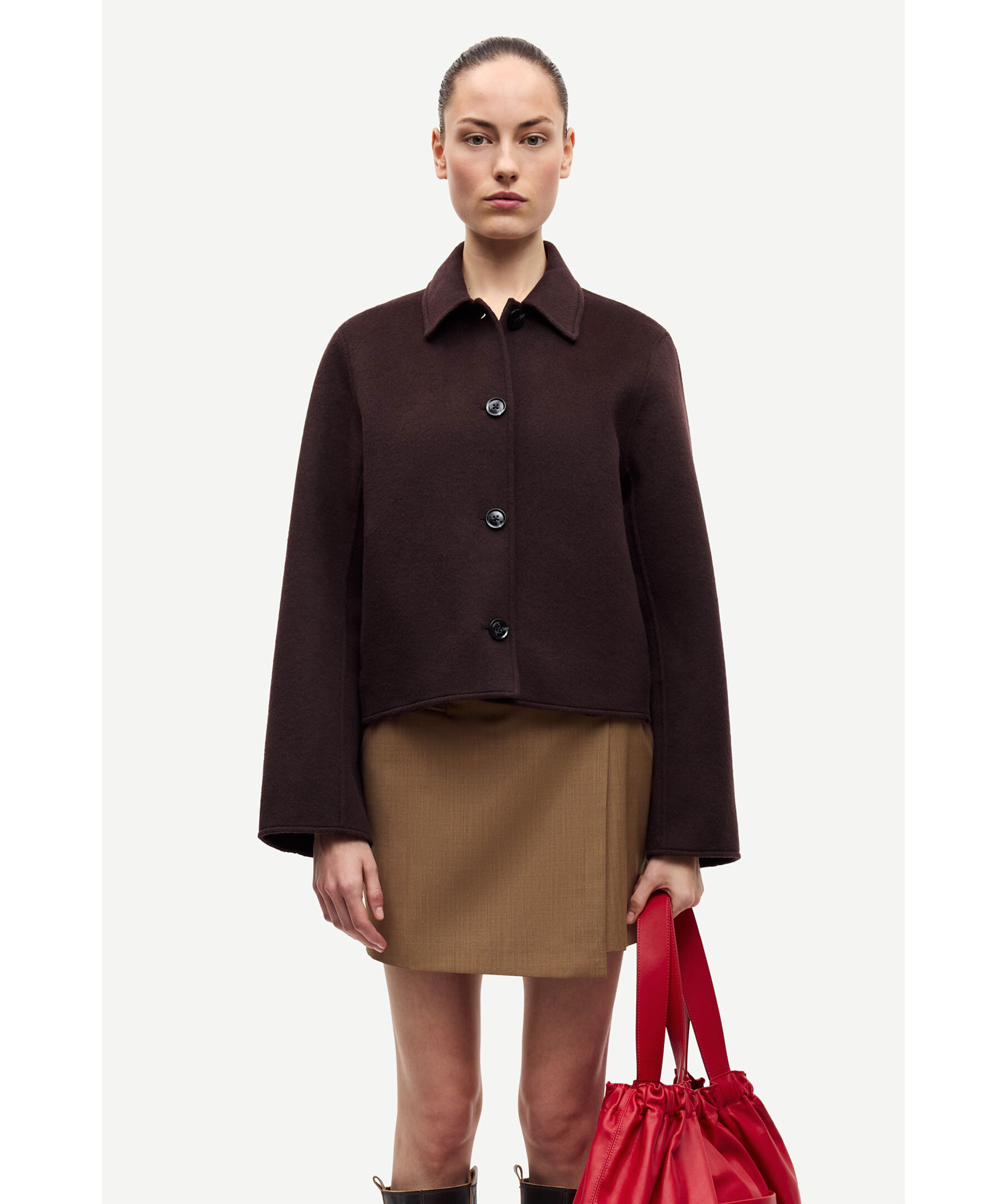 Mörkbrun kort kappa från Samsøe & Samsøe. Jackan har en stilren form med en klassisk krage, knäppning framtill och diskreta sidofickor. Tillverkad i återvunnen ull.