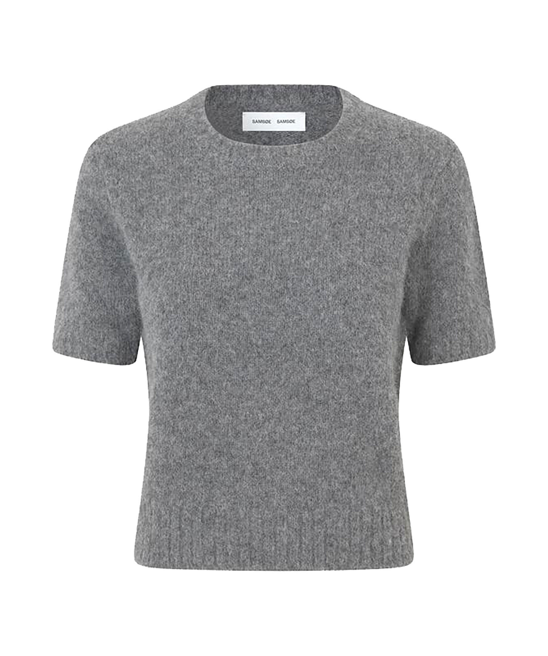 Grå tröja från Samsoe Samsoe. Tröjan har trekvartsärm och en croppad siluett. Ribbstickad rund krage samt ribbstickade ärm- och tröjavslut. Borstad look och tillverkad av en elastisk blandning med alpacka.