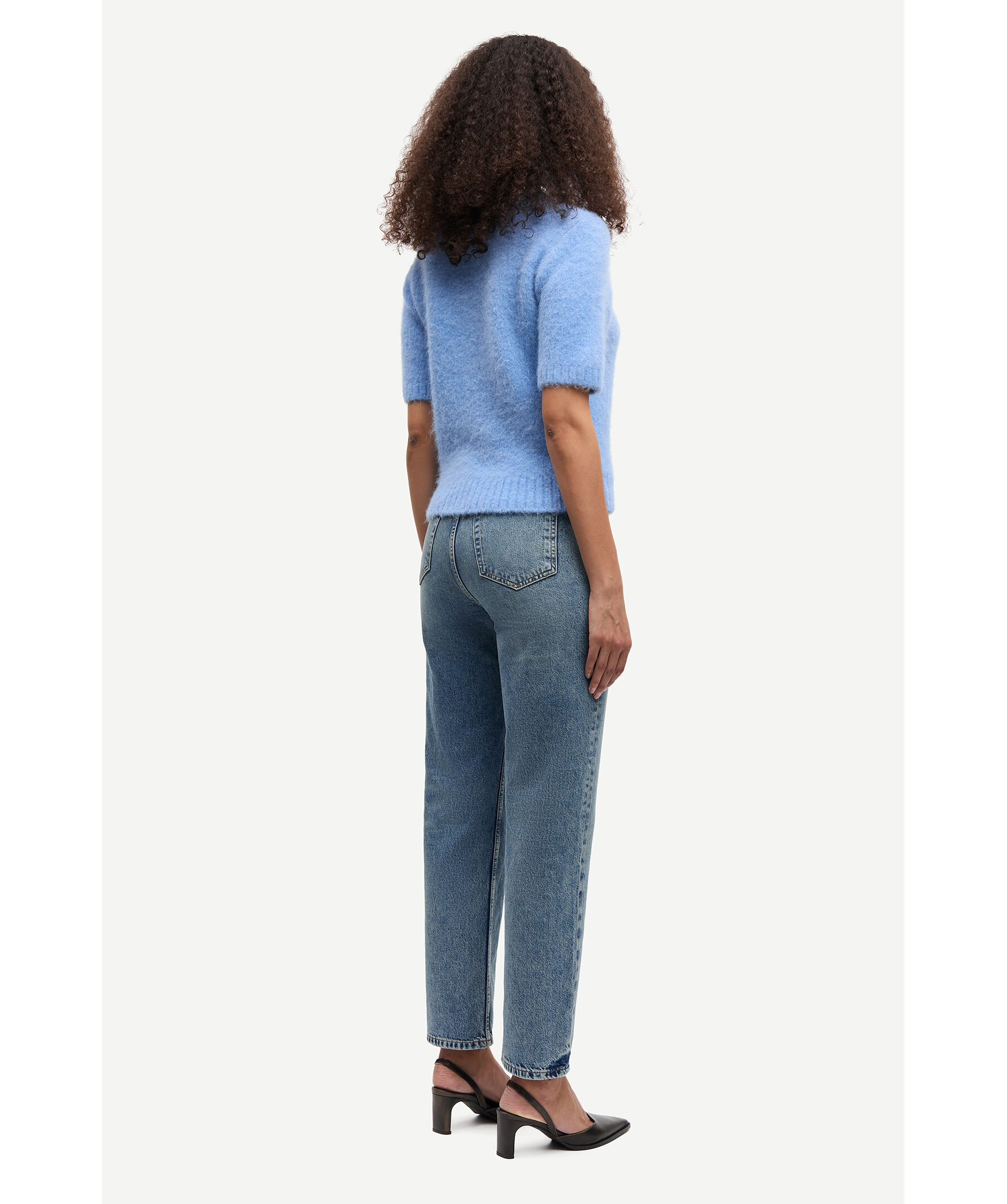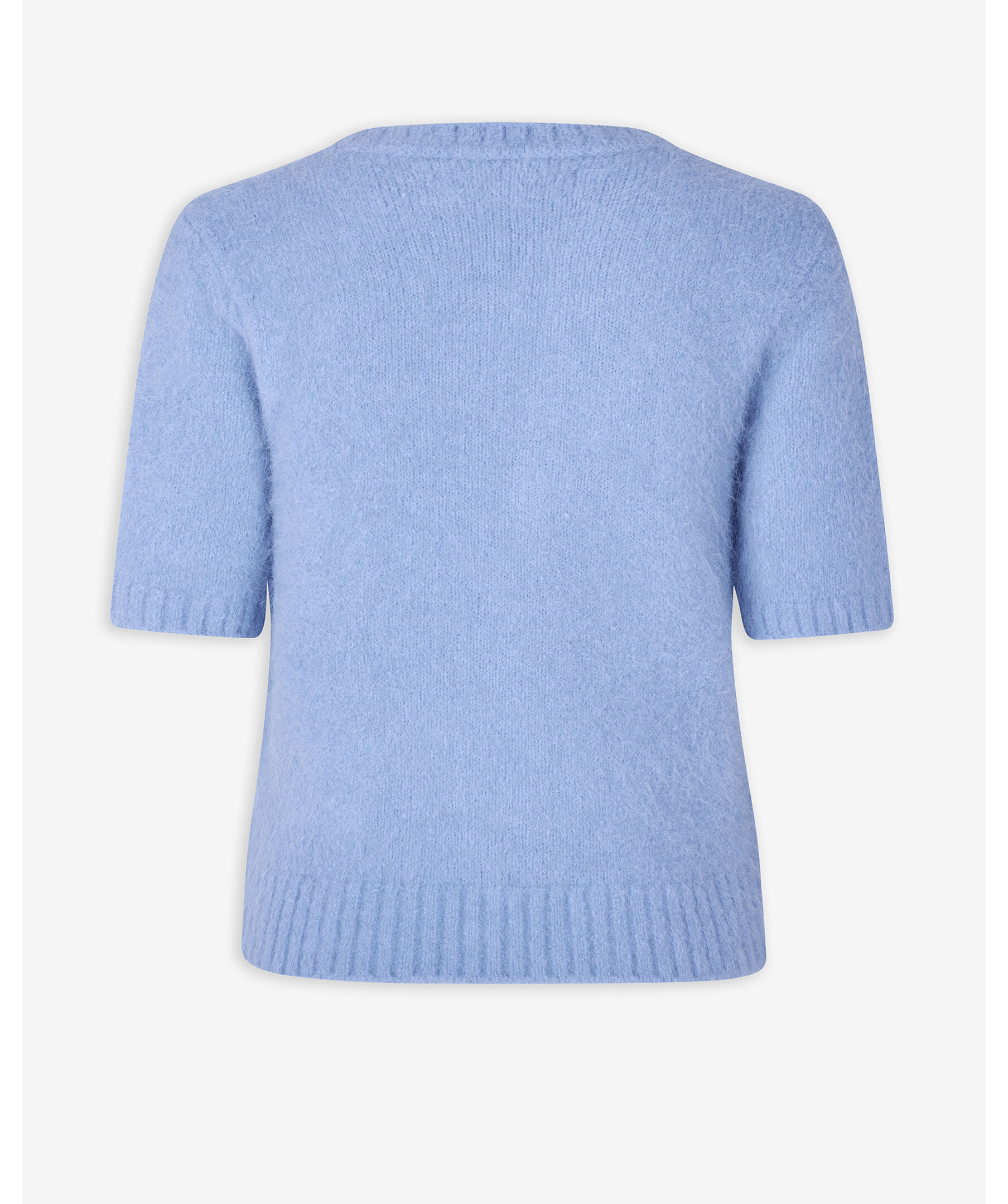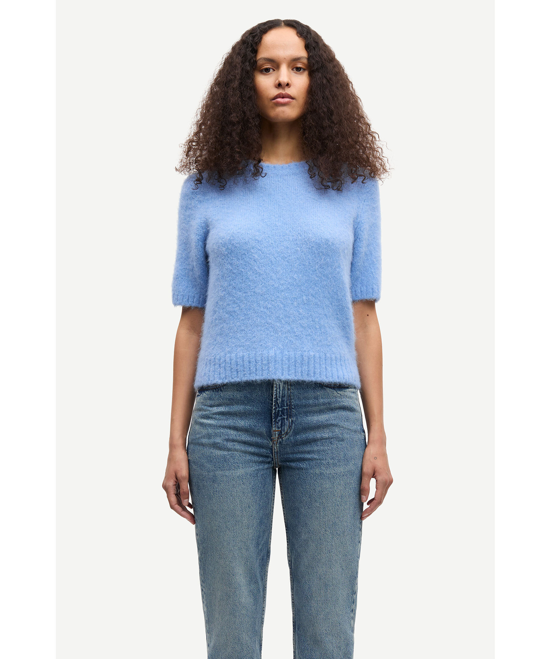 Ljusblå stickad tröja från Samsoe Samsoe. Tröjan har trekvartsärm och en croppad siluett. Ribbstickad rund krage samt ribbstickade ärm- och tröjavslut. Borstad look och tillverkad av en elastisk blandning med alpacka. Modellen har på sig strl S.