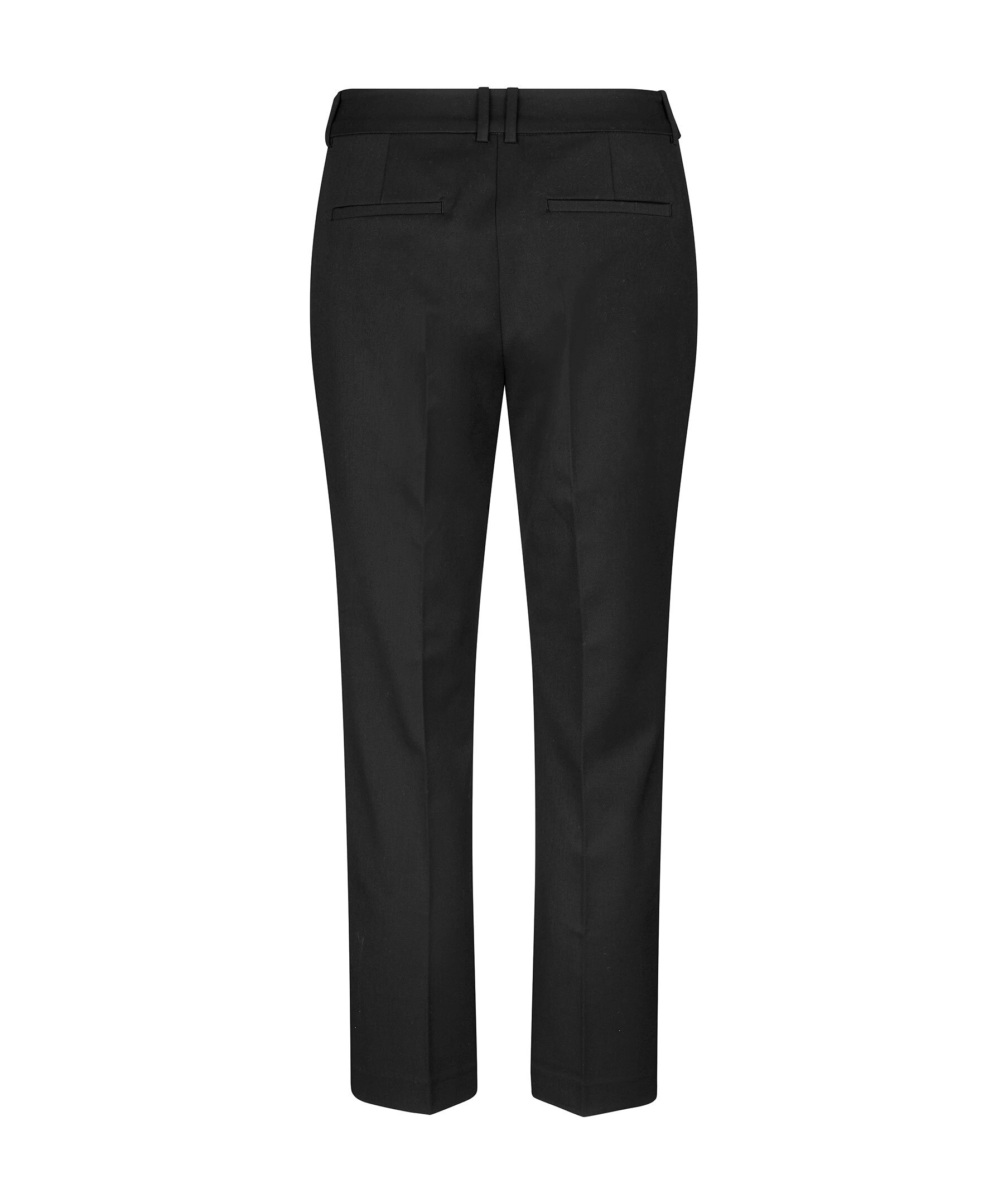 Svarta kostymbyxor från Samsoe Samsoe. Byxorna har en smal passform, bälteshällor i midja, dold knapp och dragkedja vid gylf, sidfickor samt falska passpoalfickor baktill. Pressade veck fram och bak. Huvudmaterial tillverkat av en elastisk blandning av återvunnen polyester.