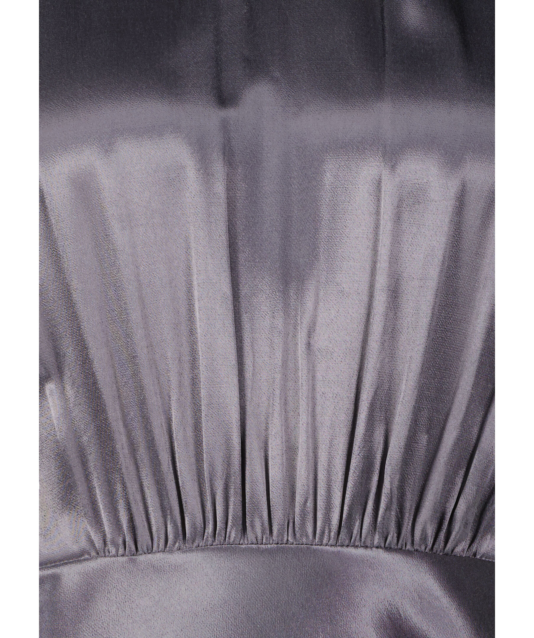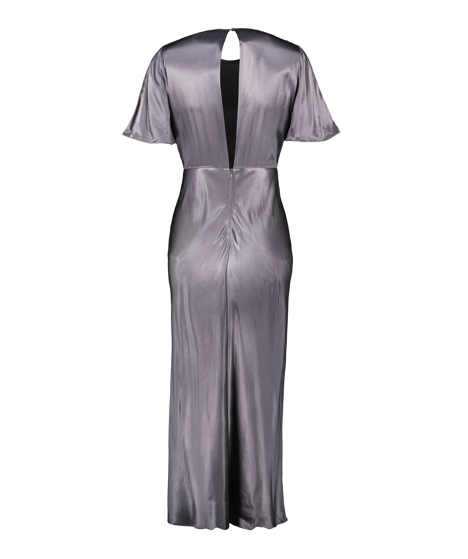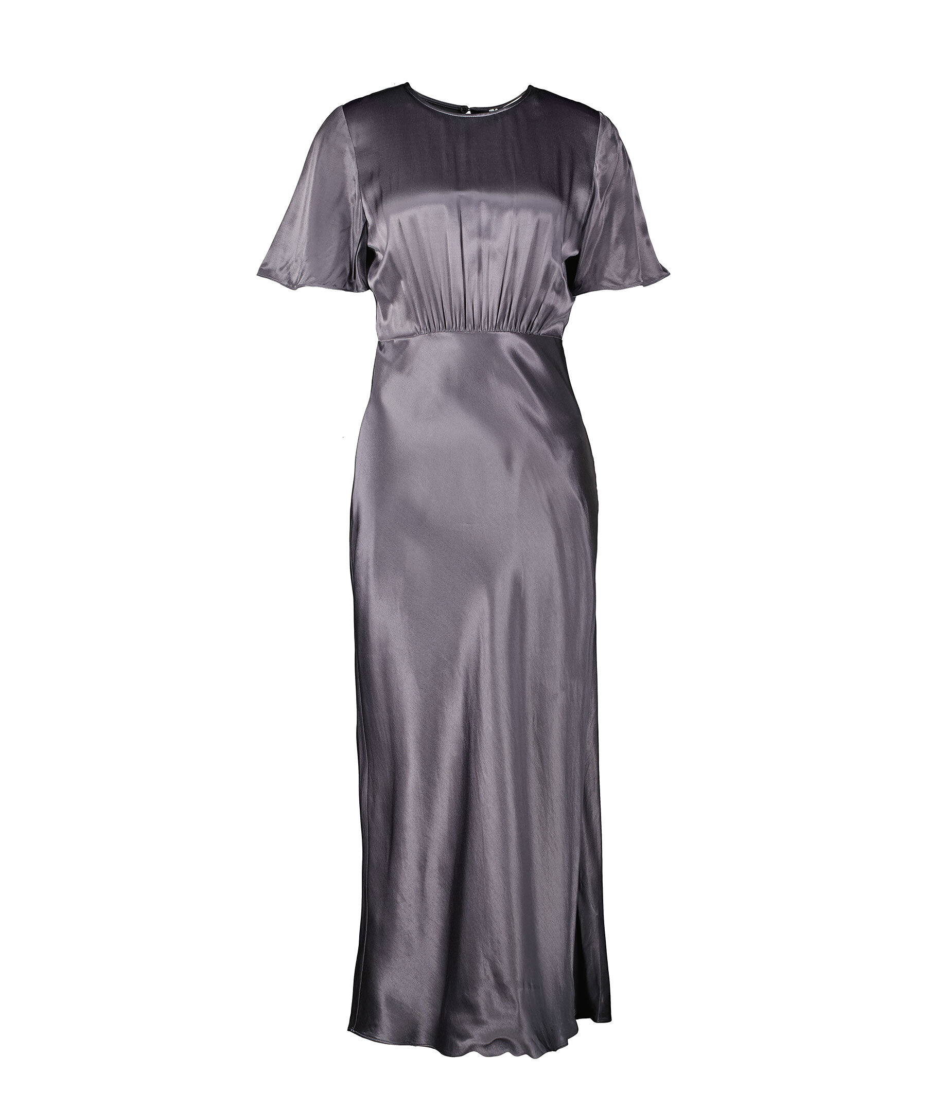 Mörkgrå, kortärmad maxiklänning i satäng från Samsoe Samsoe. Klänningen har knapp och ögla samt osynlig dragkedja på baksidan och rund hals och slits baktill. Tillverkad i en viskosblandning.