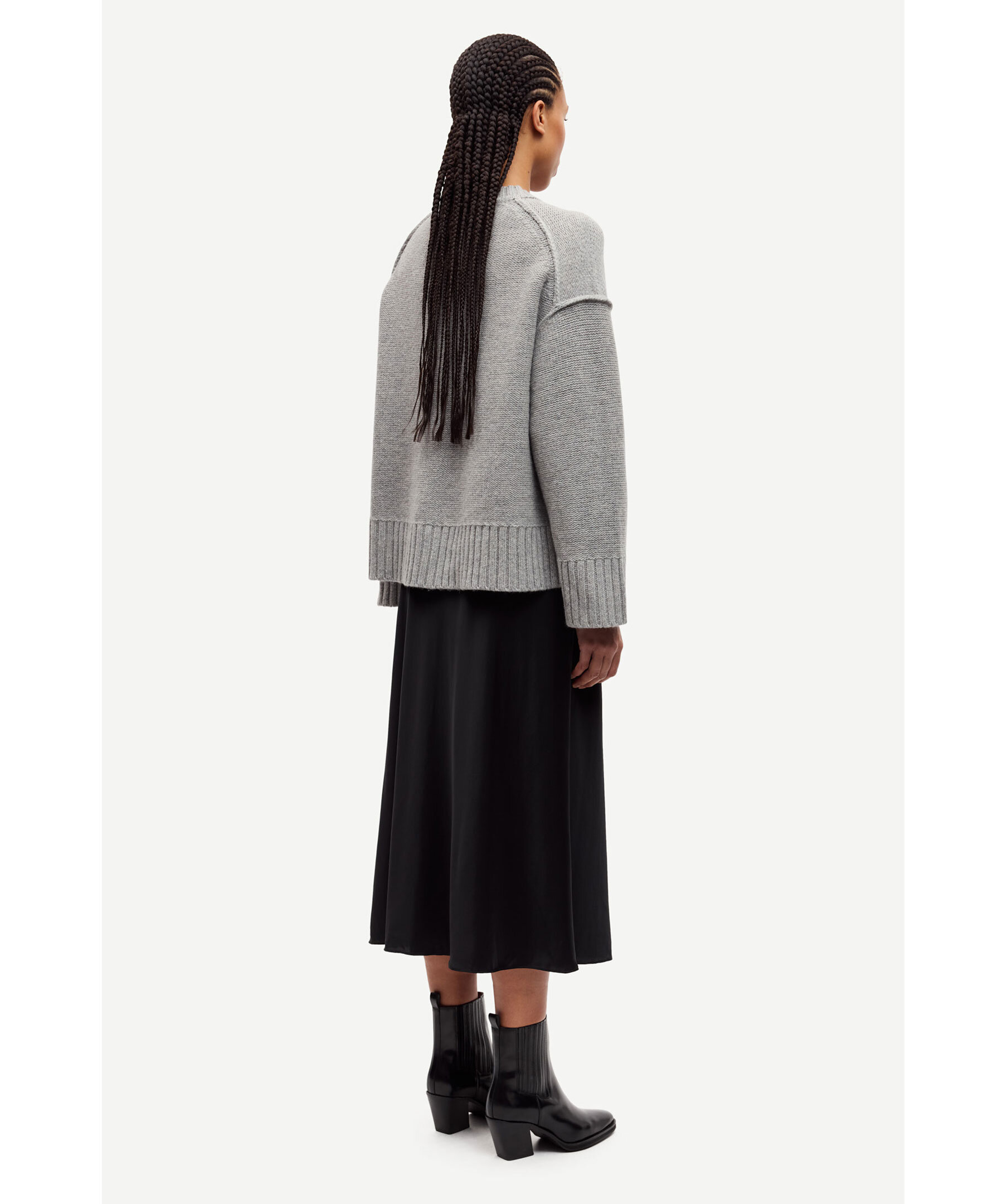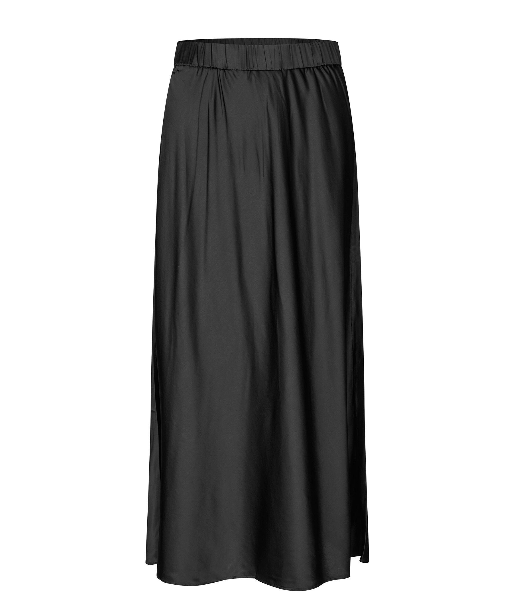 Svart midikjol i satin med från Samsoe Samsoe. Kjolen har en melanhög midja med resår. Tillverkad i en viskosblandning.
