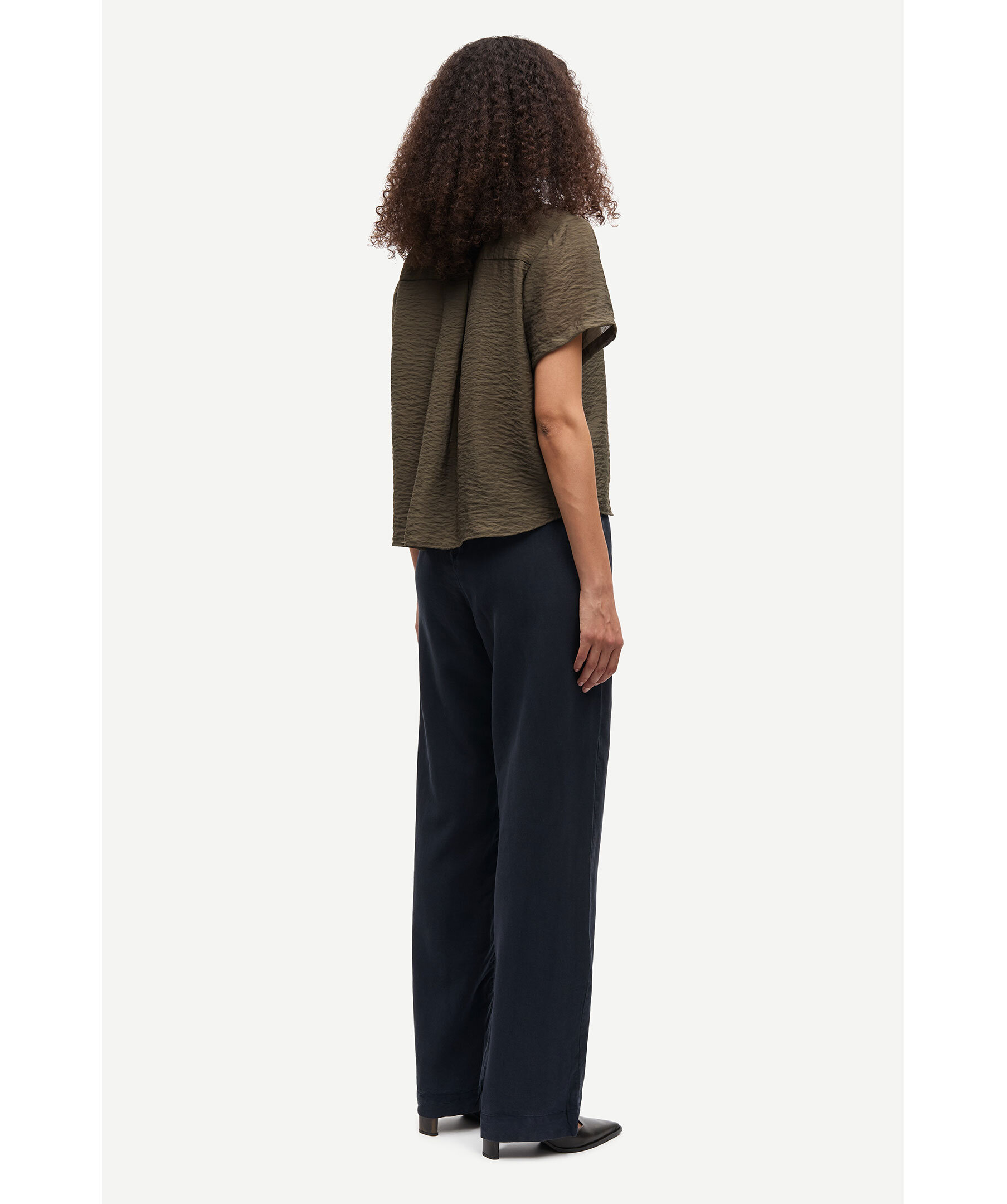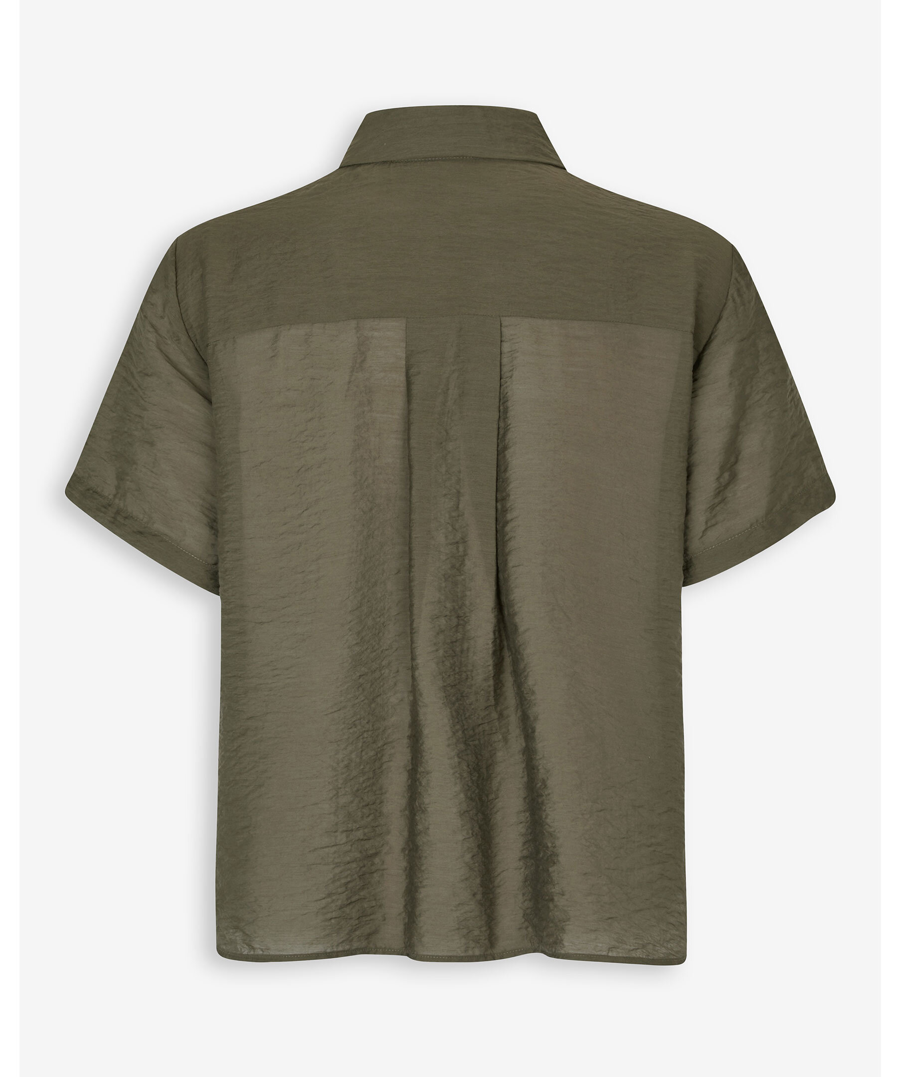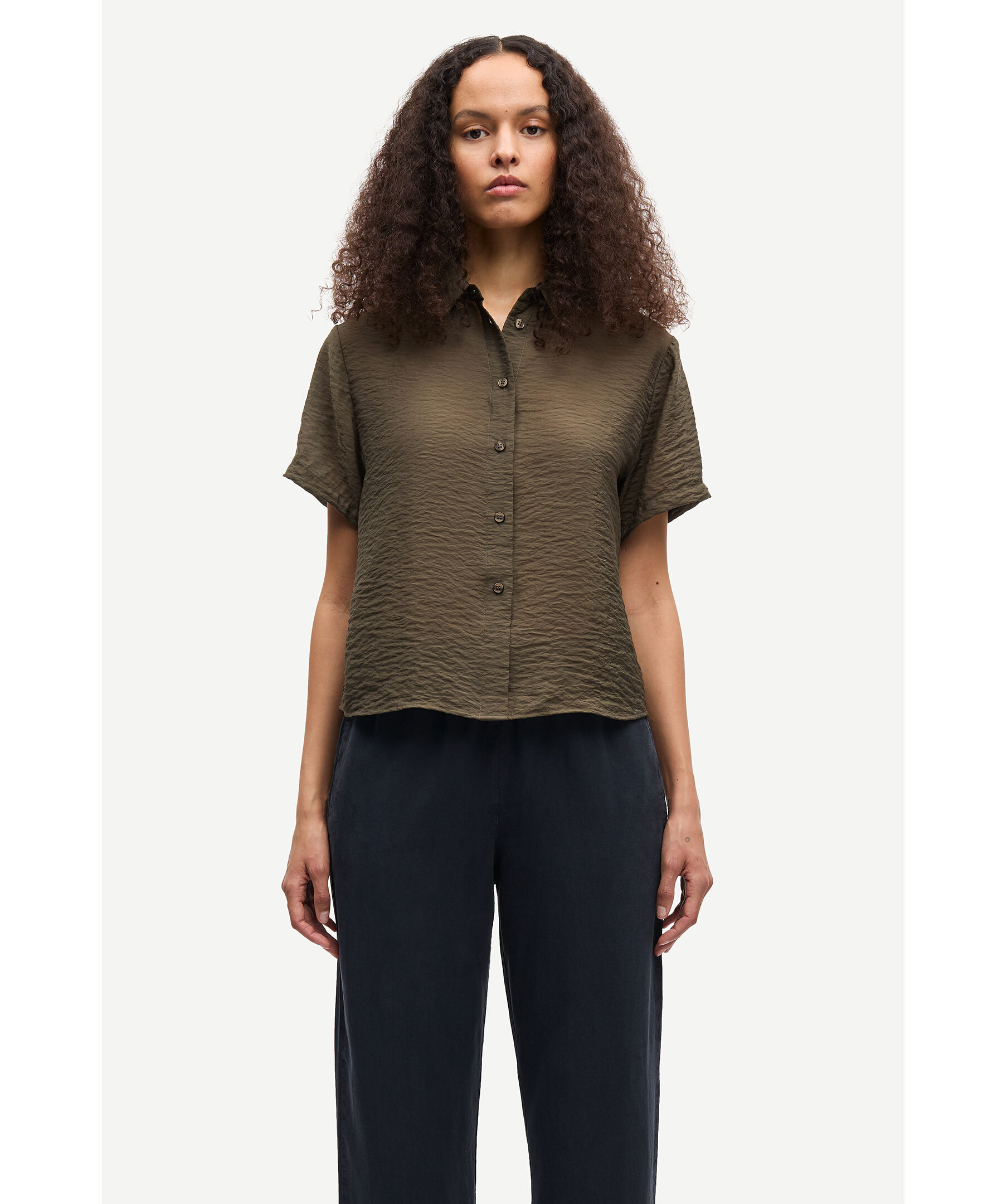 Mörkgrön, kortärmad skjorta från Samsoe Samsoe. Skjortan stängs med knappar framtill och har ok med veck i nacken. Tillverkad i en TENCEL™ Modal och silkblandning.