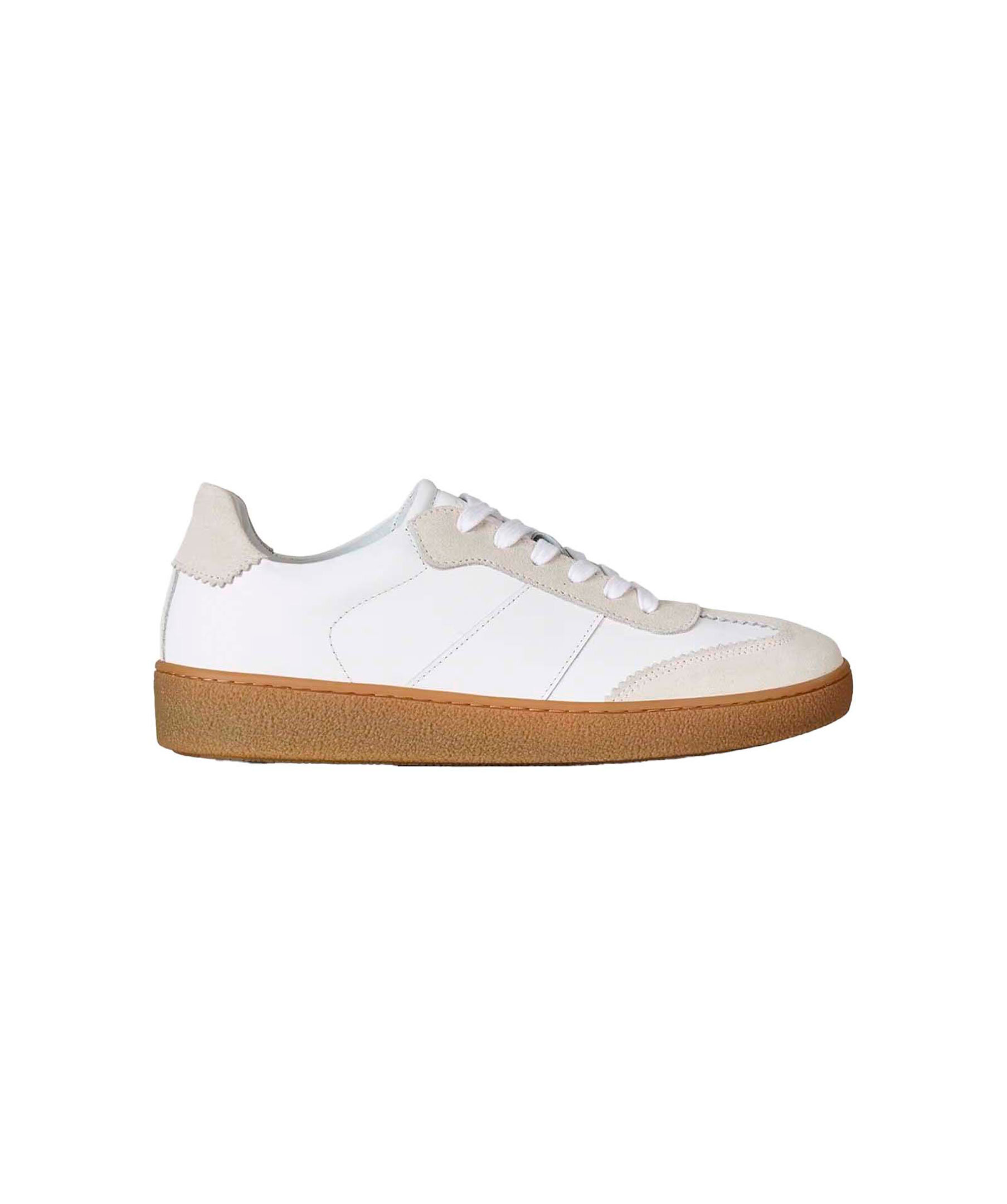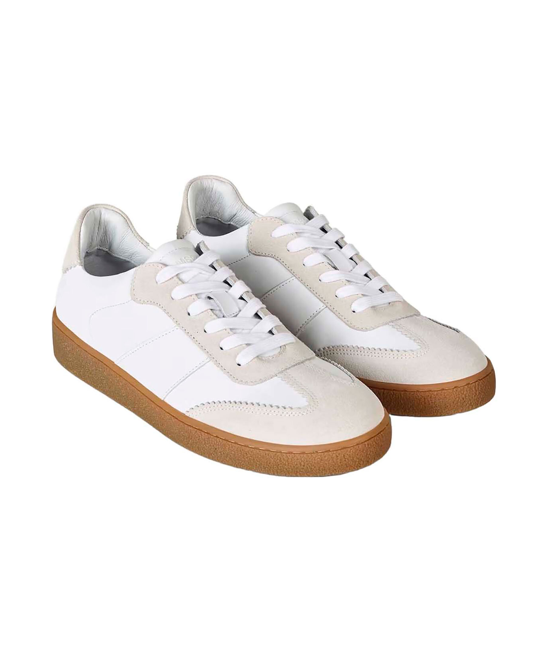 Vita och beigea sneakers i läder och mocka från Samsoe Samsoe. Skorna har kontrasterande gummisula, platta skosnören samt logotyp på plösen.