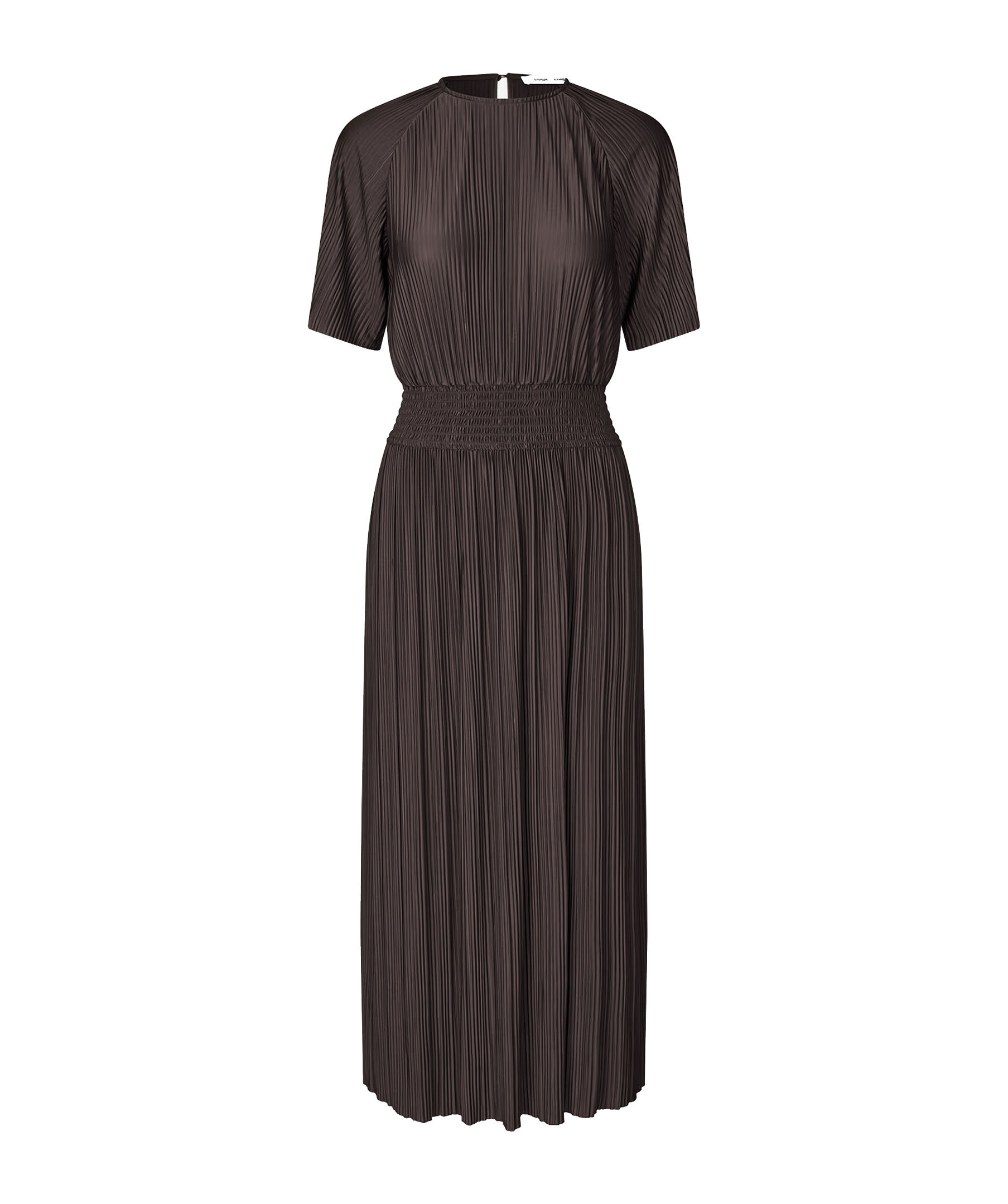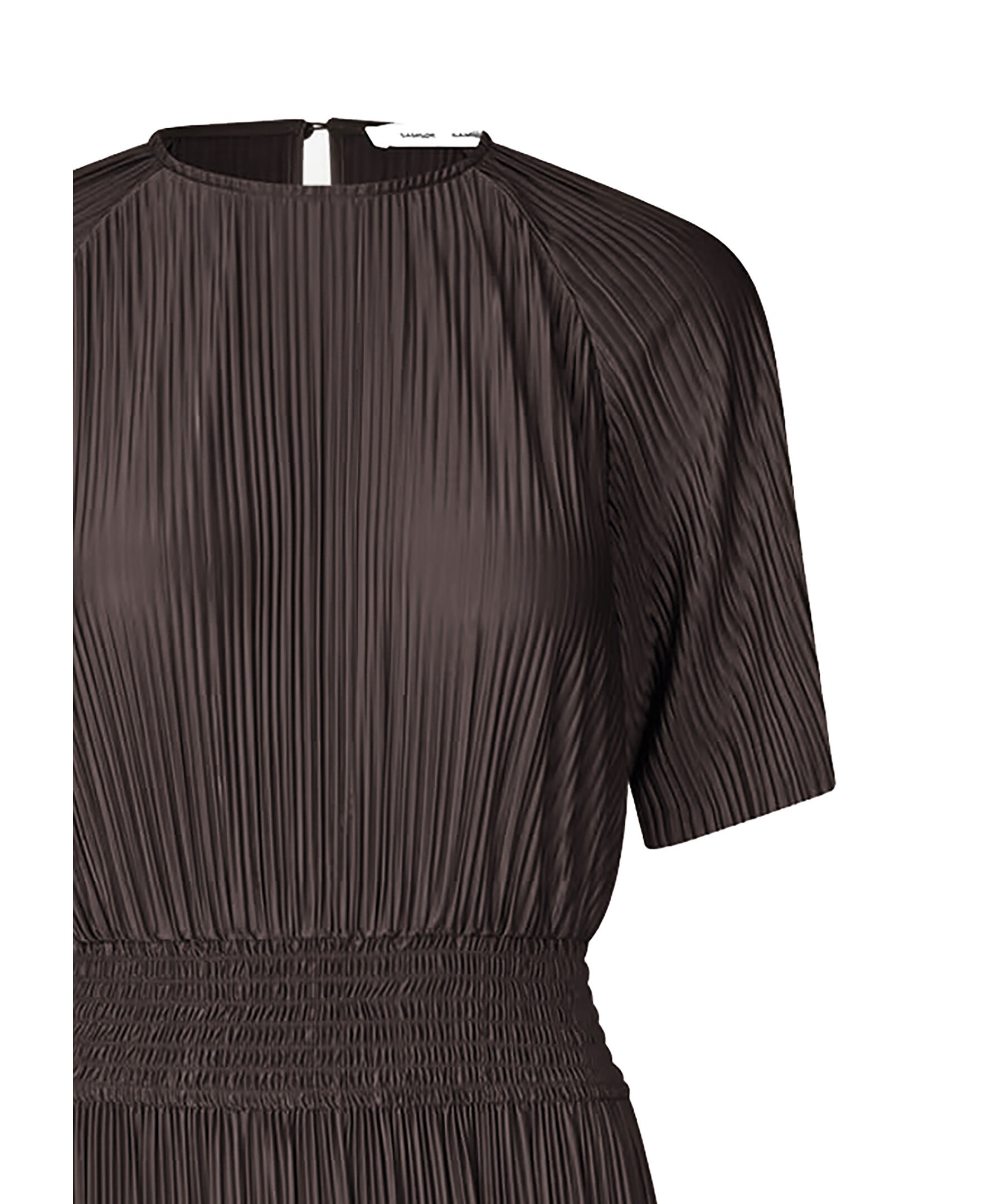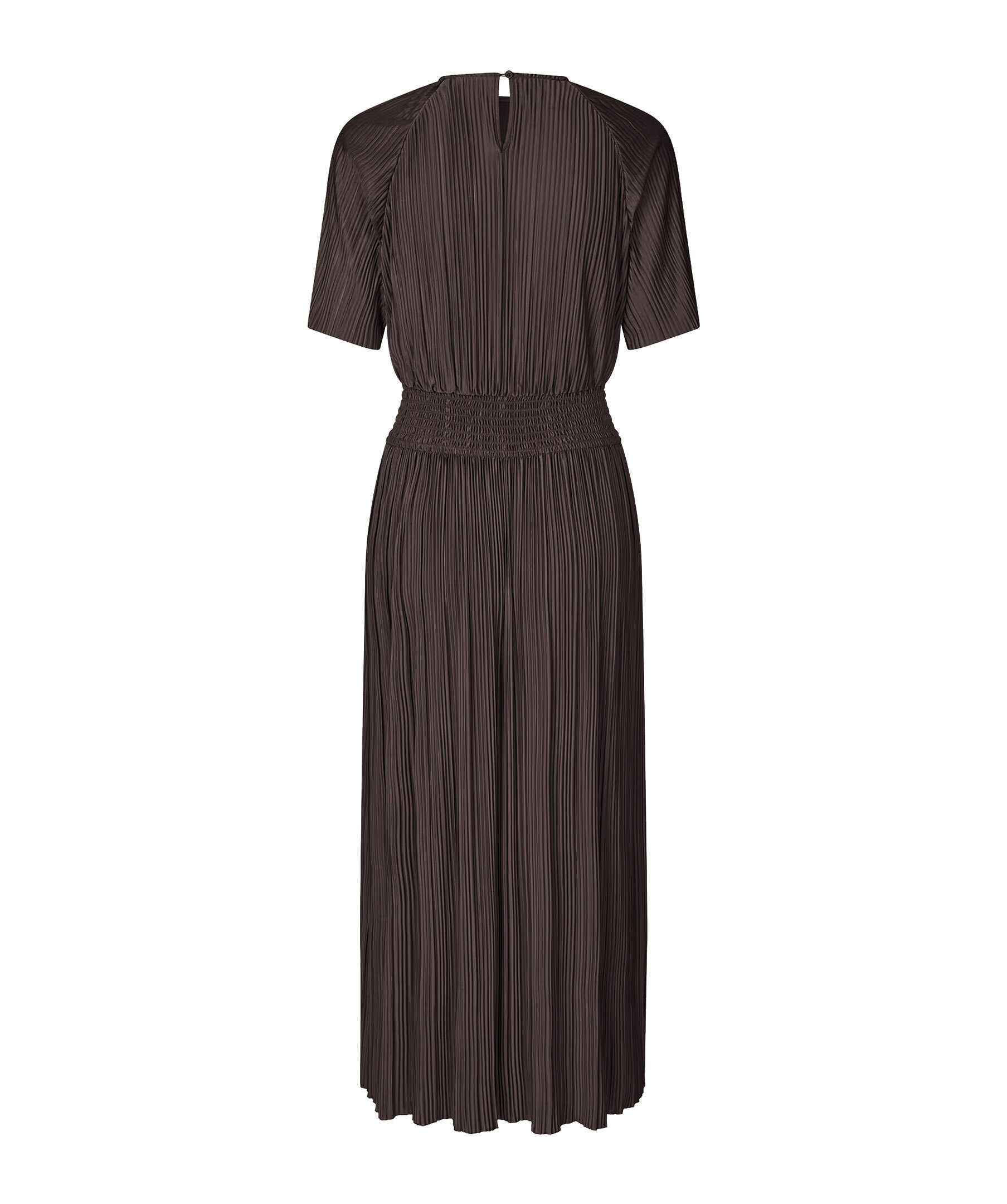 Mörkbrun plisserad klänning som slutar vid vaderna från Samsoe Samsoe. Klänningen är kortärmad och har en A-linjeformad kjol, resår och knappknäppning baktill samt smockad resår i midjan. Tillverkad i en polyesterblandning.