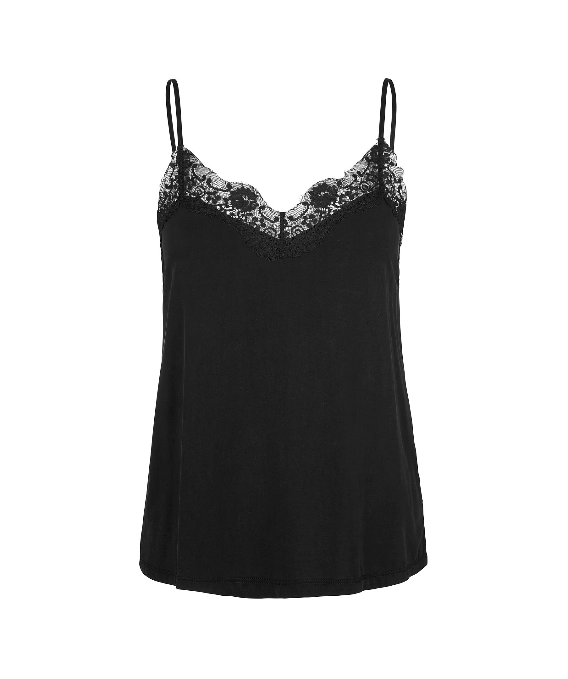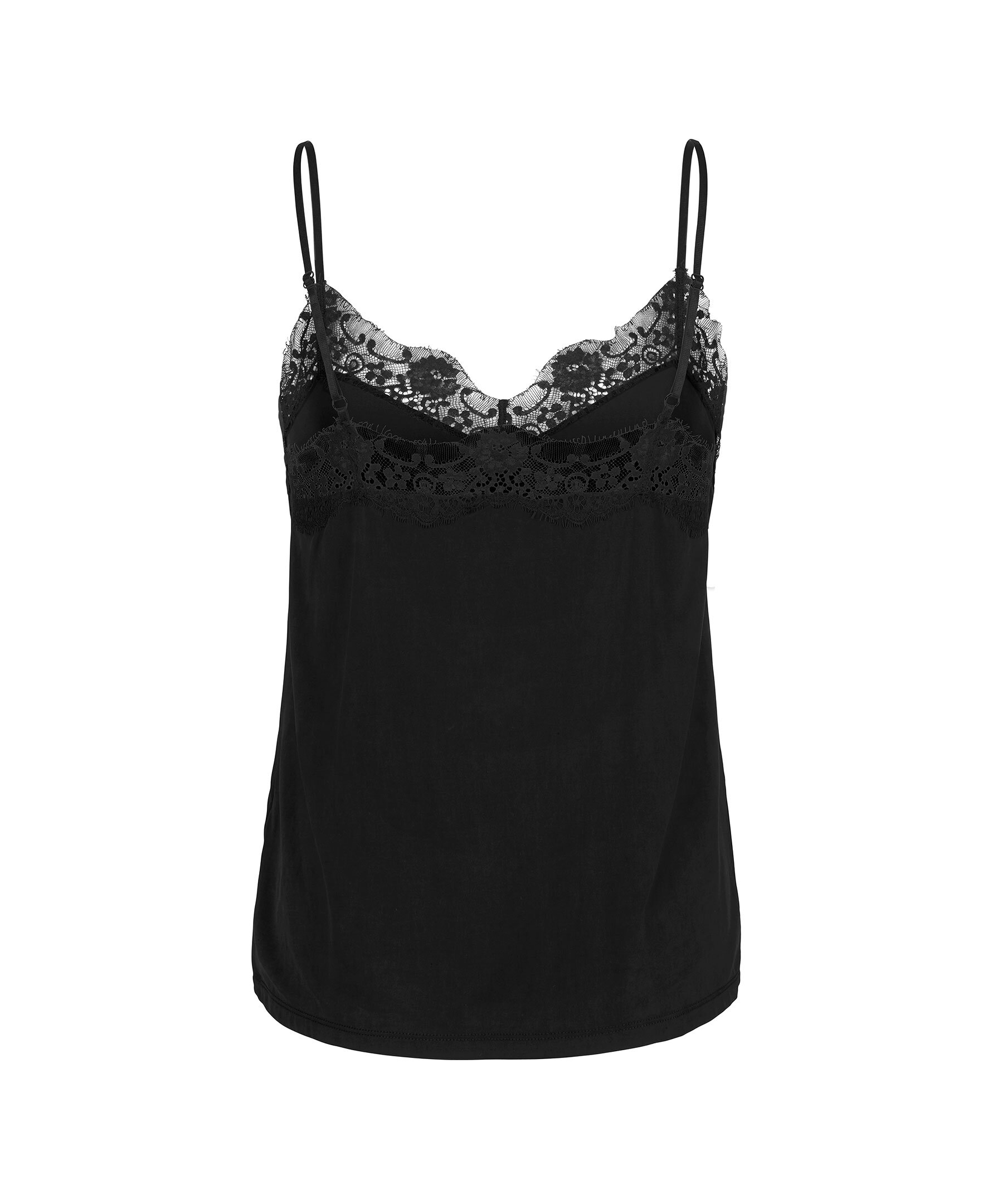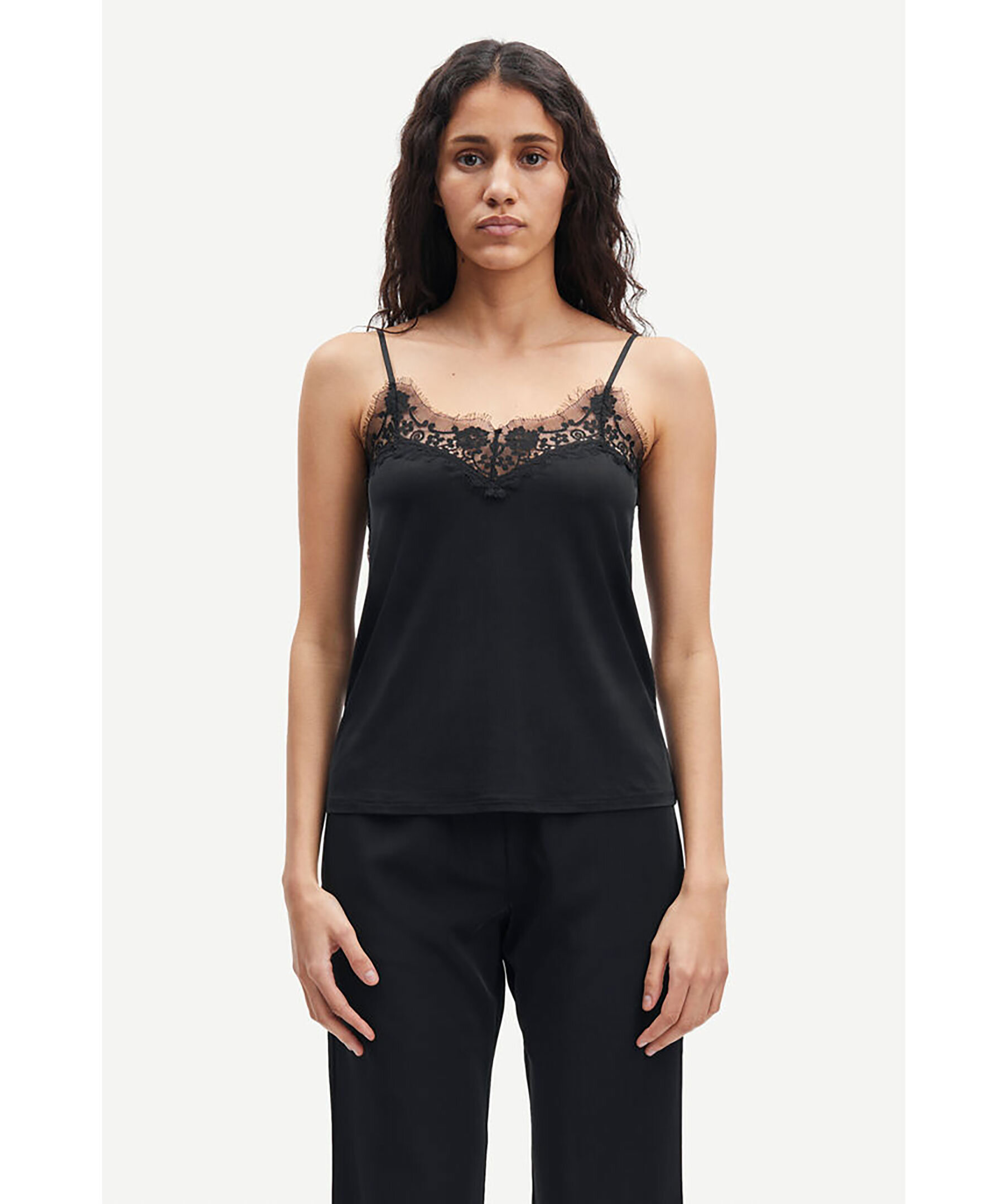 Svart linne tillverkat i ett vackert, draperande jerseytyg från Samsoe Samsoe. Designen har justerbara, smala band och spetskantad halsringning både fram och bak. Detta linne tillför en touch av boudoir-chic till din stil.