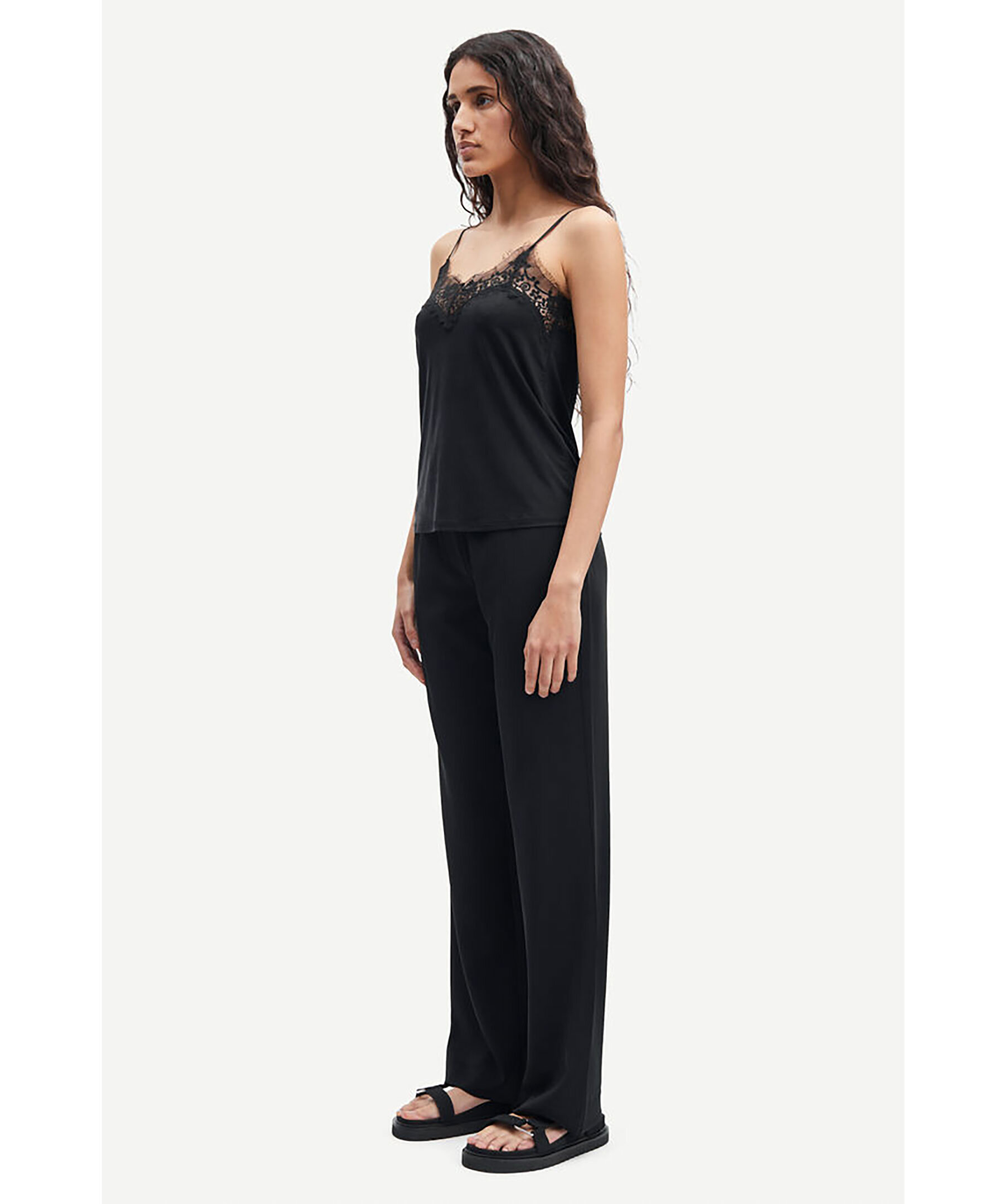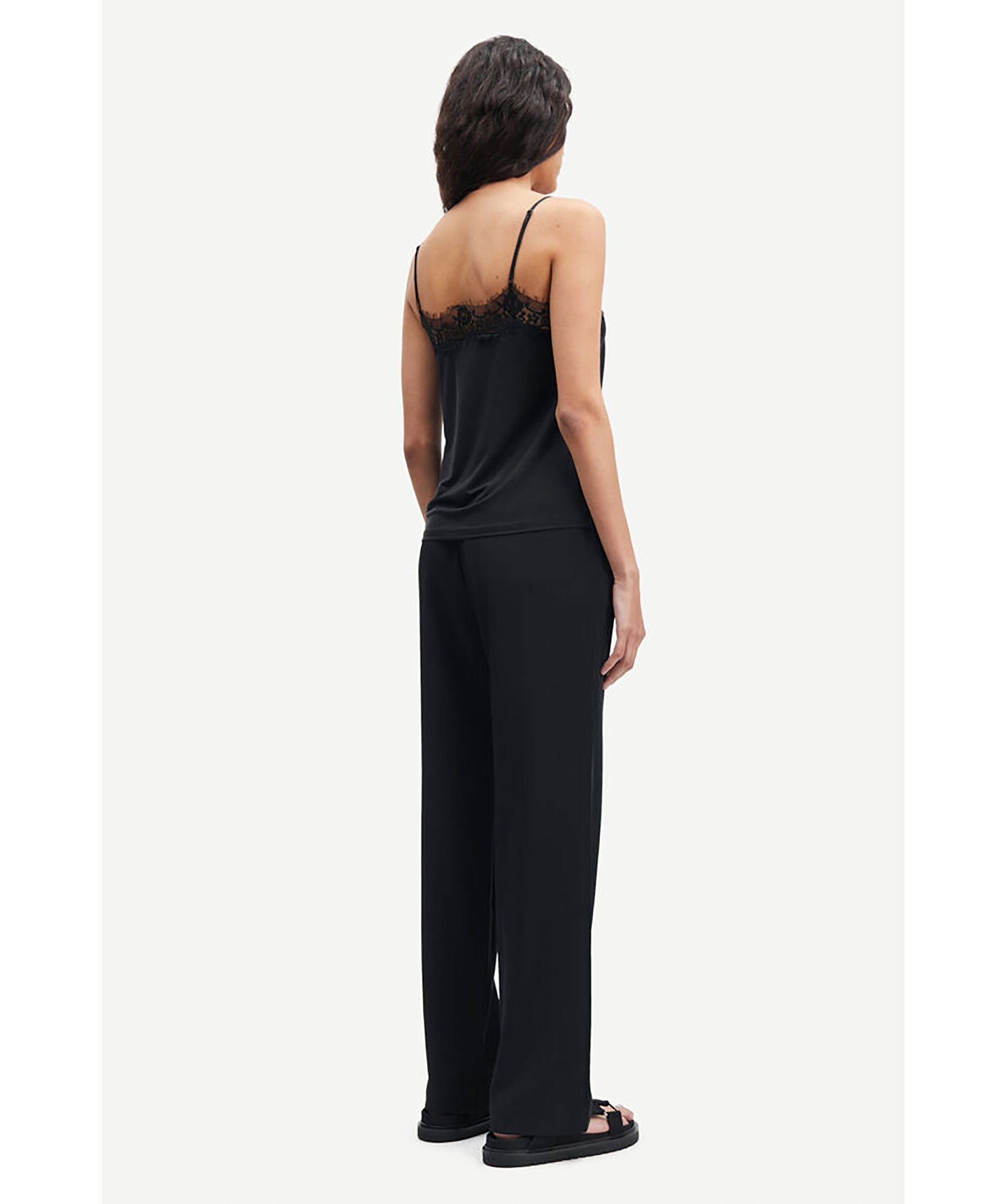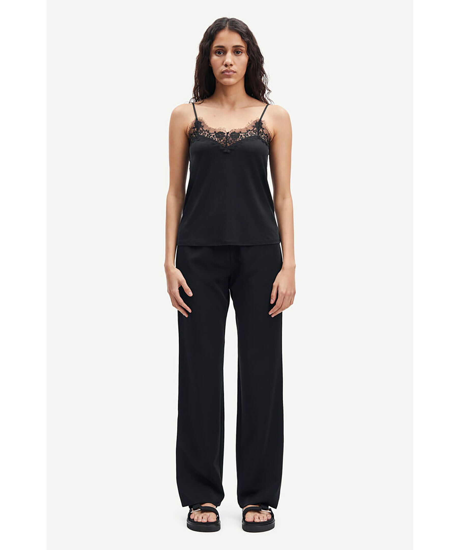 Svart linne tillverkat i ett vackert, draperande jerseytyg från Samsoe Samsoe. Designen har justerbara, smala band och spetskantad halsringning både fram och bak. Detta linne tillför en touch av boudoir-chic till din stil.
