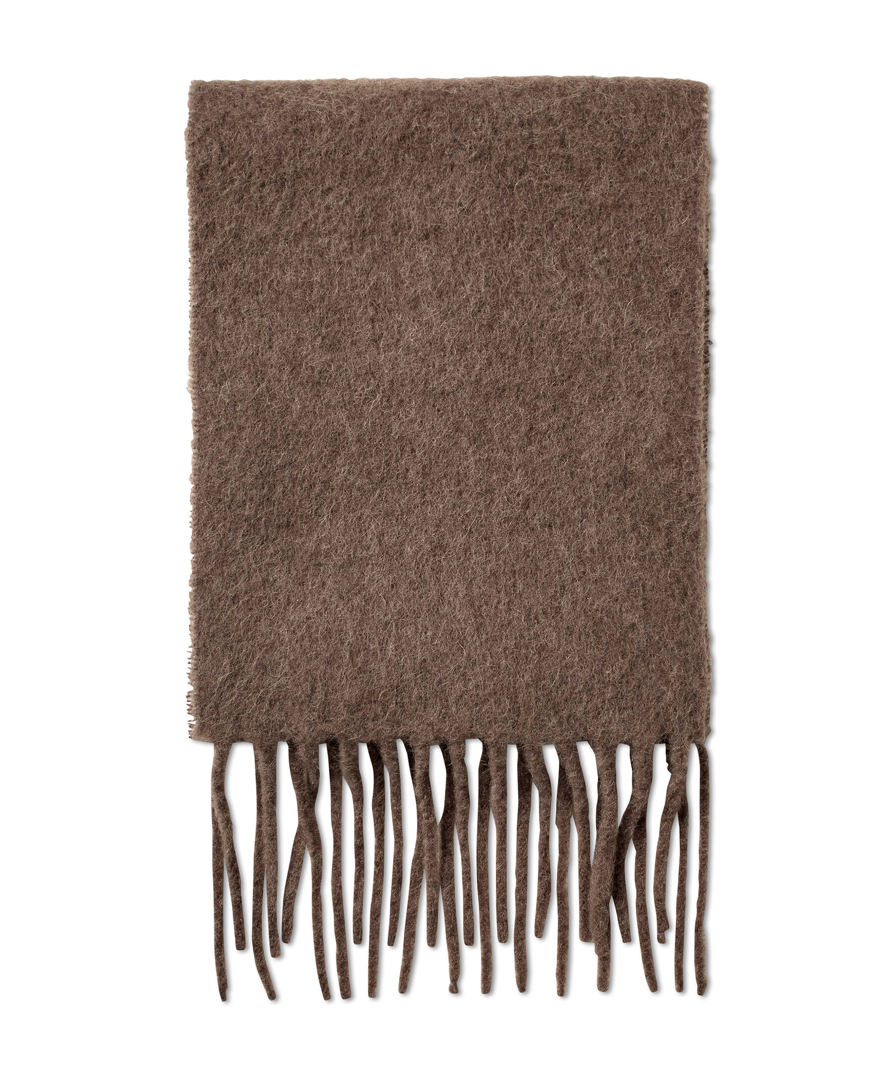 Brun halsduk med fransar från Samsøe Samsøe. Gjord i en mjuk alpackablandning. Halsduken är 25cm bred och 210cm lång utan fransarna.