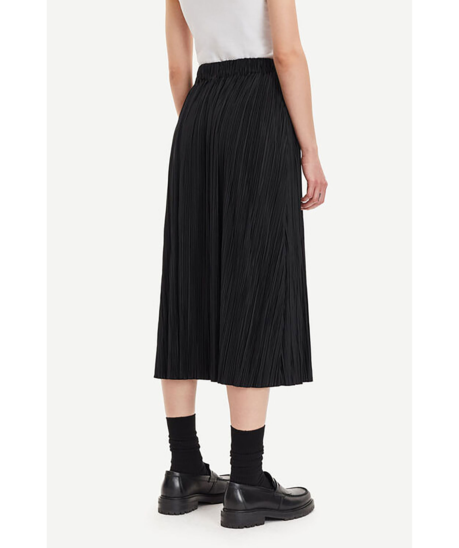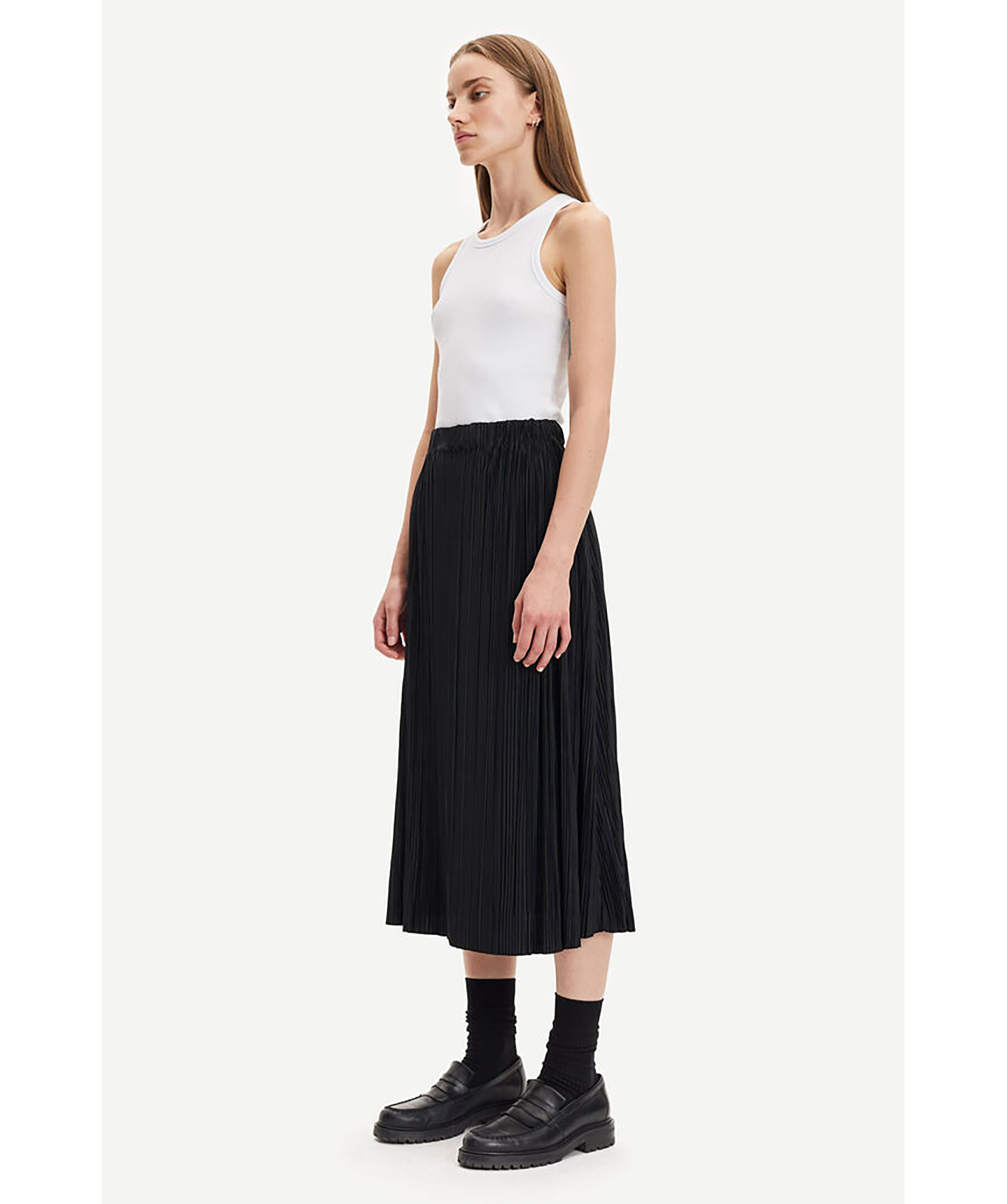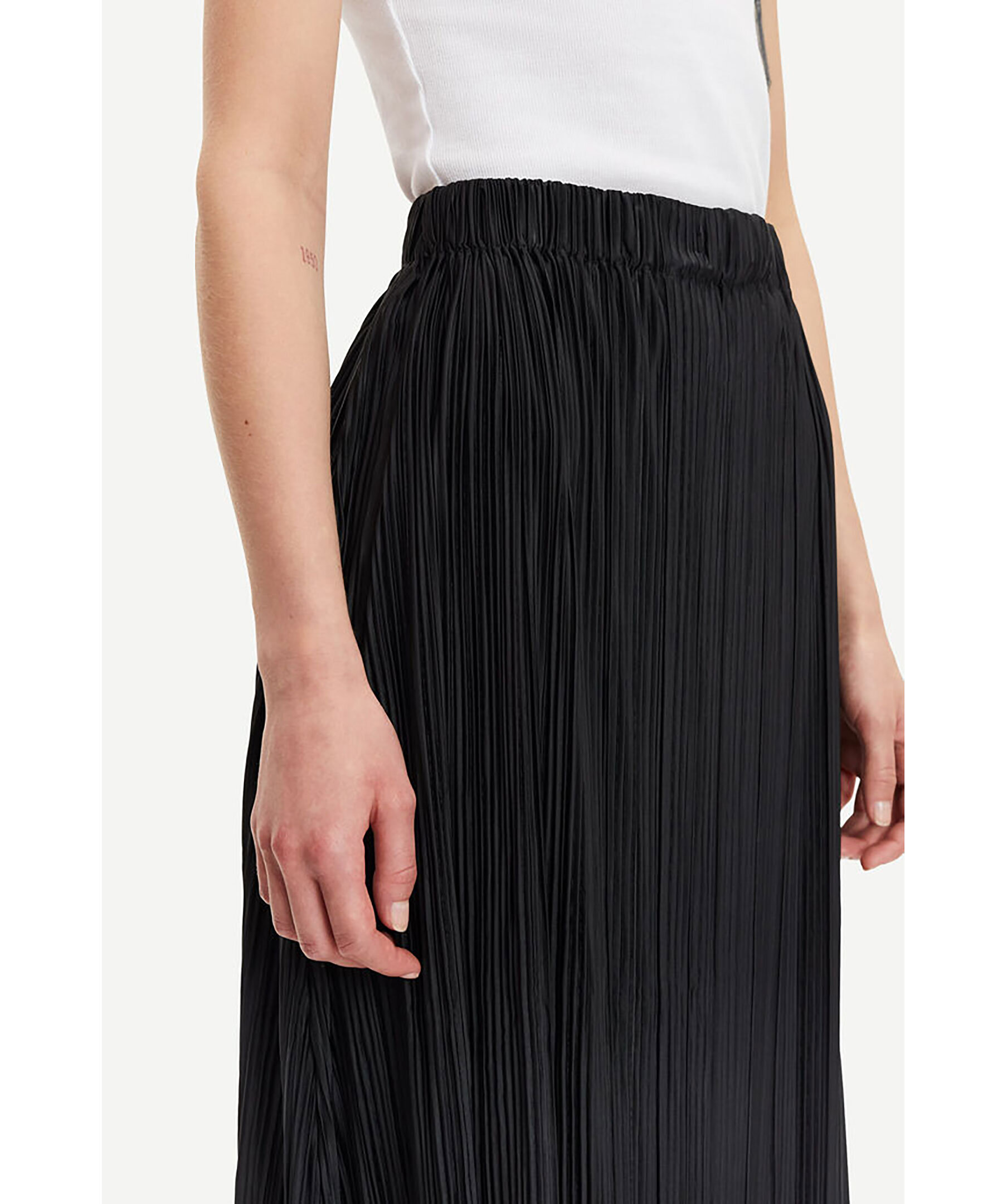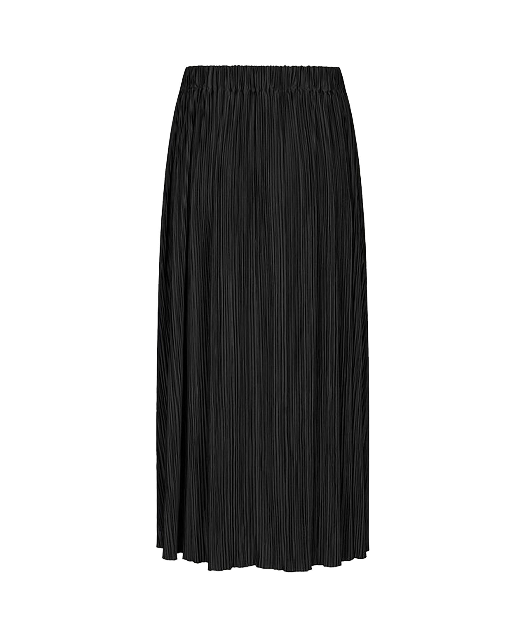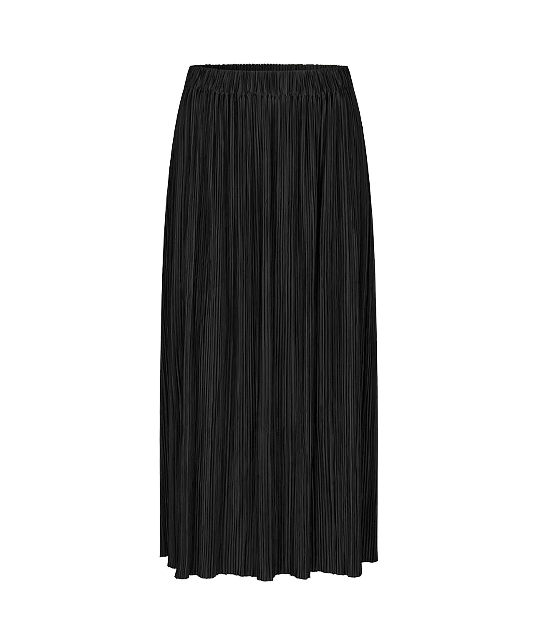 Svart midikjol i finplisserad jersey med normal passform från Samsoe Samsoe. Resår i midjan för bekväm passform. Tillverkad av återvunnen polyesterblandning. Denna produkt är GRS-certifierad och uppfyller strikta sociala, miljömässiga och kemiska krav i alla steg av leveranskedjan.