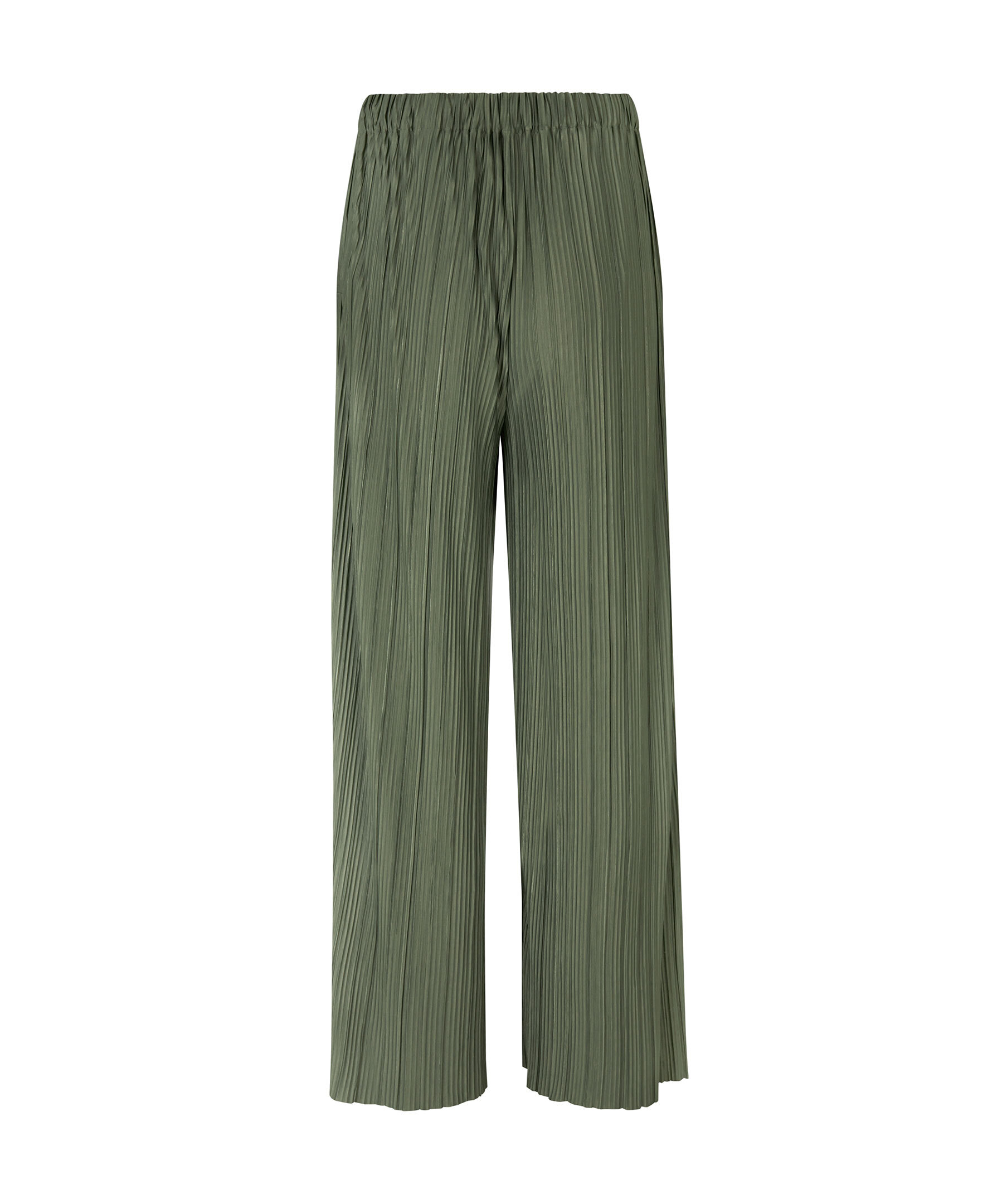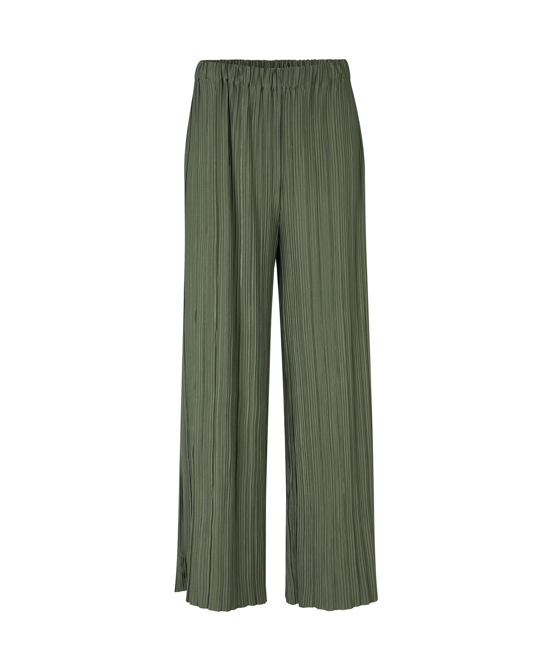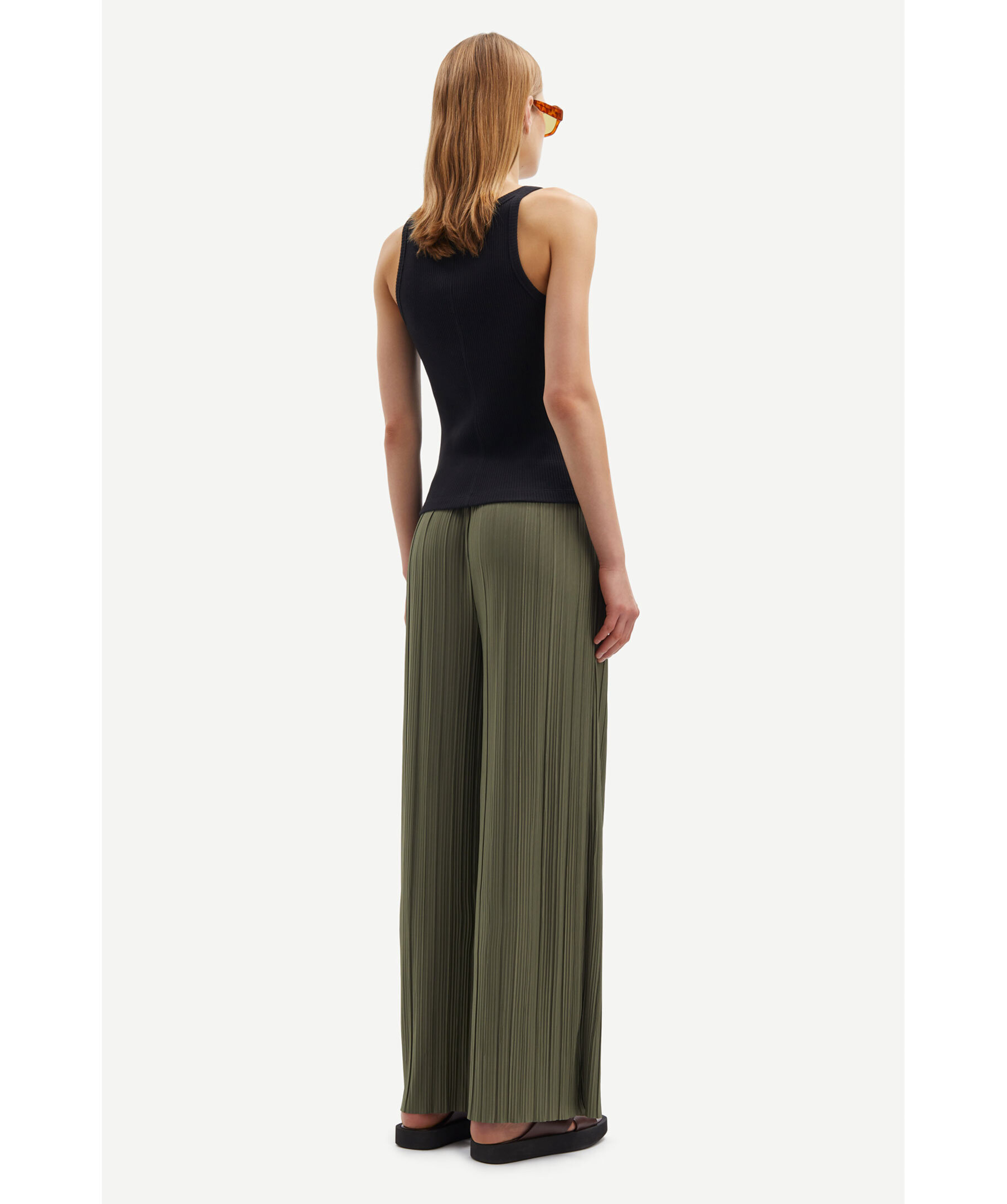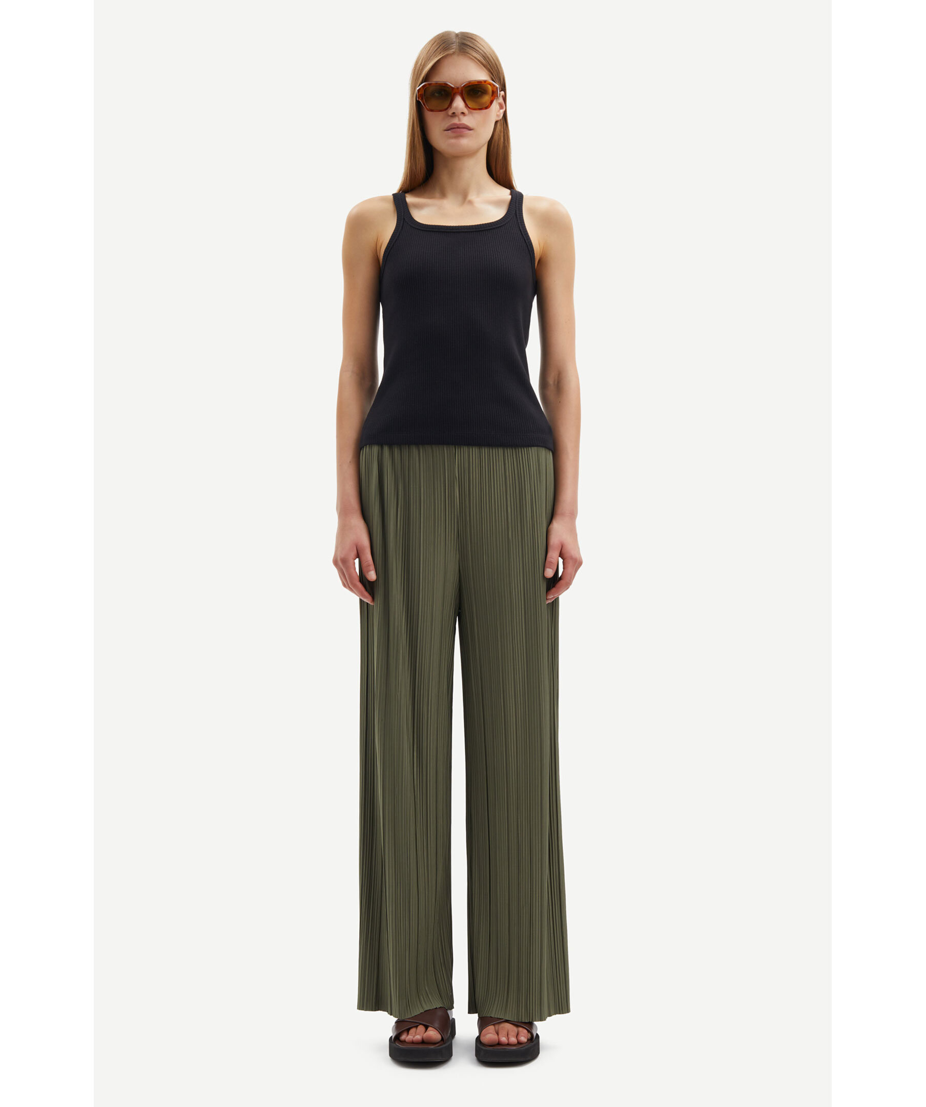 Skogsgröna plisserade byxor från Samsoe Samsoe. Elastiskt resår band vid byxornas midja. Två fickor framtill.