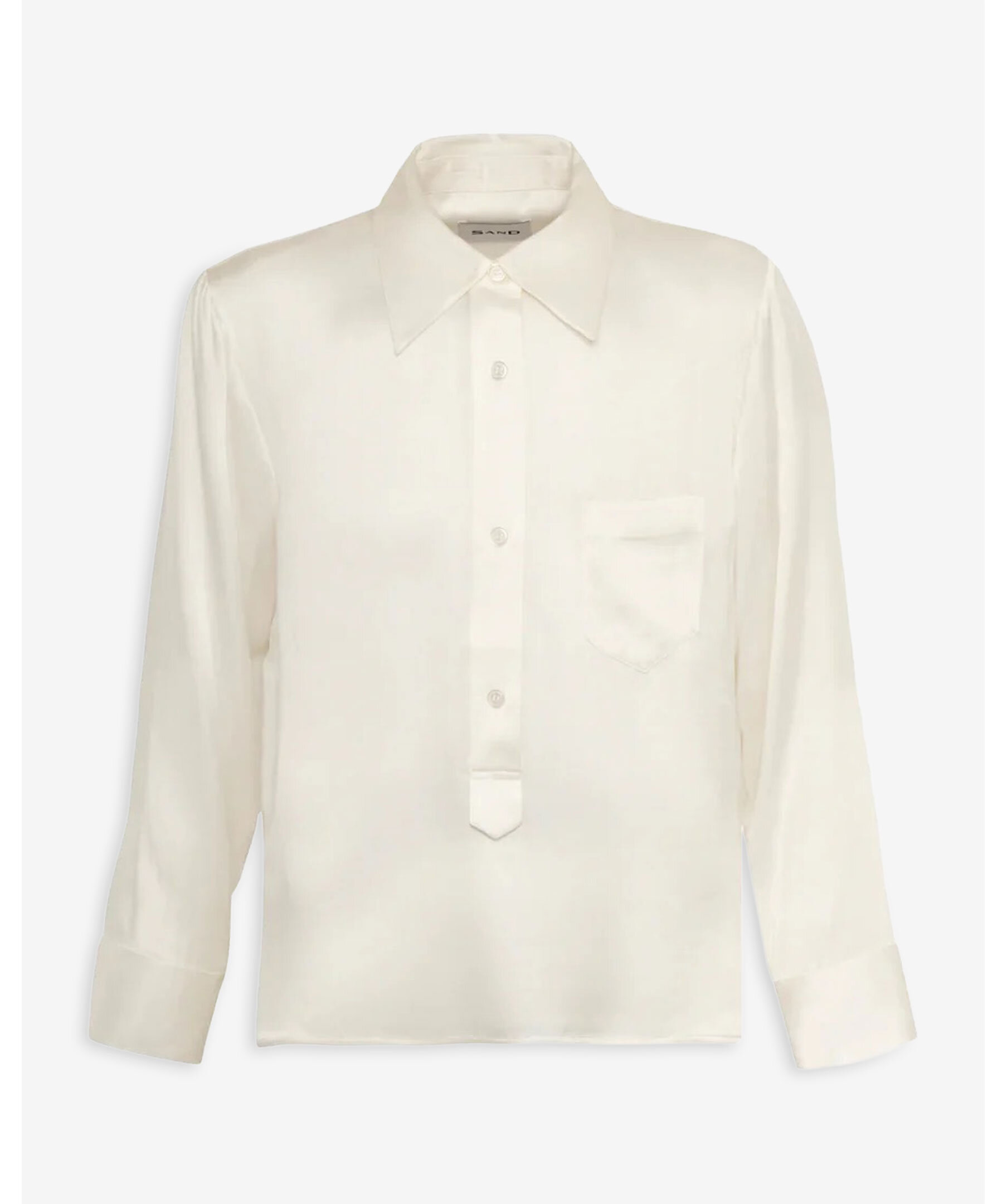 Vit sidenblus “Matt Nepeta” från SAND. Blusen har en rak modell med krage, knappslå fram och en bröstficka. Ärmarna är långa och avslutas med bred manschett. En tidlös, elegant blus som passar lika bra till vardag som till mer uppklädda tillfällen.