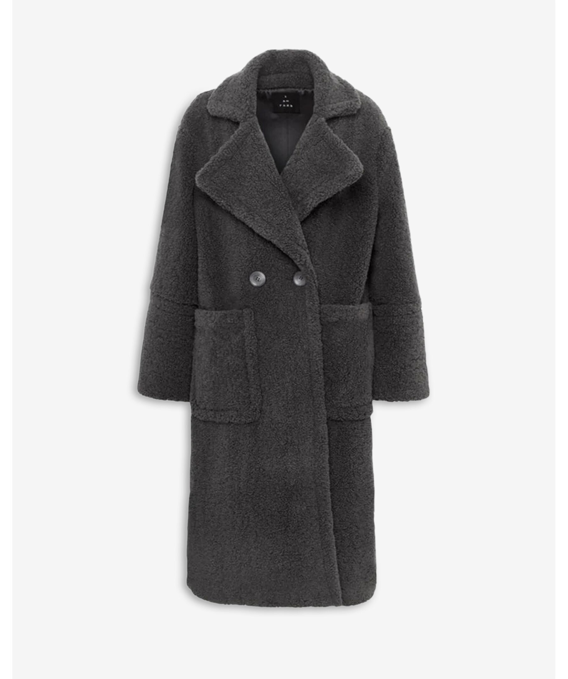 Lång teddy-kappa i grafitgrått från SAND Copenhagen med exklusiv faux-shearling-struktur. Kappan har en dubbelknäppt front, stor krage och generösa fickor fram som ger både stil och funktion. Det fluffiga teddy-tyget skapar en lyxig look samtidigt som det håller dig varm under kyligare dagar.