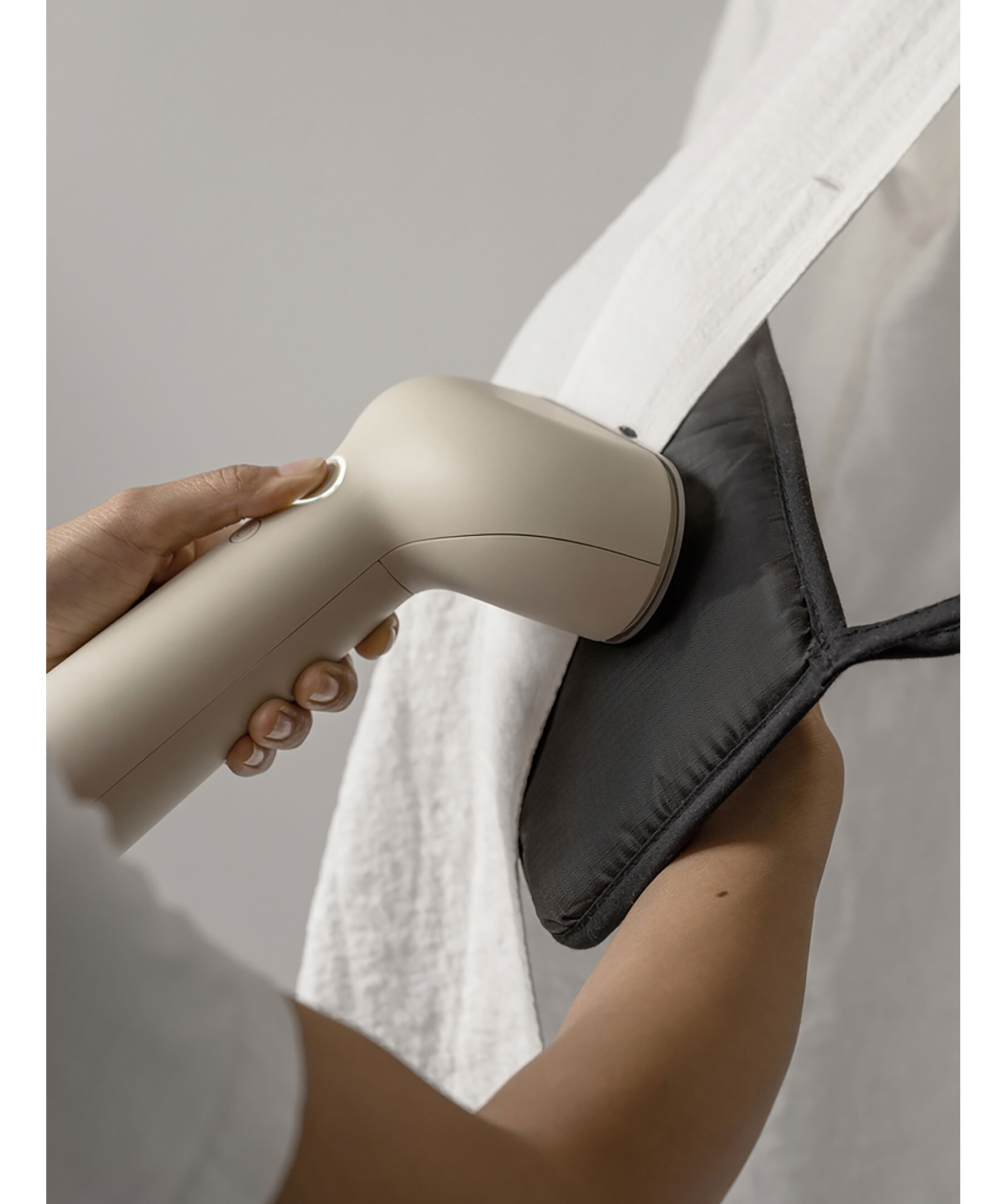 Sandfärgad hand-steamer från Steamery Stockholm. Cirrus 3 Iron Steamer är en hybrid mellan en steamer och ett strykjärn. Den varma ångan reducerar dålig lukt och dödar bakterier. Tillkommer en bärbar strykningshandske. Energisnål, kräver endast 1000W. Vattentanken rymmer 90 ml. Steamerns mått 24,65x14x8 cm. Vävd sladd: 2,3 m.