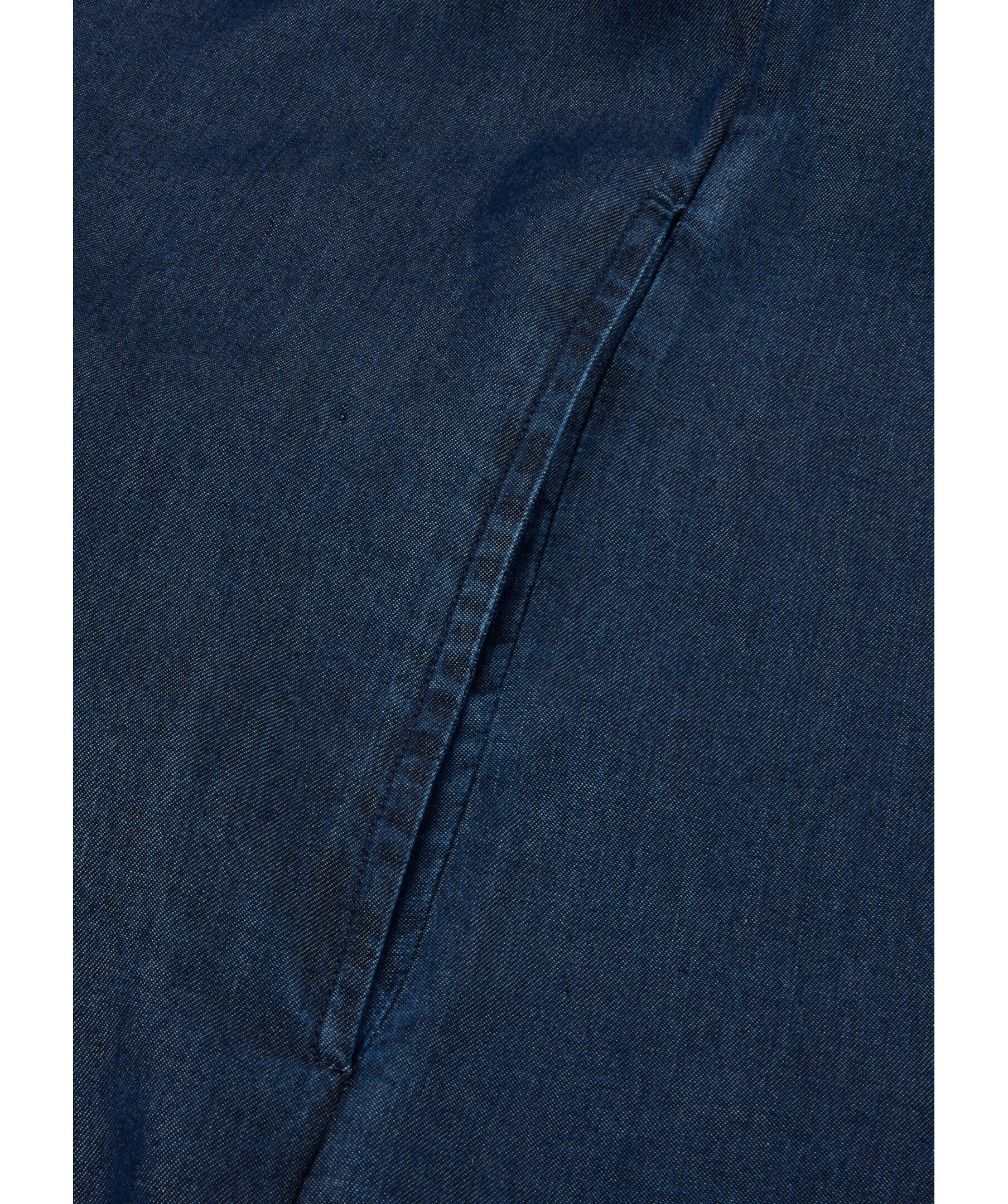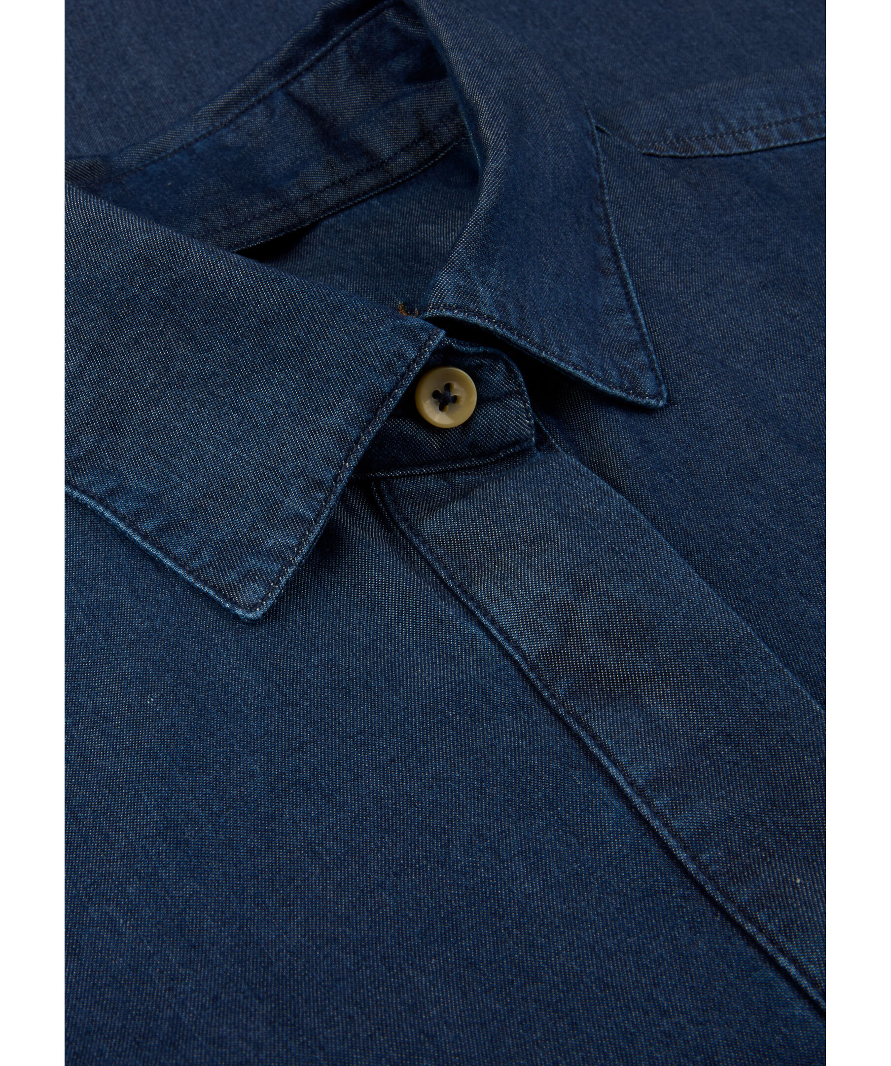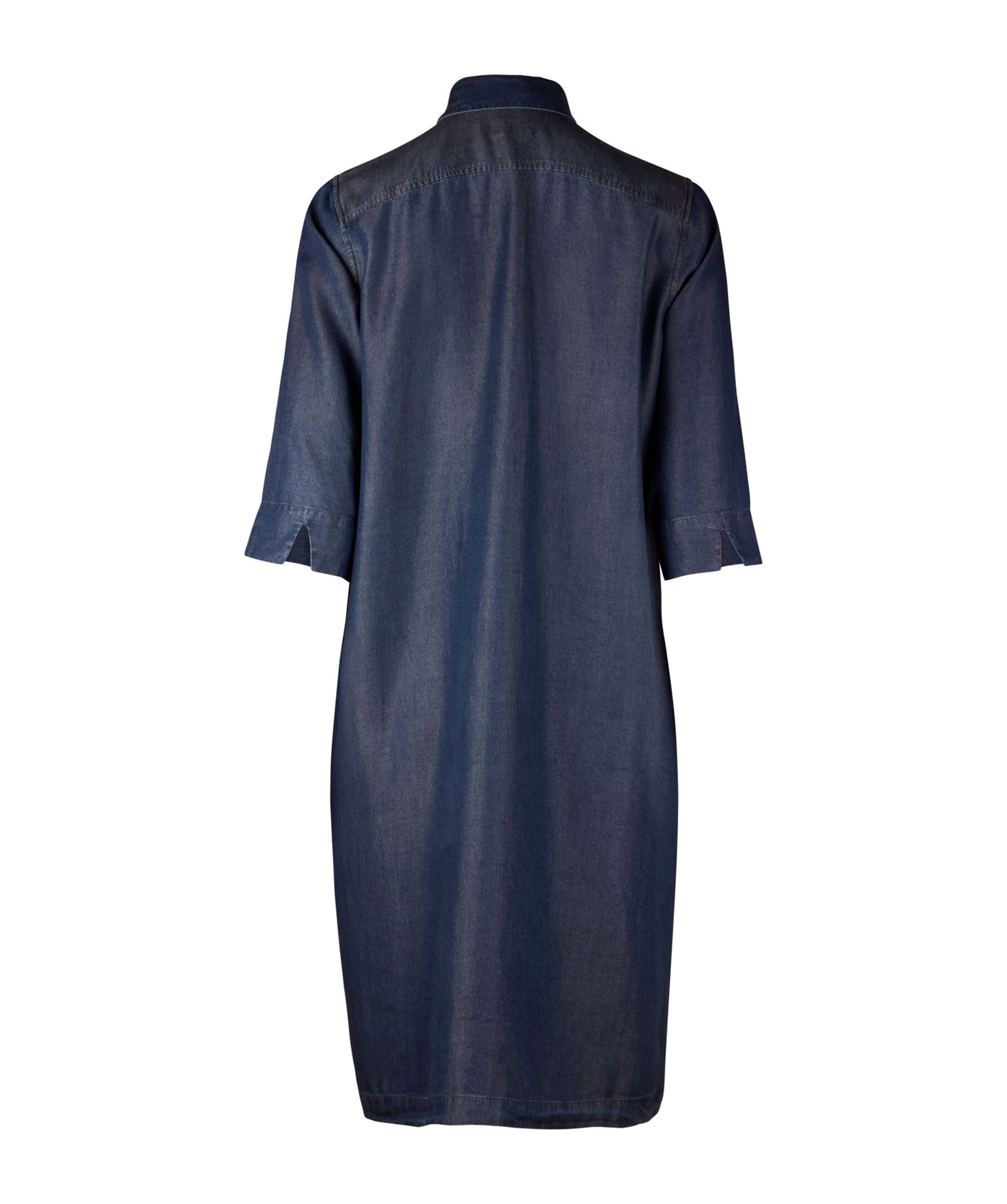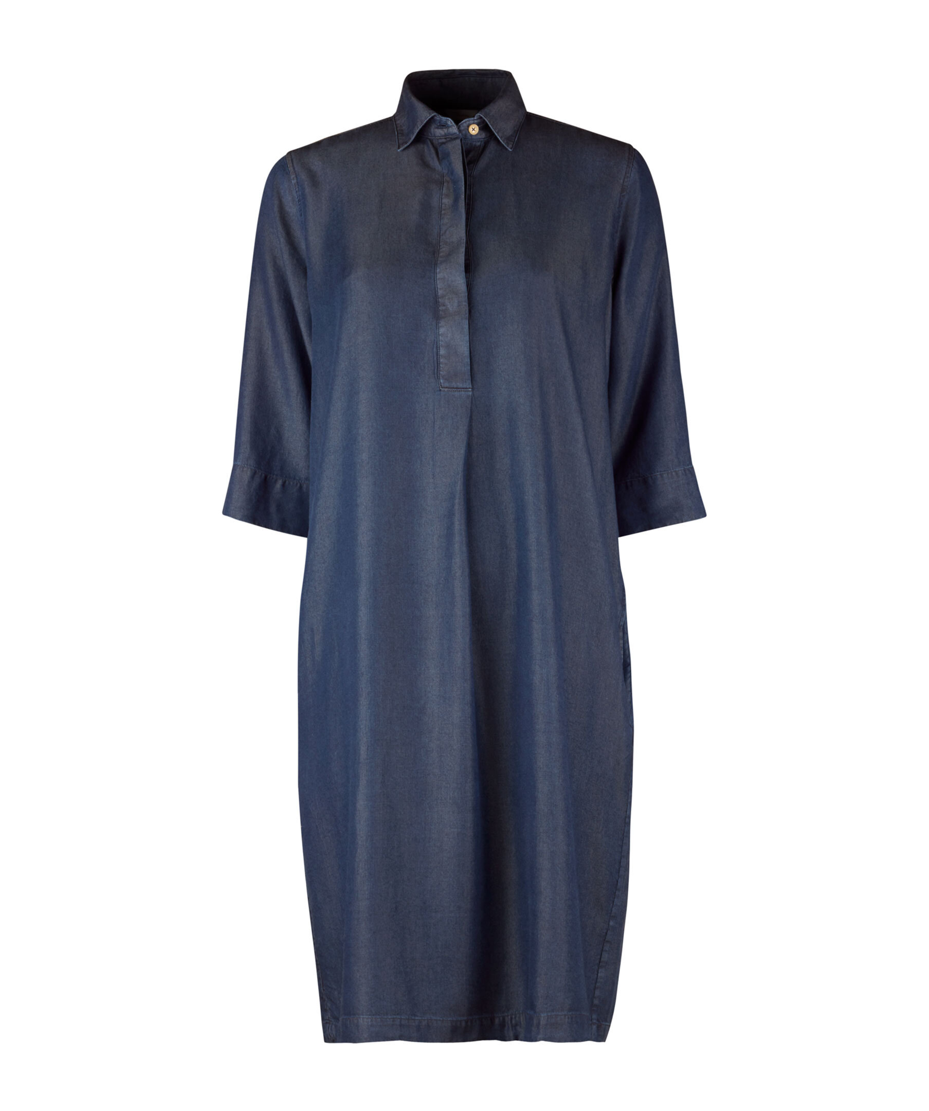 Mörkblå klänning från Stenströms. Denna popoverklänning har en rak passform, en halvknäppning med dolda knappar och en klassisk krage. Slutar strax ovanför knäna. Tillverkad av lyocell.