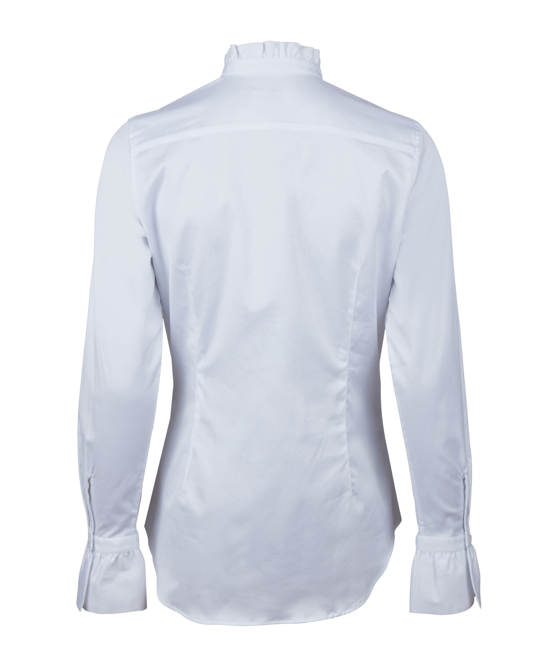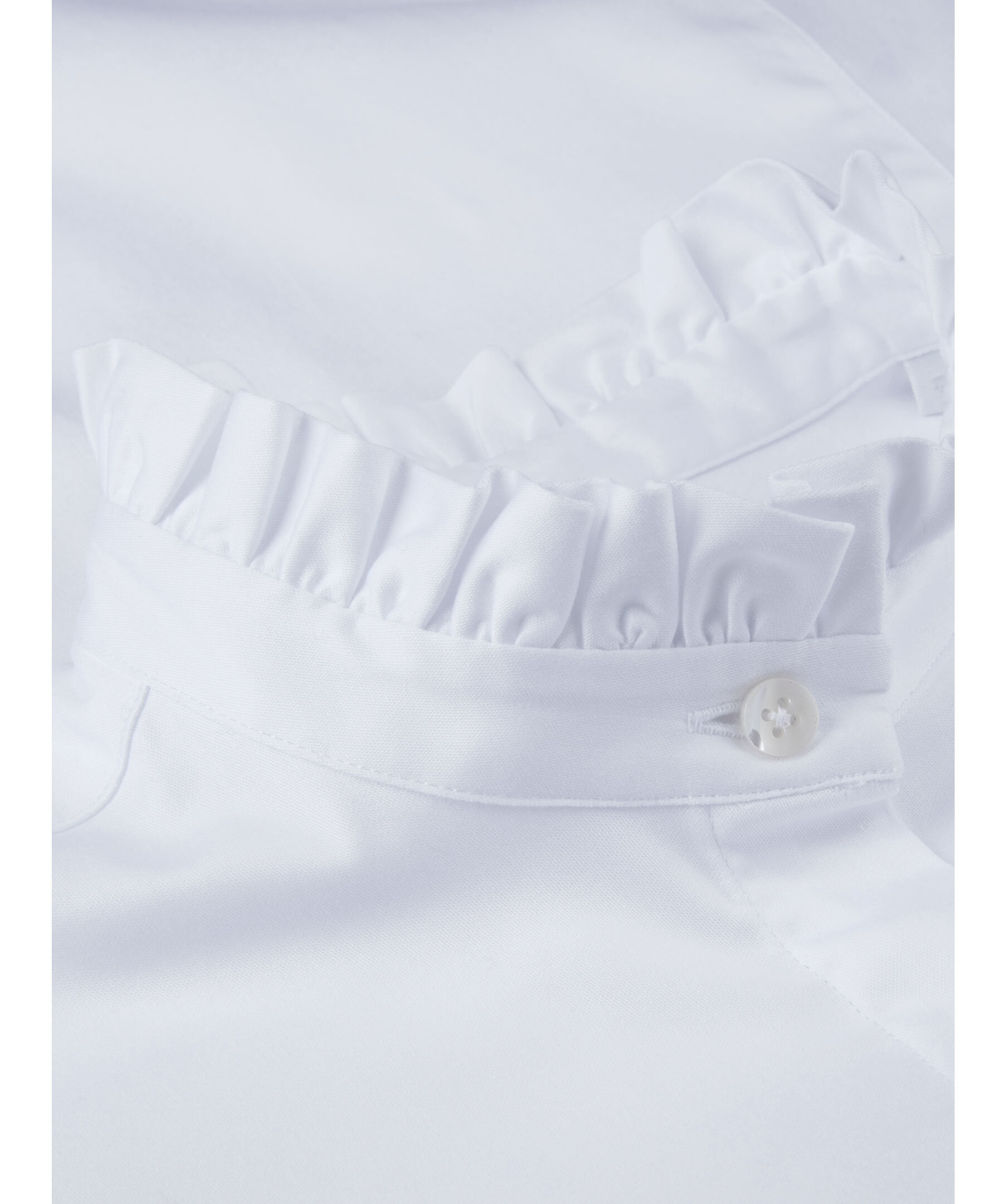 Denna volangblus är tillverkad av bomull och har en feminin passform. Blusen har en dold knappslå, liten volang i kragen och förlängda volang manschetter.