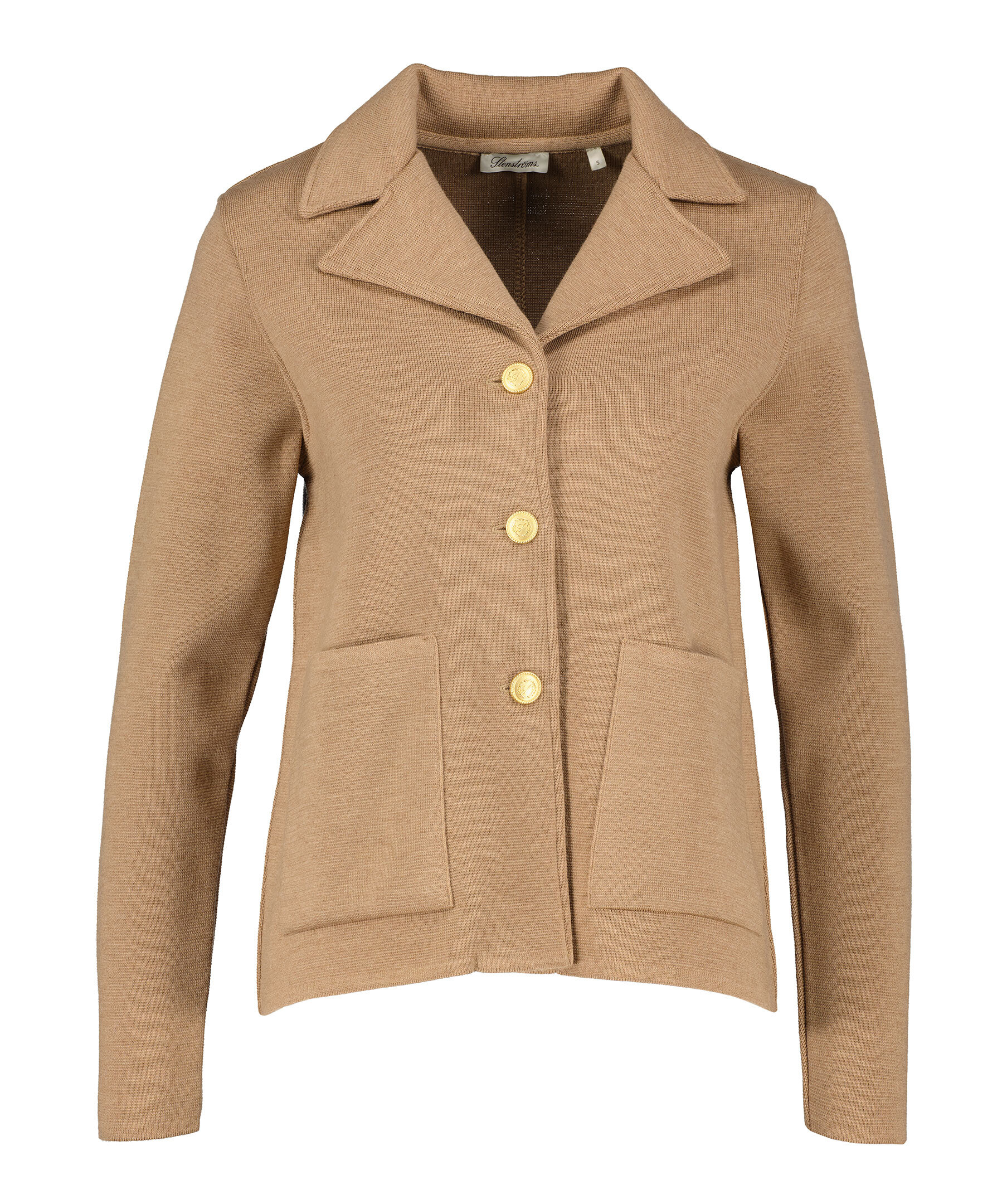Beige stickad kavaj från Stenströms. Stängs framtill med guldfärgade knappar. Knapp vid ärmslut. Två fickor framtill. Tillverkad i 100% Merino Wool.