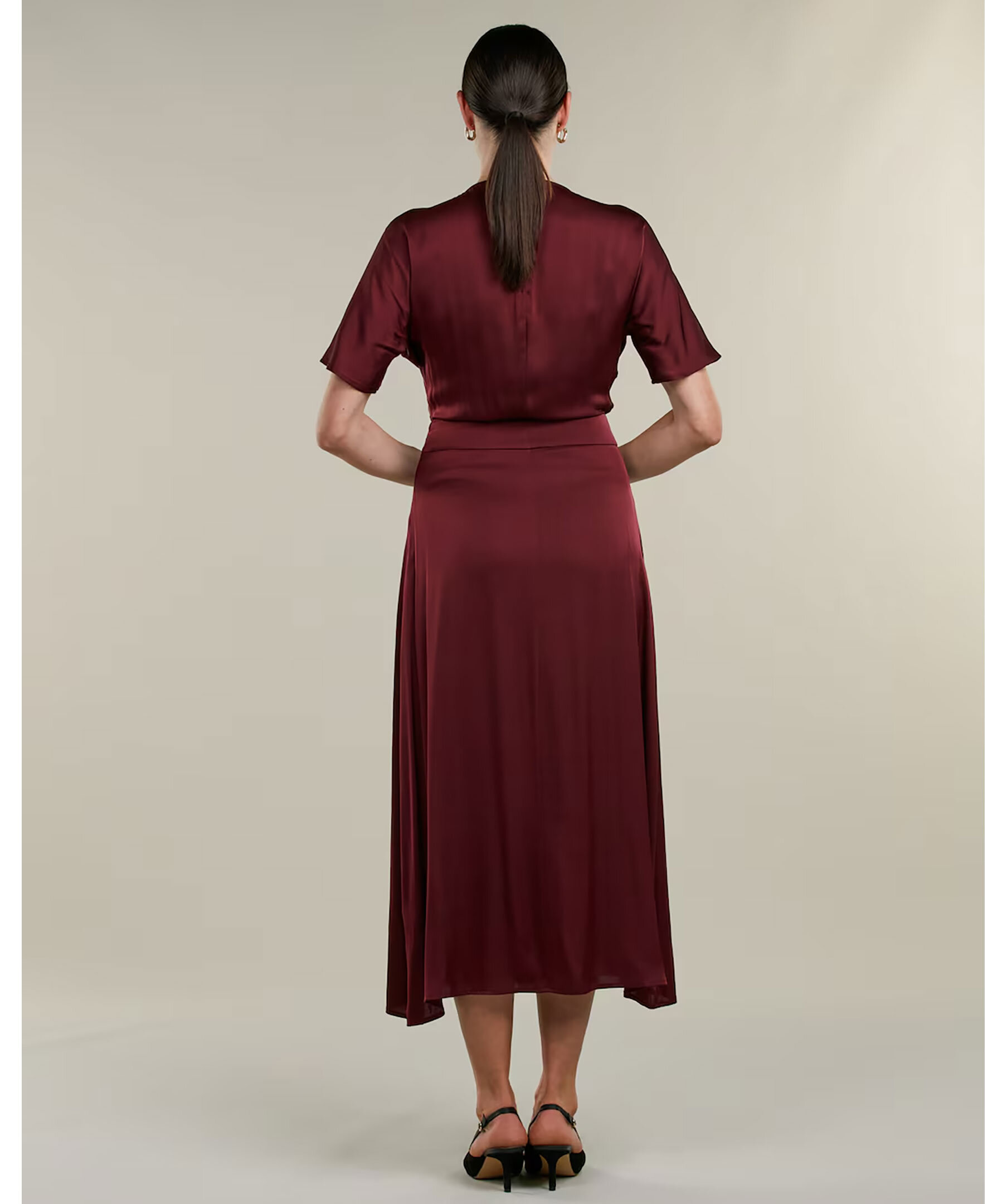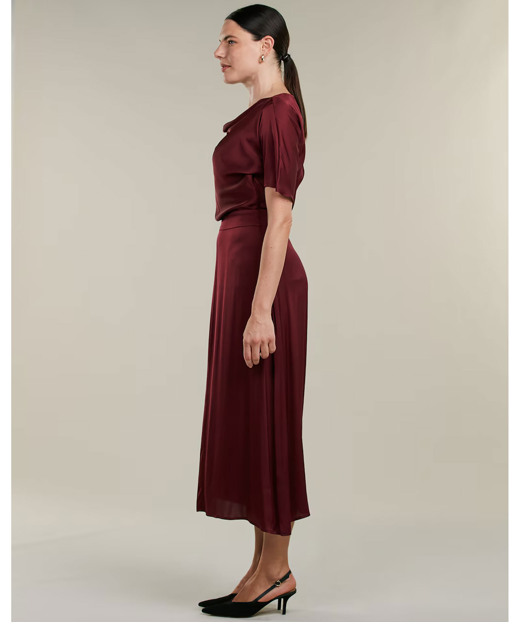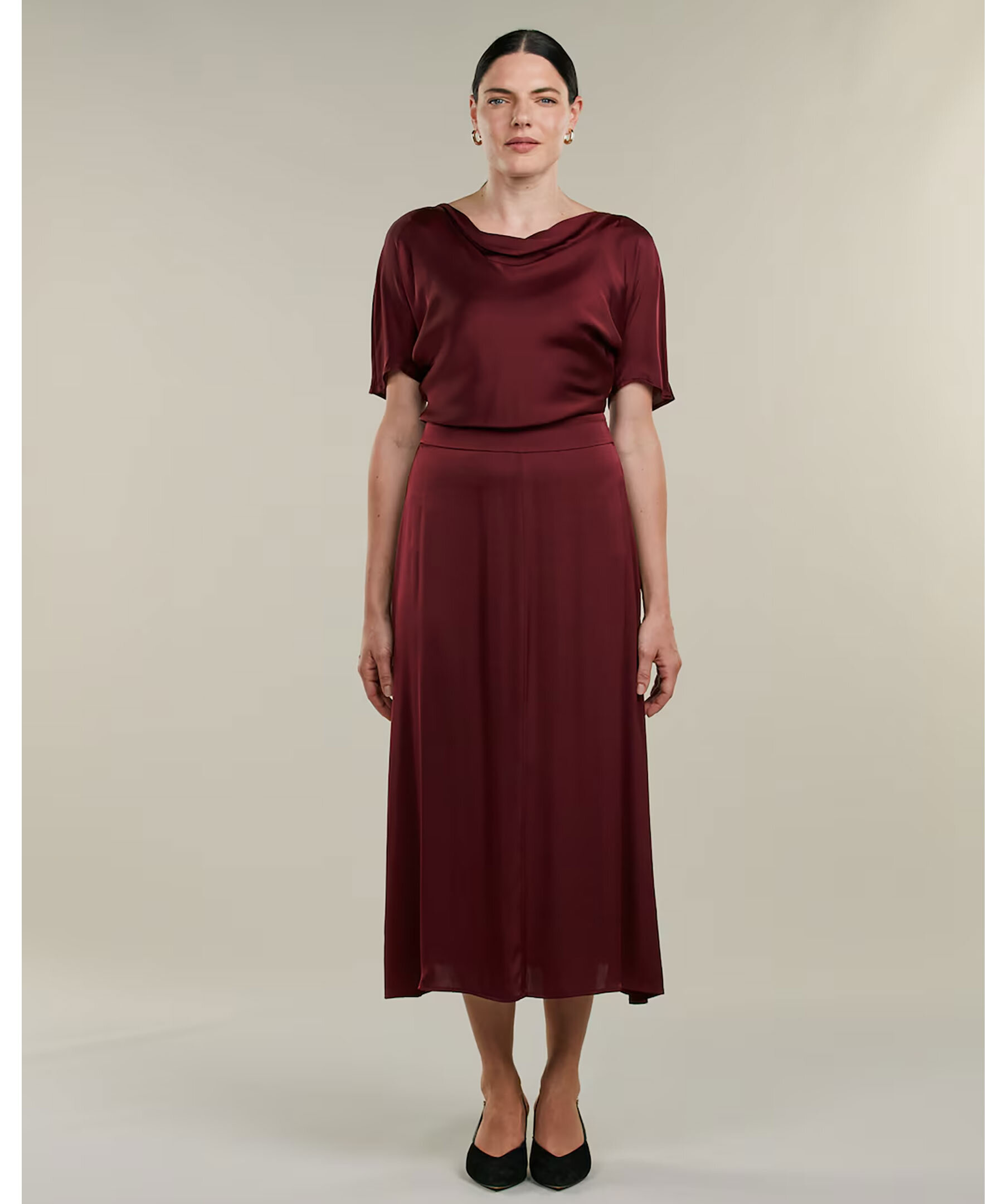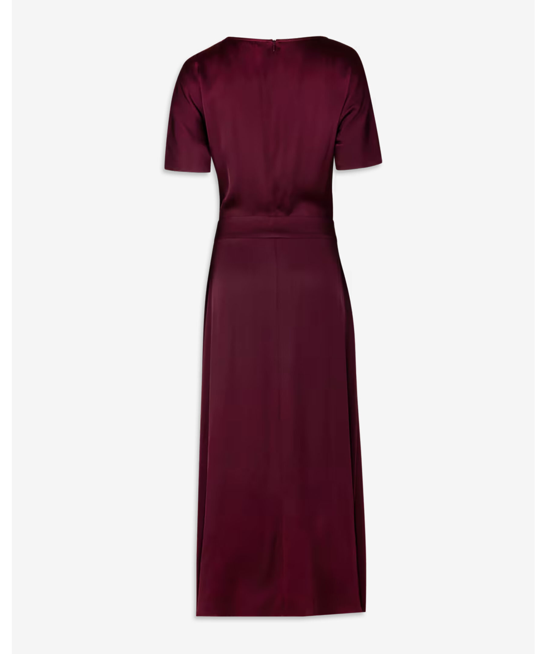 Jessa mörkröd sidenklänning från Stenströms. Klänningen har en smal passform med fallande halsringning och korta ärmar. Tillverkad i en mjuk sidenblandning som ger en elegant glans och följsam känsla. Knälång modell som skapar en smickrande siluett. Passar både till fest och mer vardagliga tillfällen.