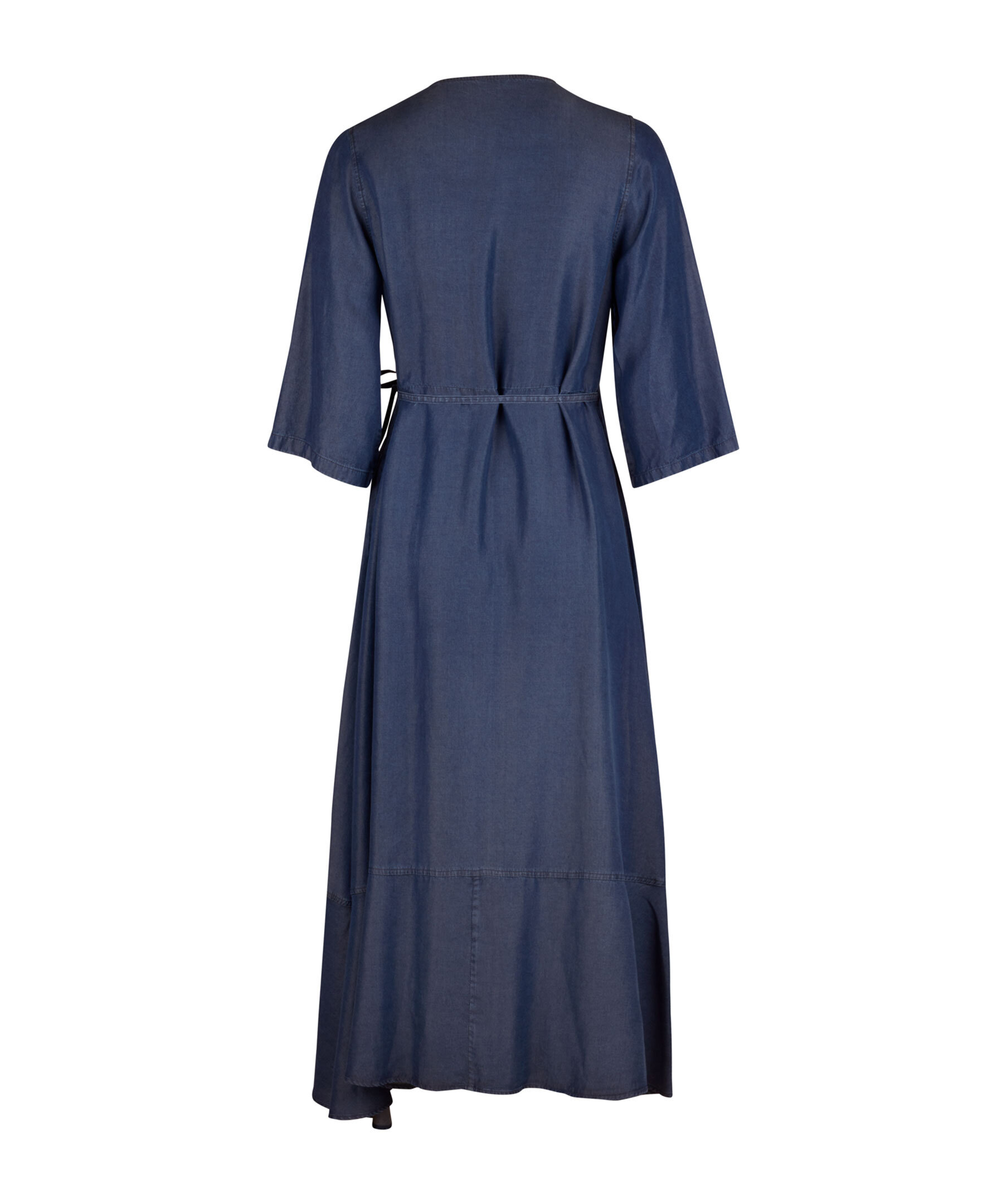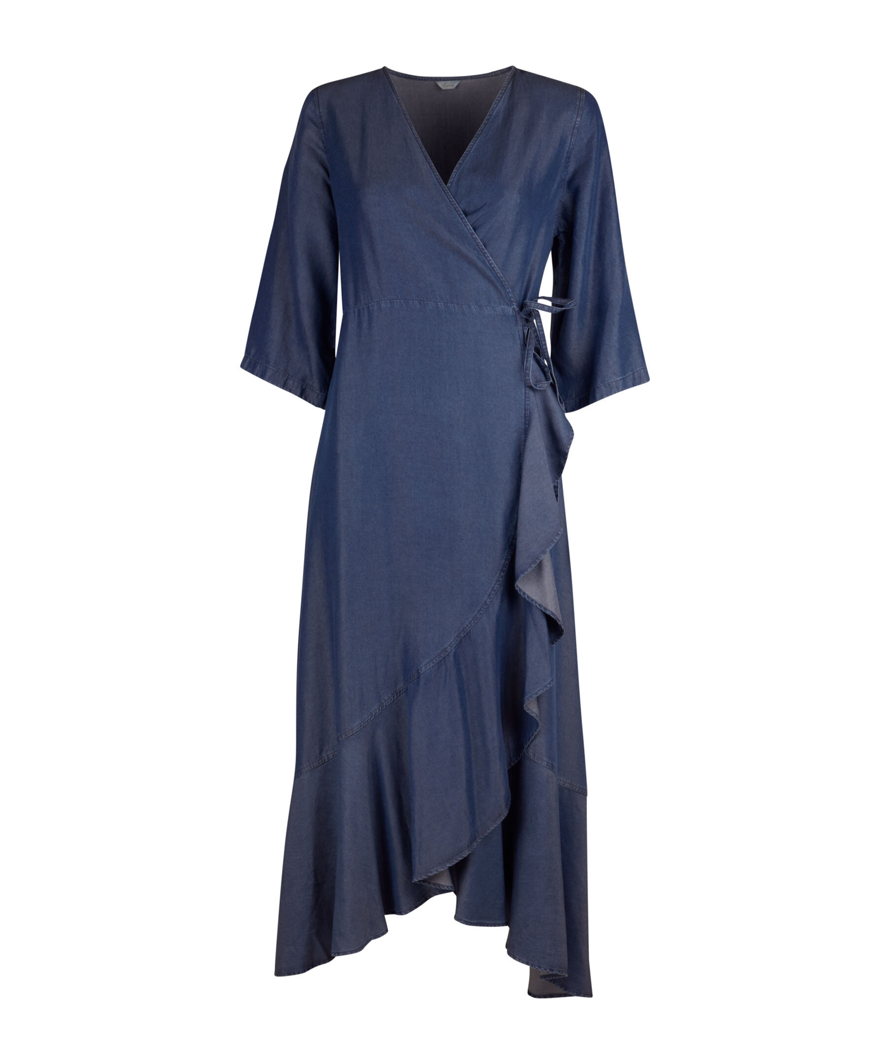 Blå klänning från Stenströms, Klänningen är en omlott klänning med 3/4 ärms och knytning i sidan, samt volang nedtill. Tillverkad av lyocell.