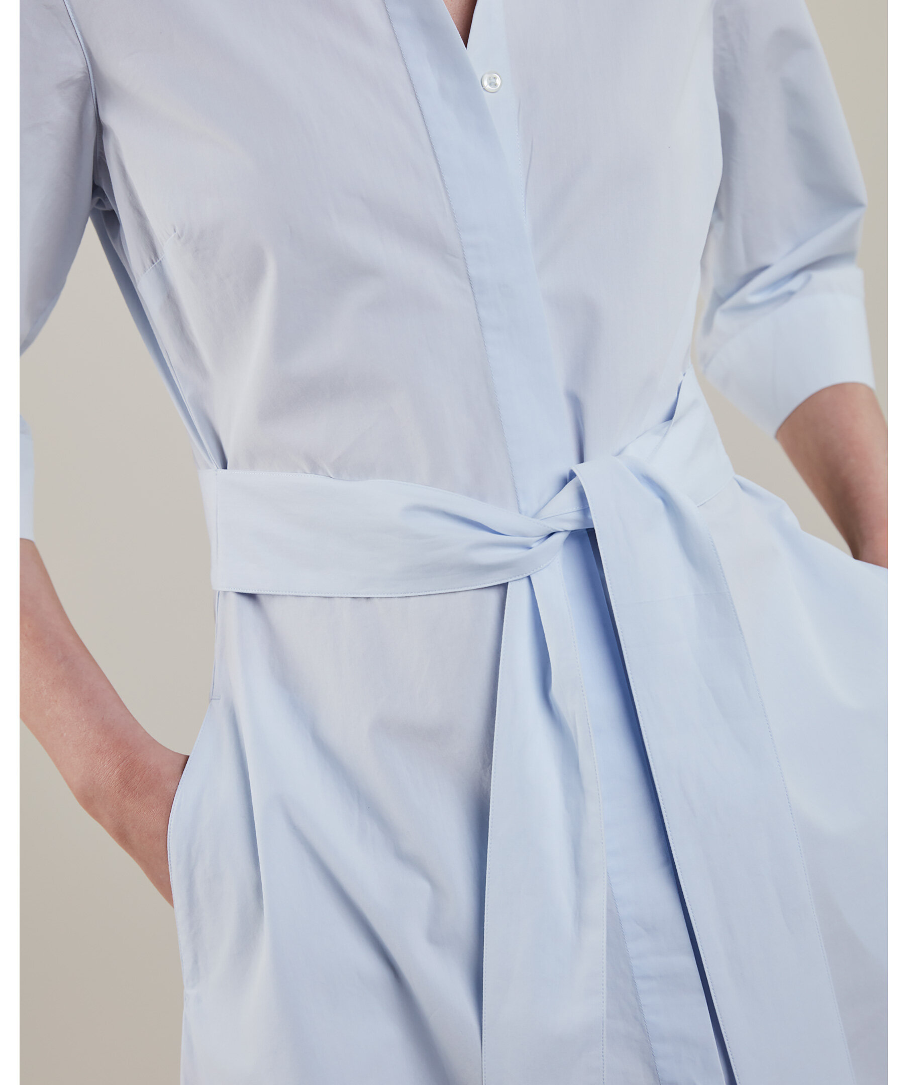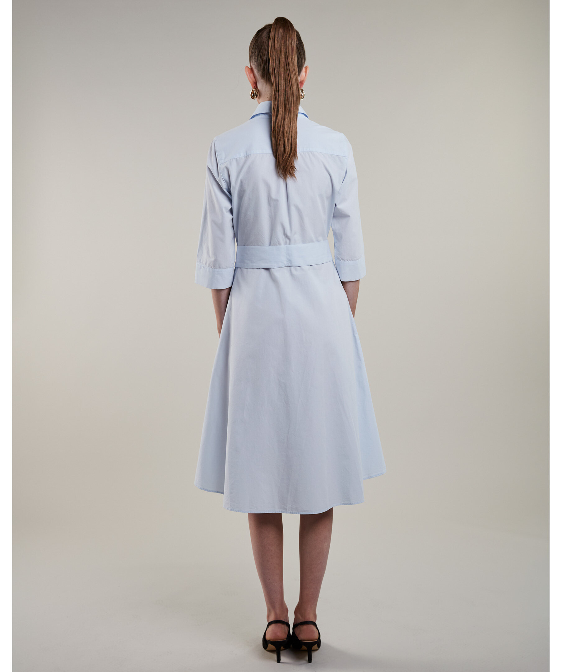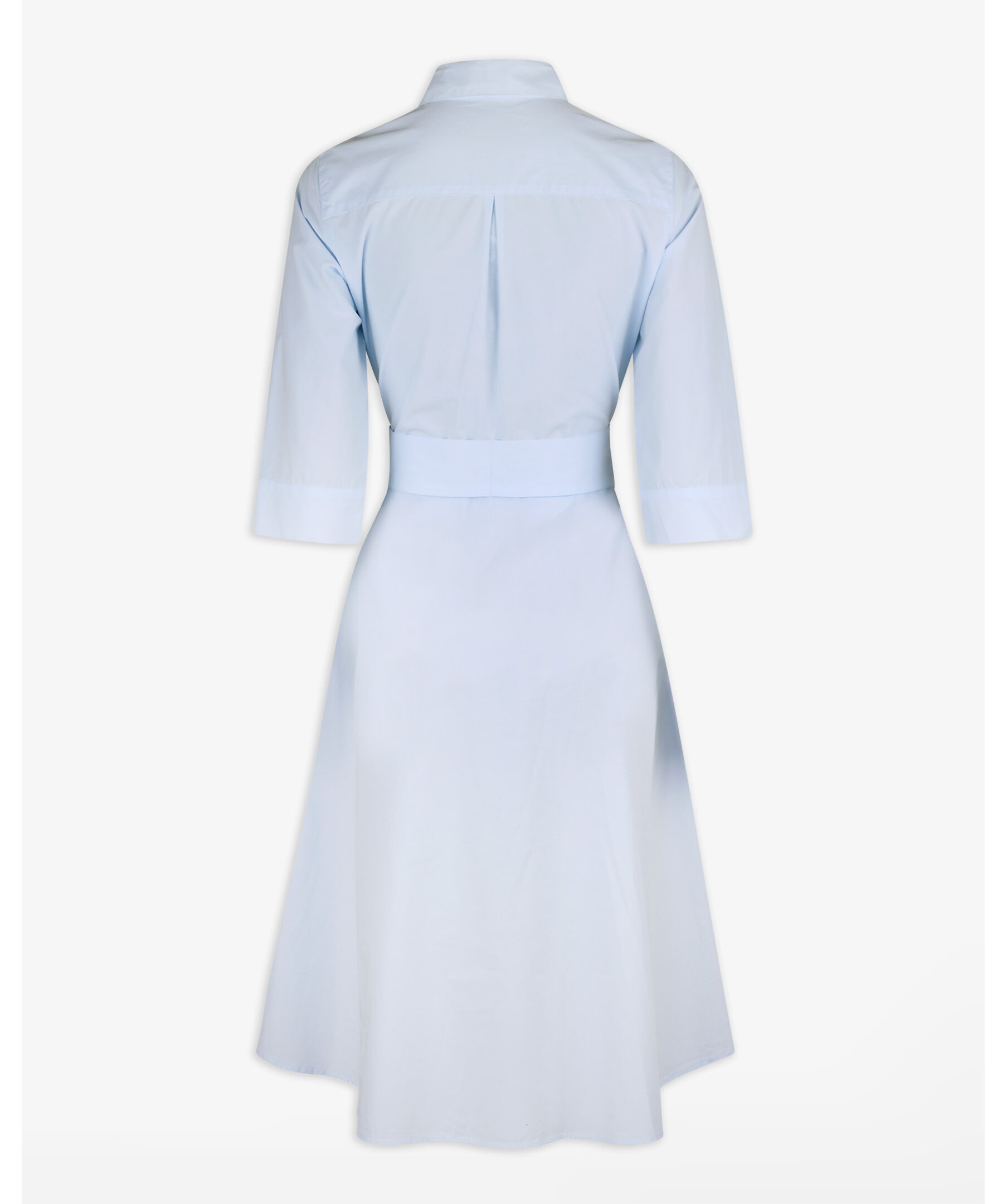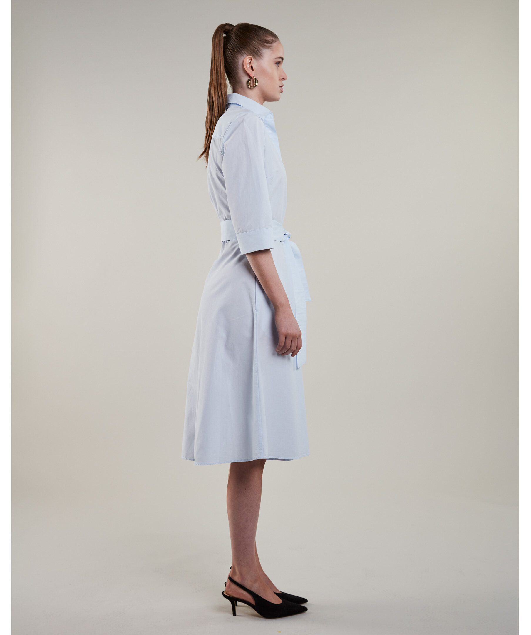 Ljusblå klänning tillverkad av bomull och har 3/4 ärmar, en dold knappslå och ett bälte i midjan. Klänningen har fickor.