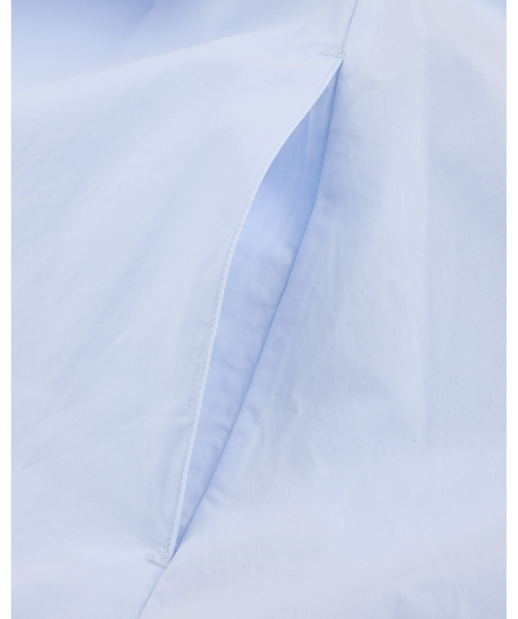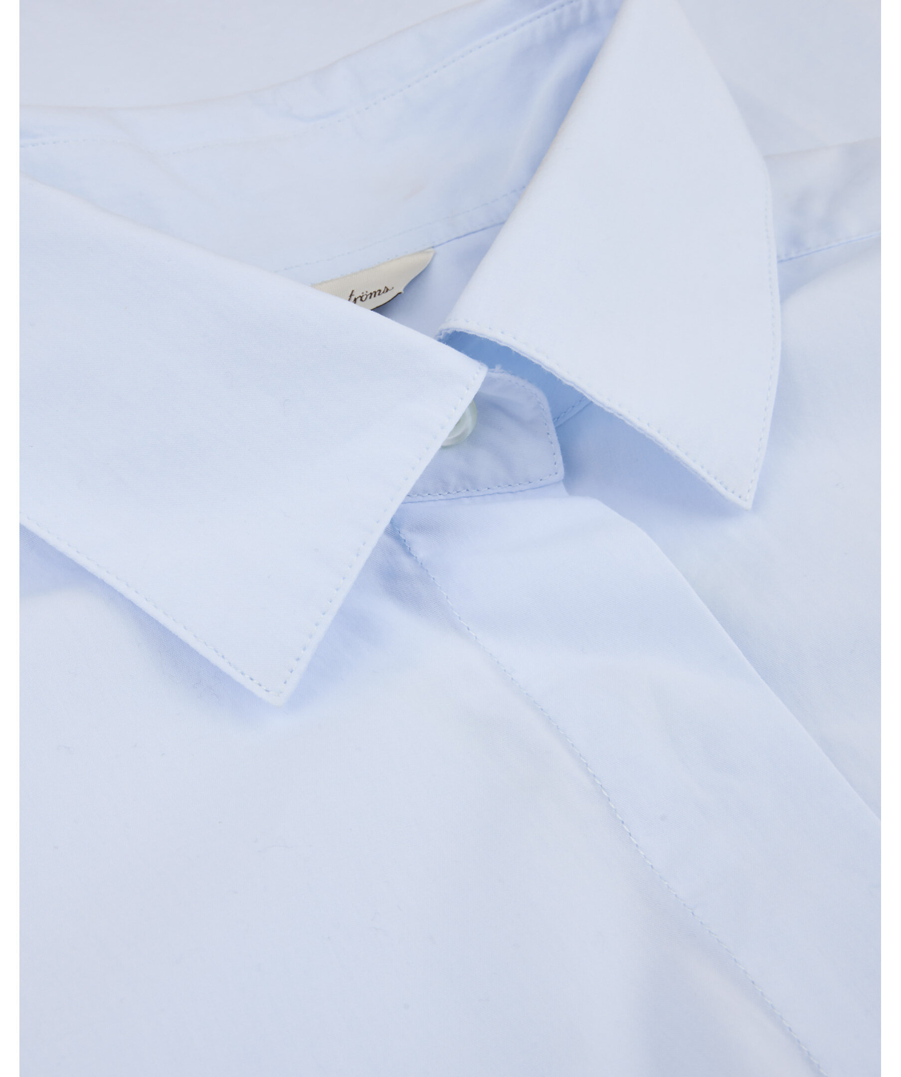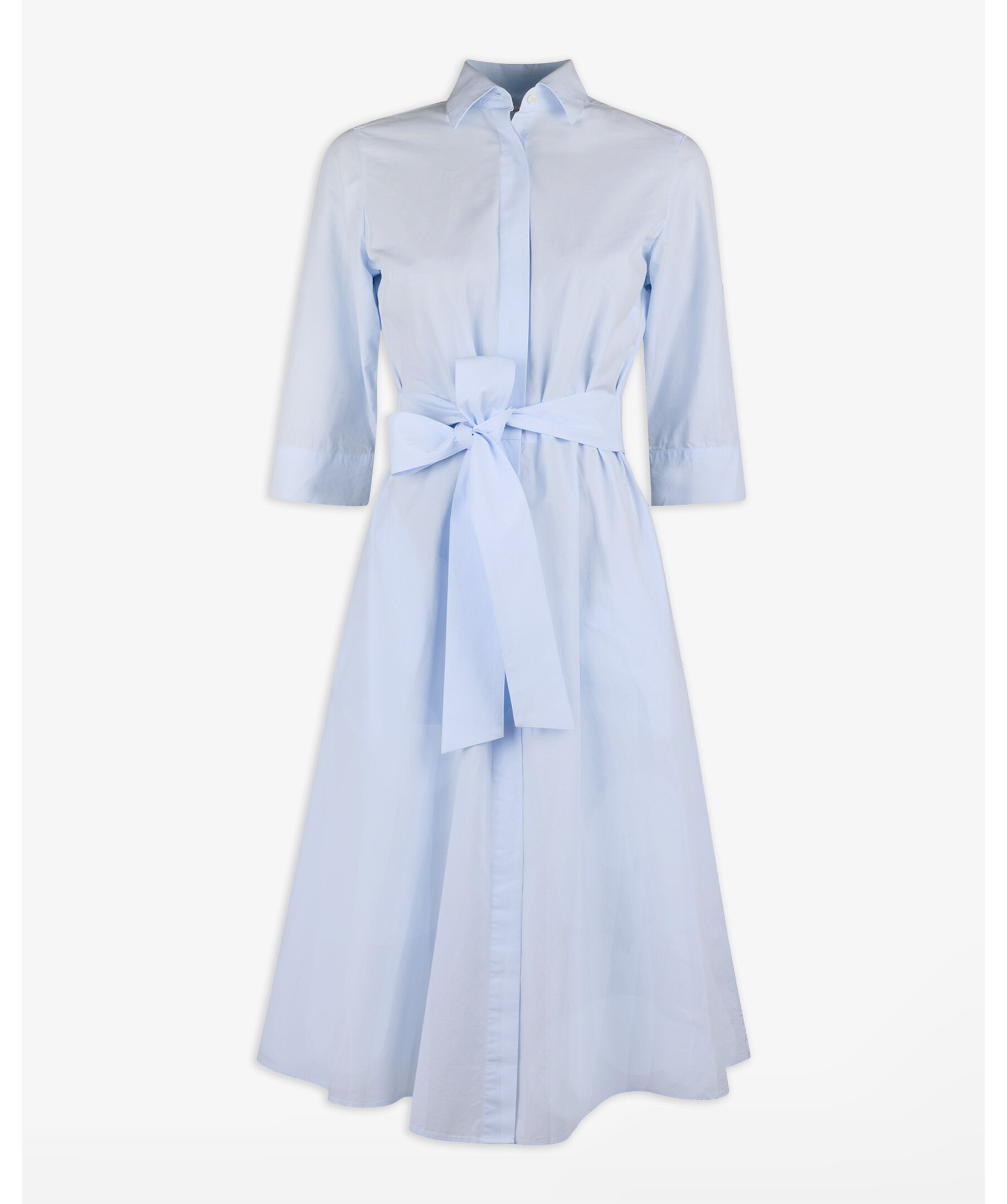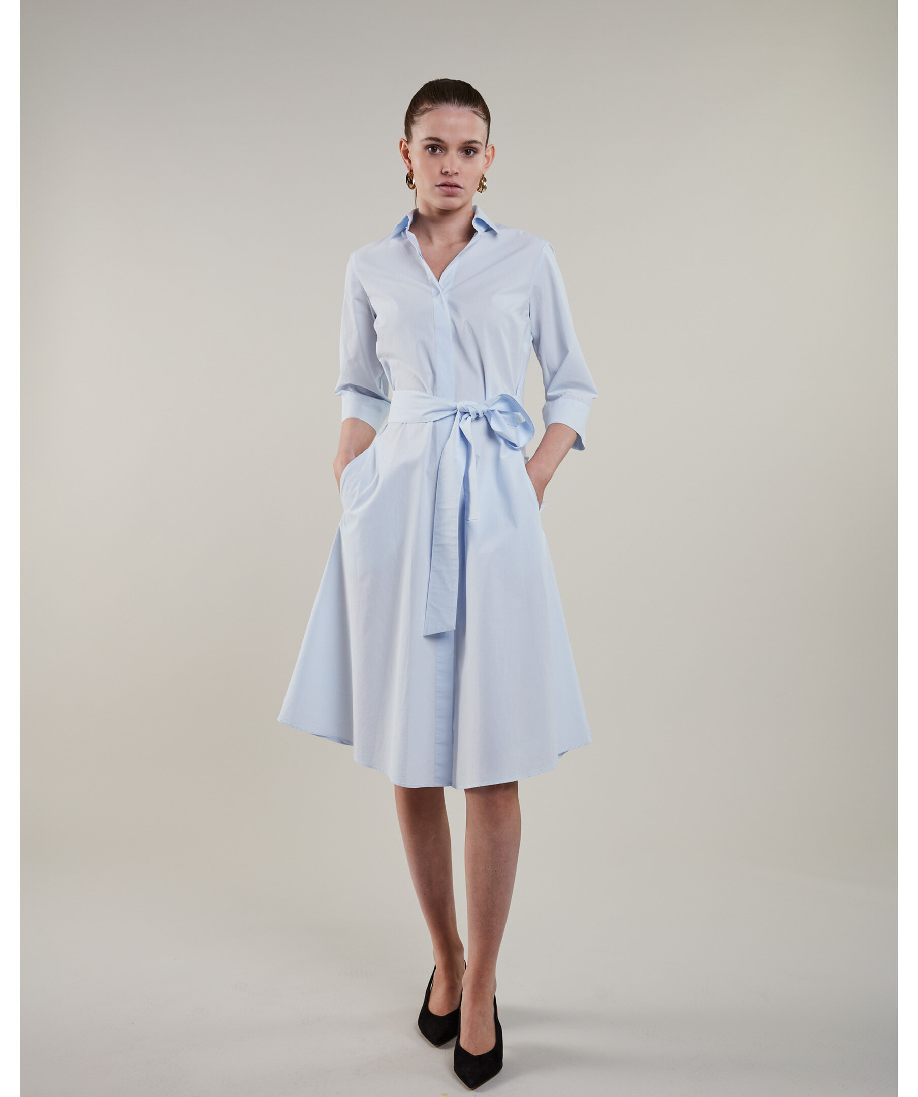 Ljusblå klänning tillverkad av bomull och har 3/4 ärmar, en dold knappslå och ett bälte i midjan. Klänningen har fickor.