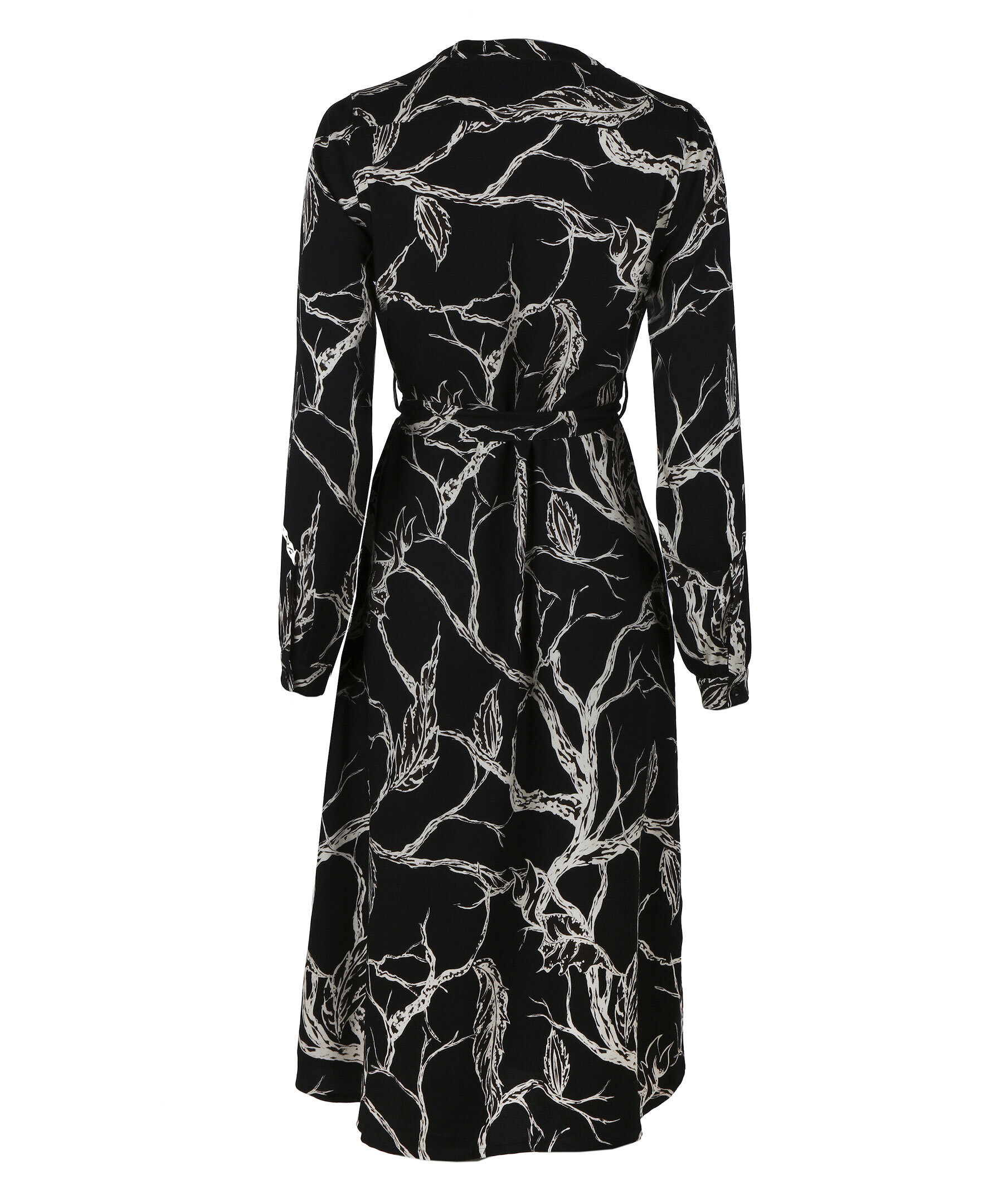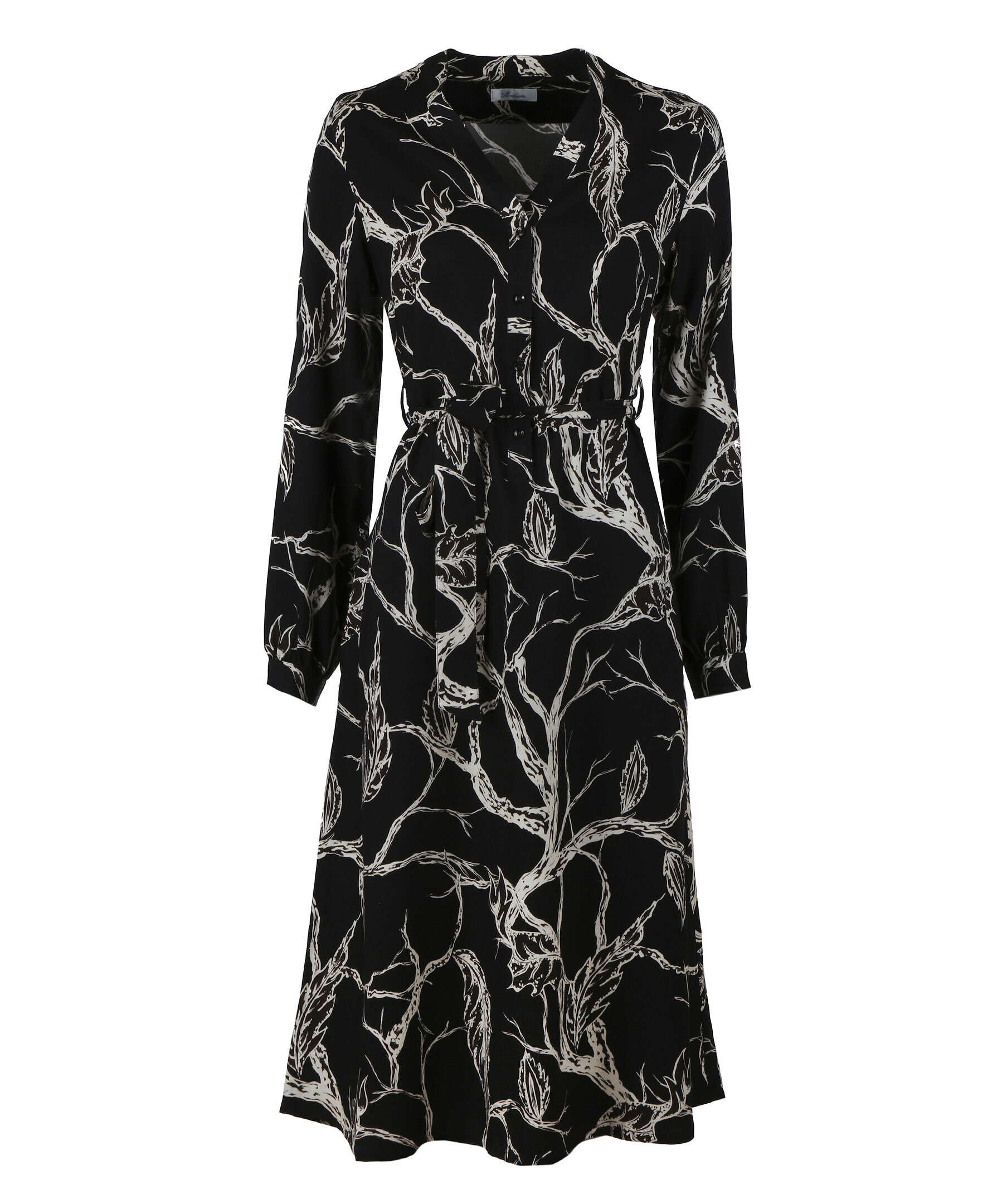 Den knälånga klänningen Beatrice har ett tryckt mönster med stora blommor i sobra färger. Tyget är en viskos som har ett härligt fall och som sitter fint på koppen. De långa ärmarna avslutas med enkla manschetter. Klänningen har praktiska fickor i sidan och ett band i midjan som förstärker en kvinnlig siluett.