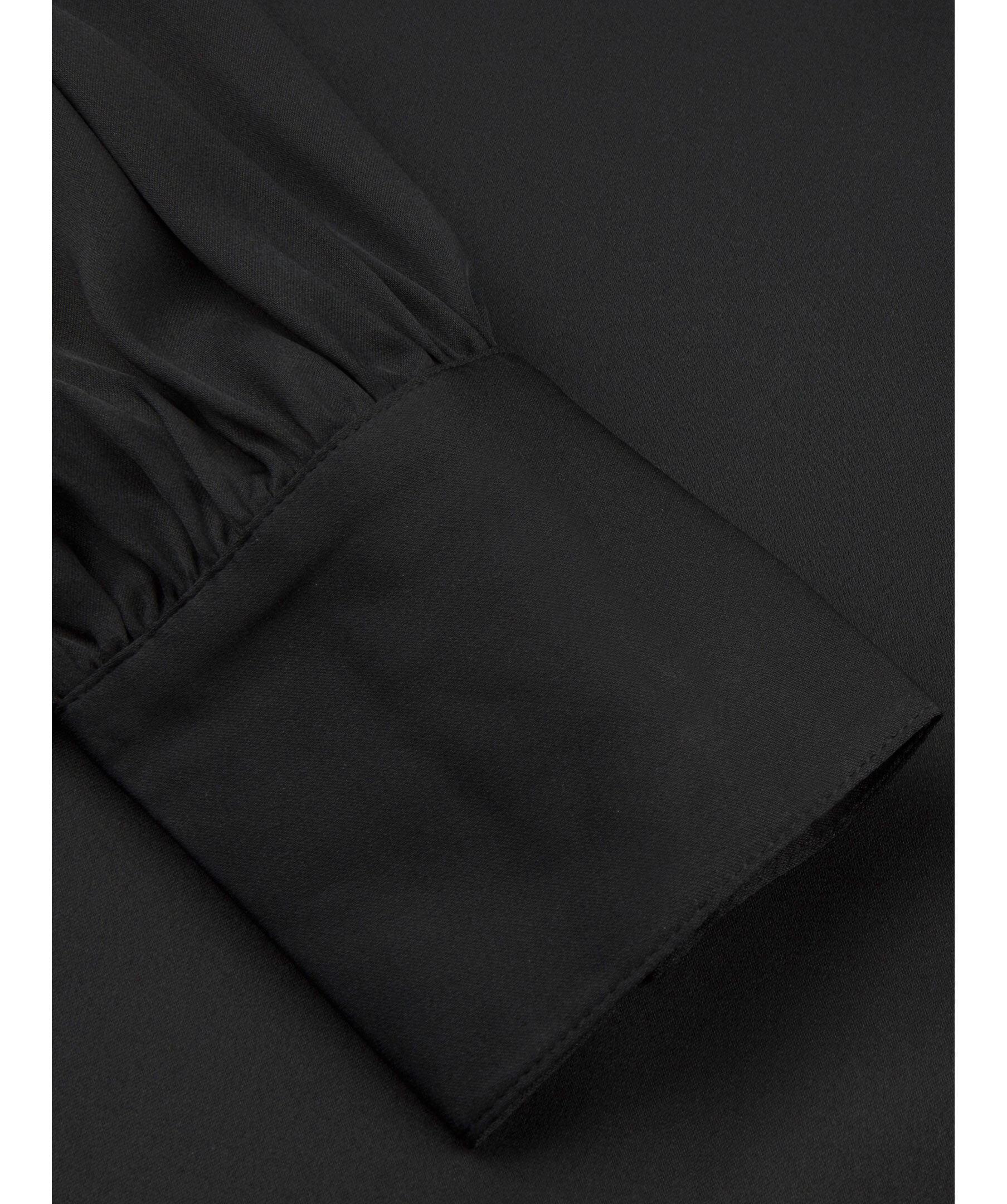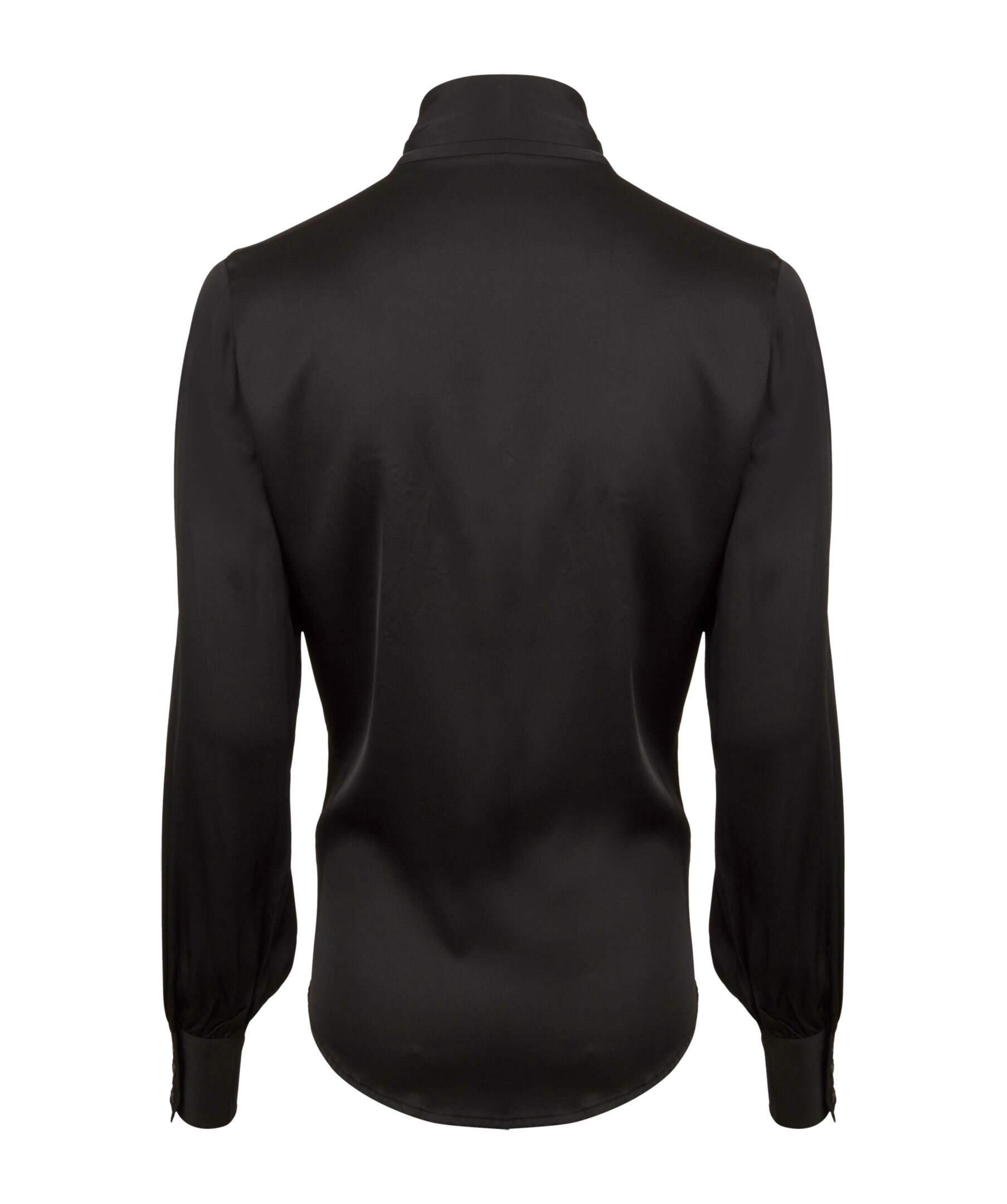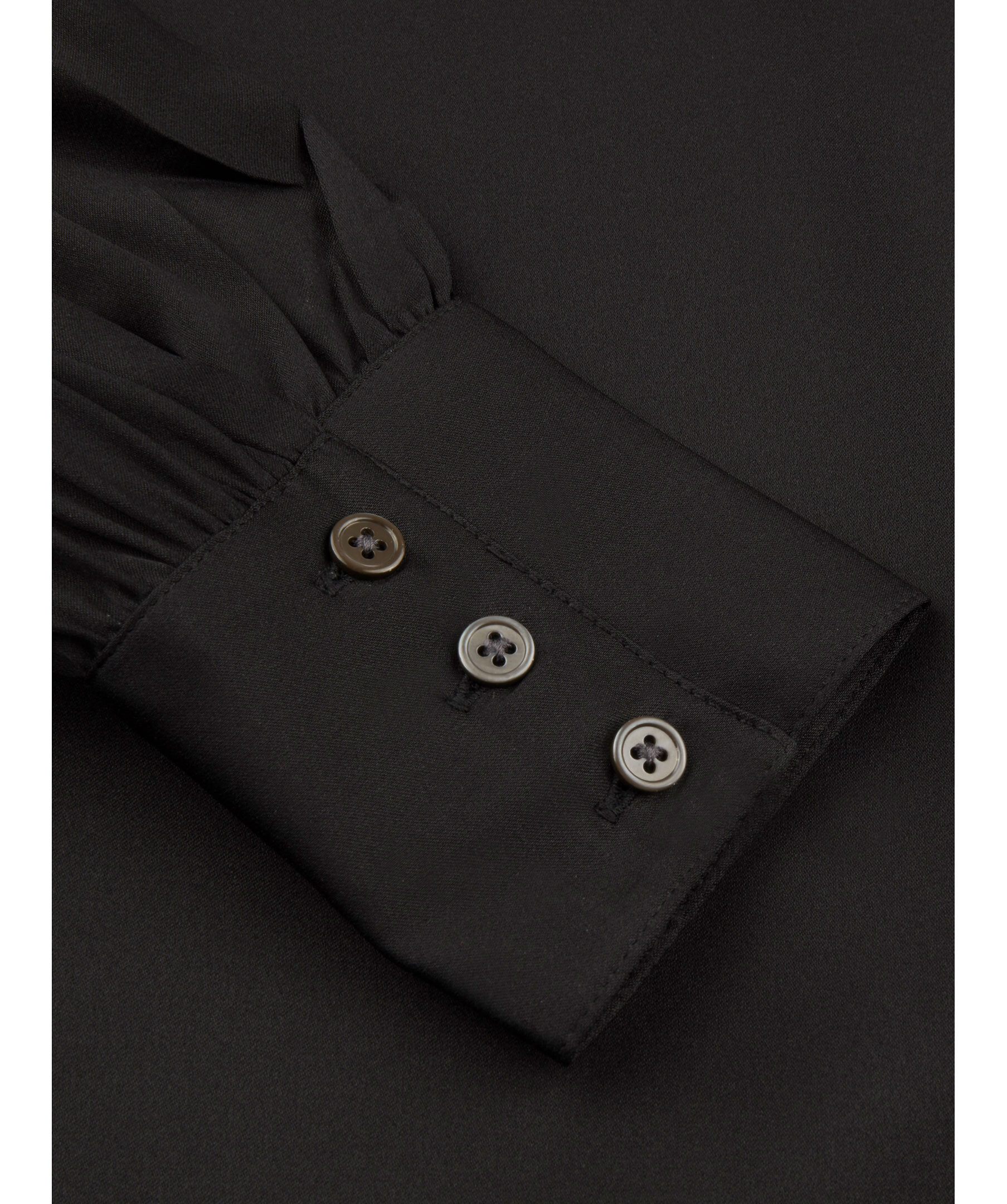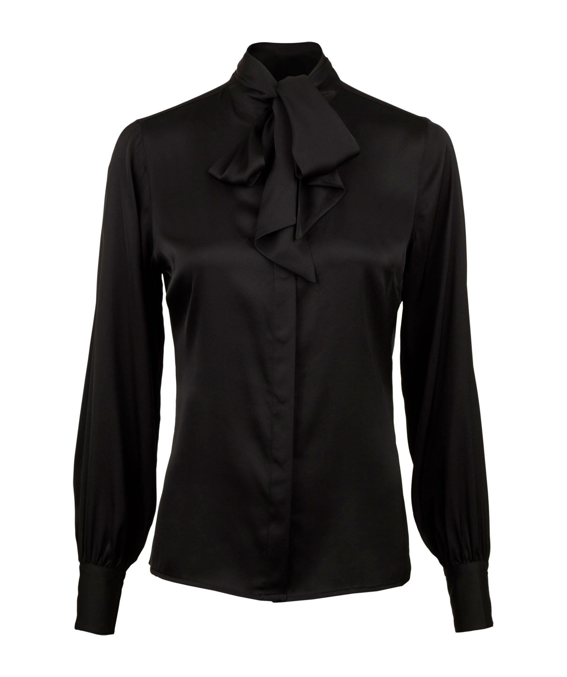 Denna blus är tillverkad av siden och har en feminin passform. Blusen har en dold knappslå och en knytkrage.