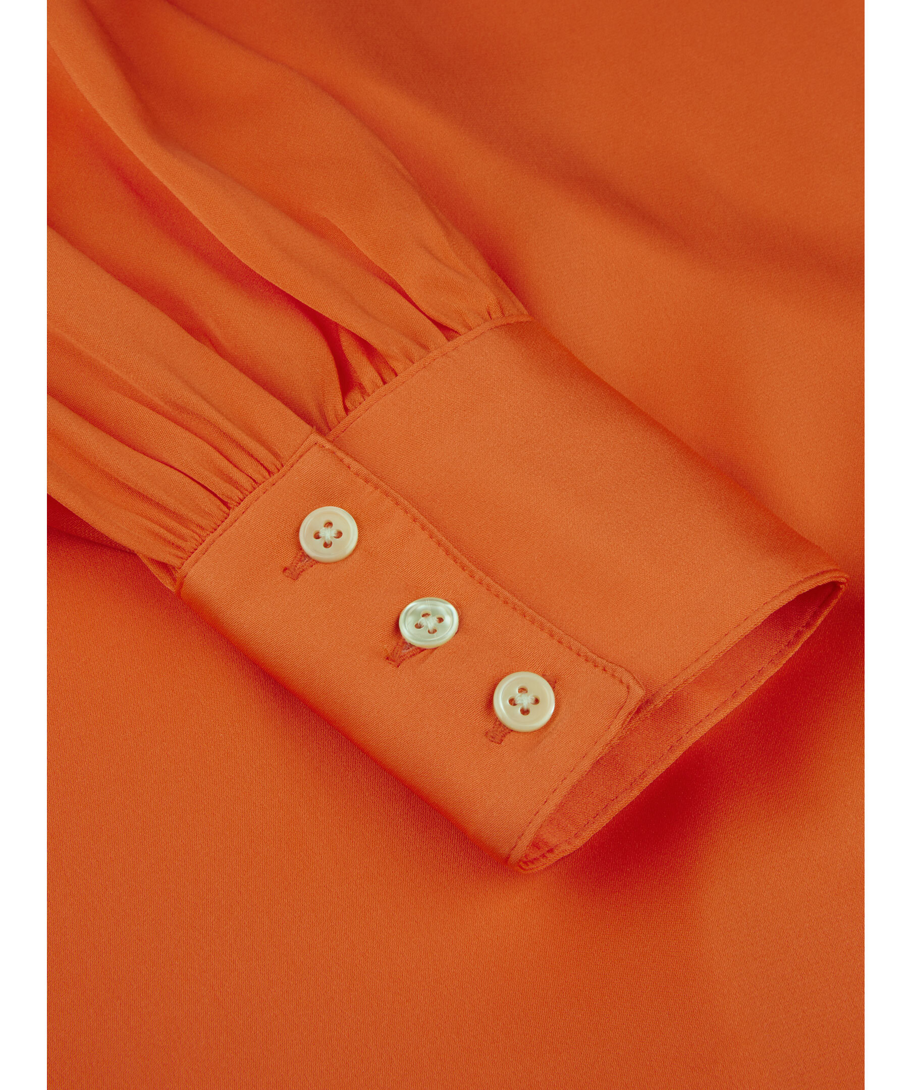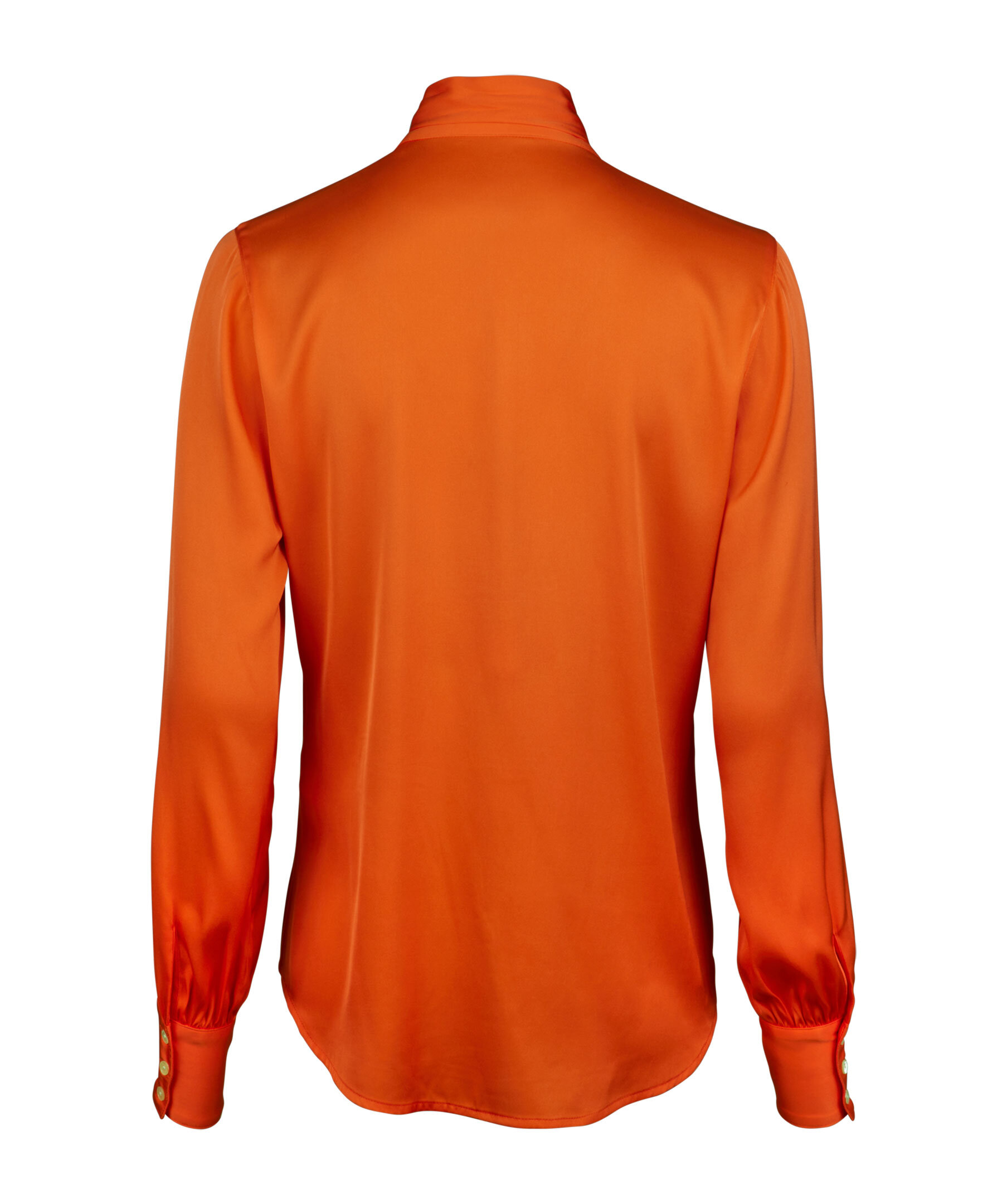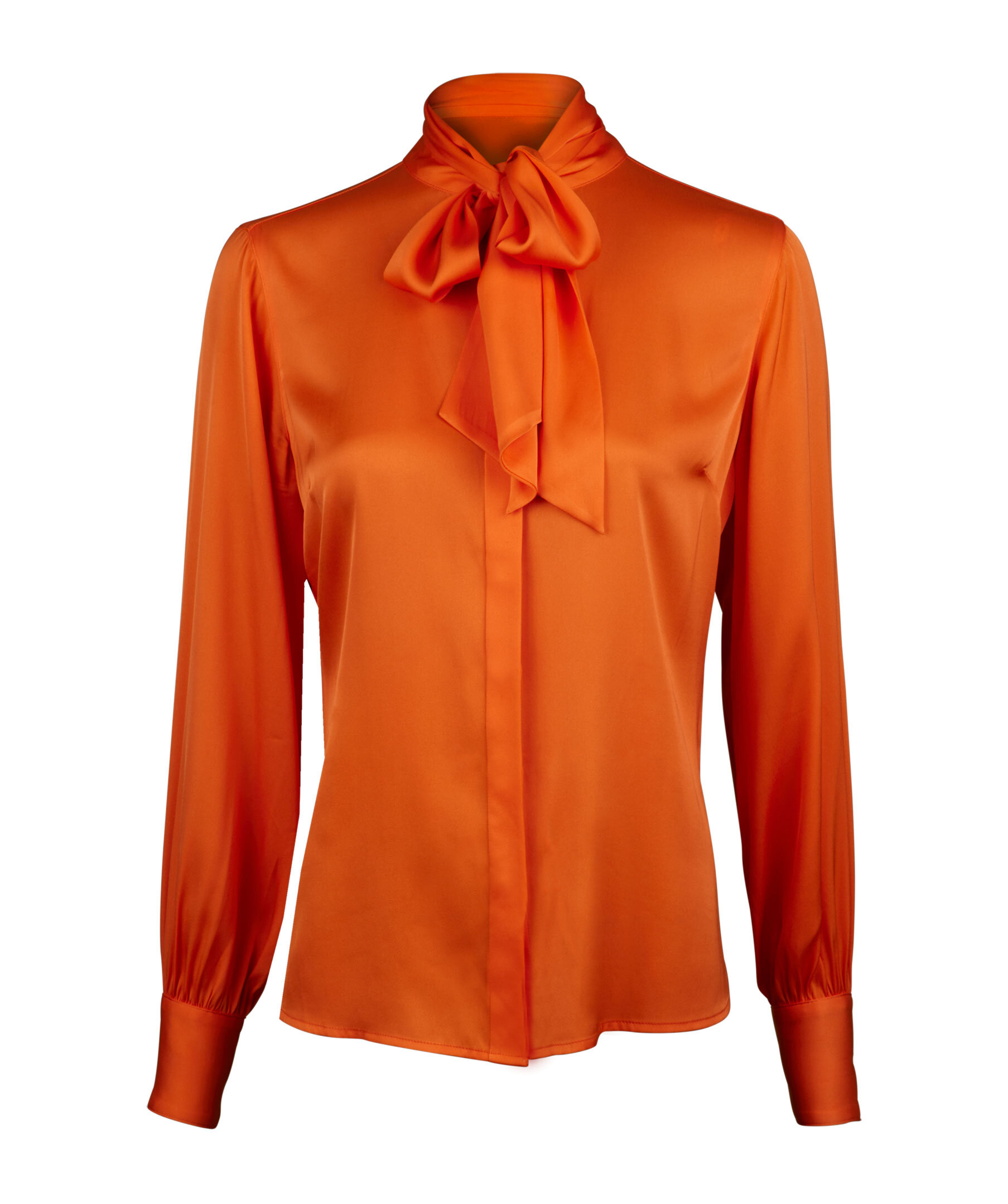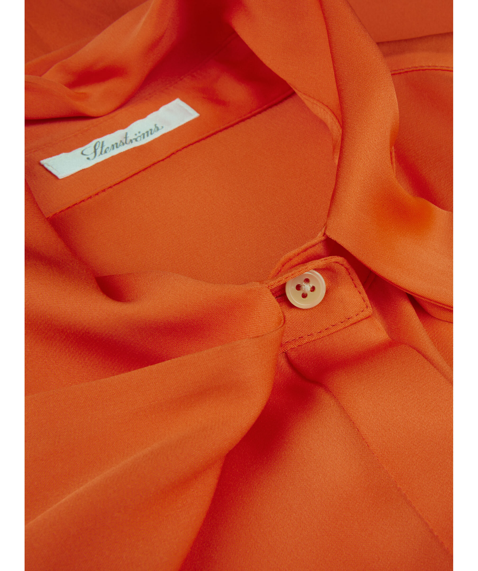 Denna blus är tillverkad av siden och har en feminin passform. Blusen har en dold knappslå och en knytkrage.