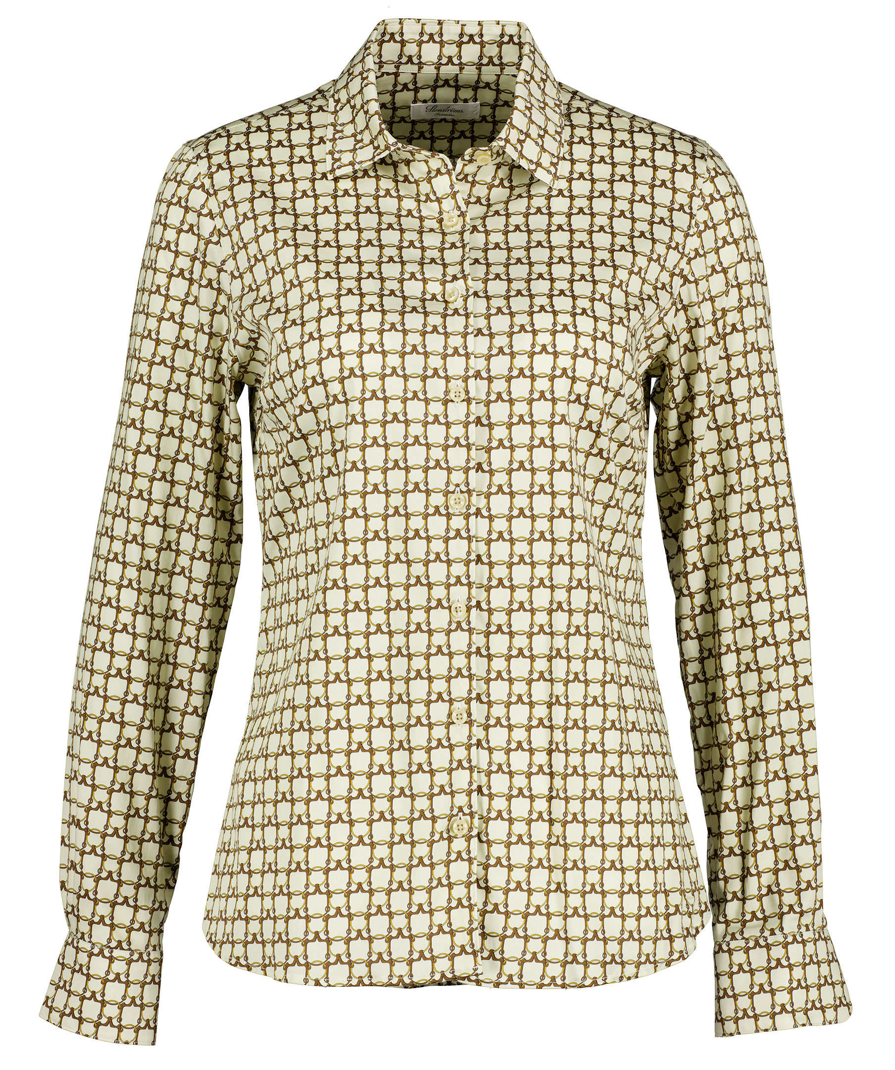 Skjorta med feminin passform och hästinspirerat print från Stenströms. Tillverkad i stretchig bomull och stängs med beigea knappar. Manchetter med justerbar ärmstorlek längst ner och spetsig krage.