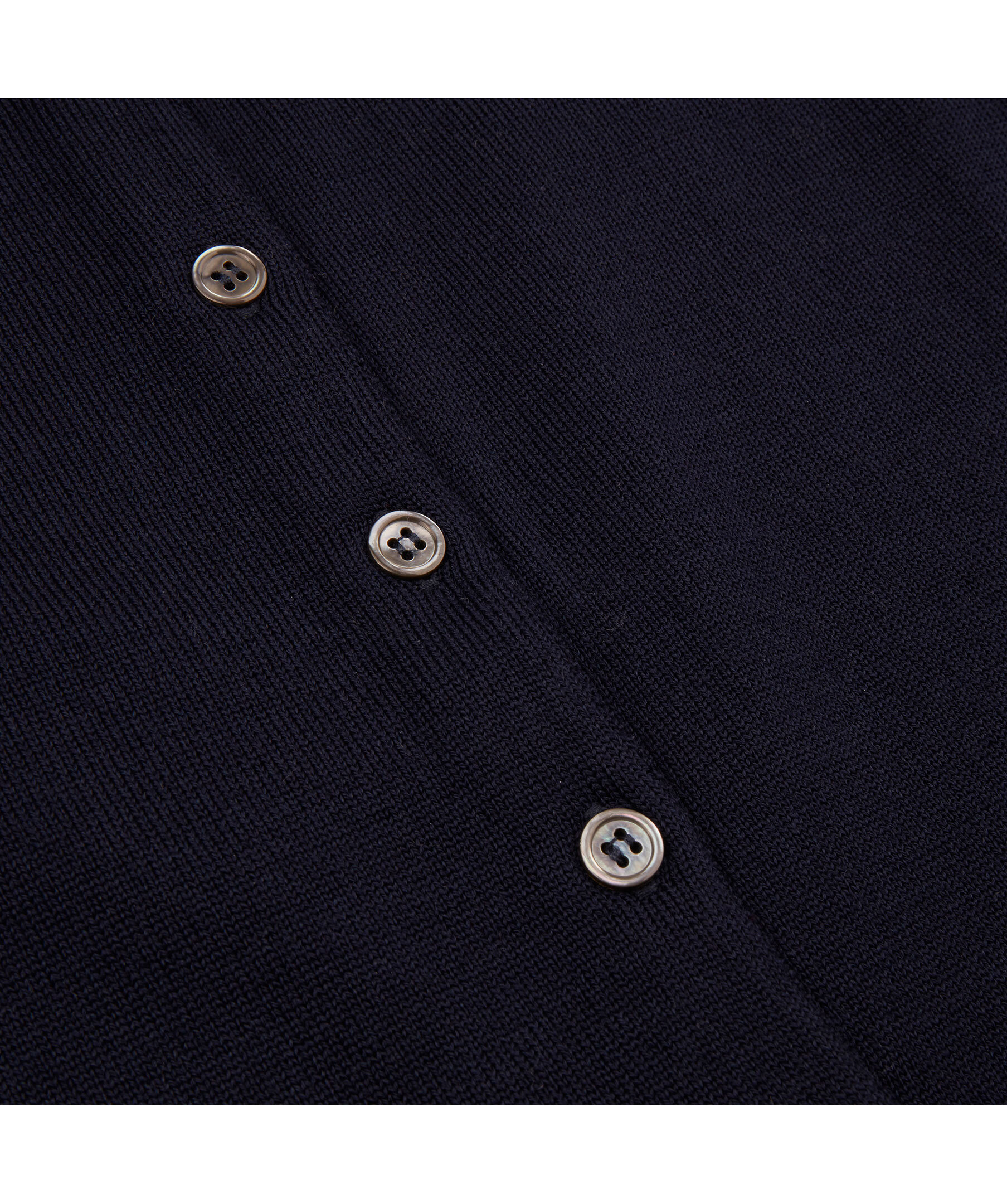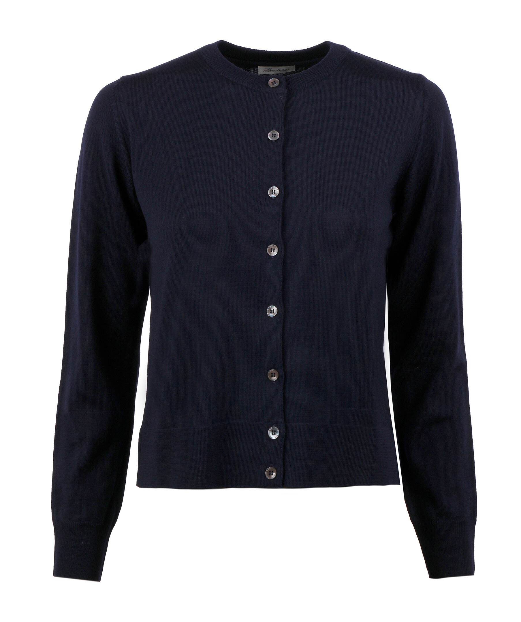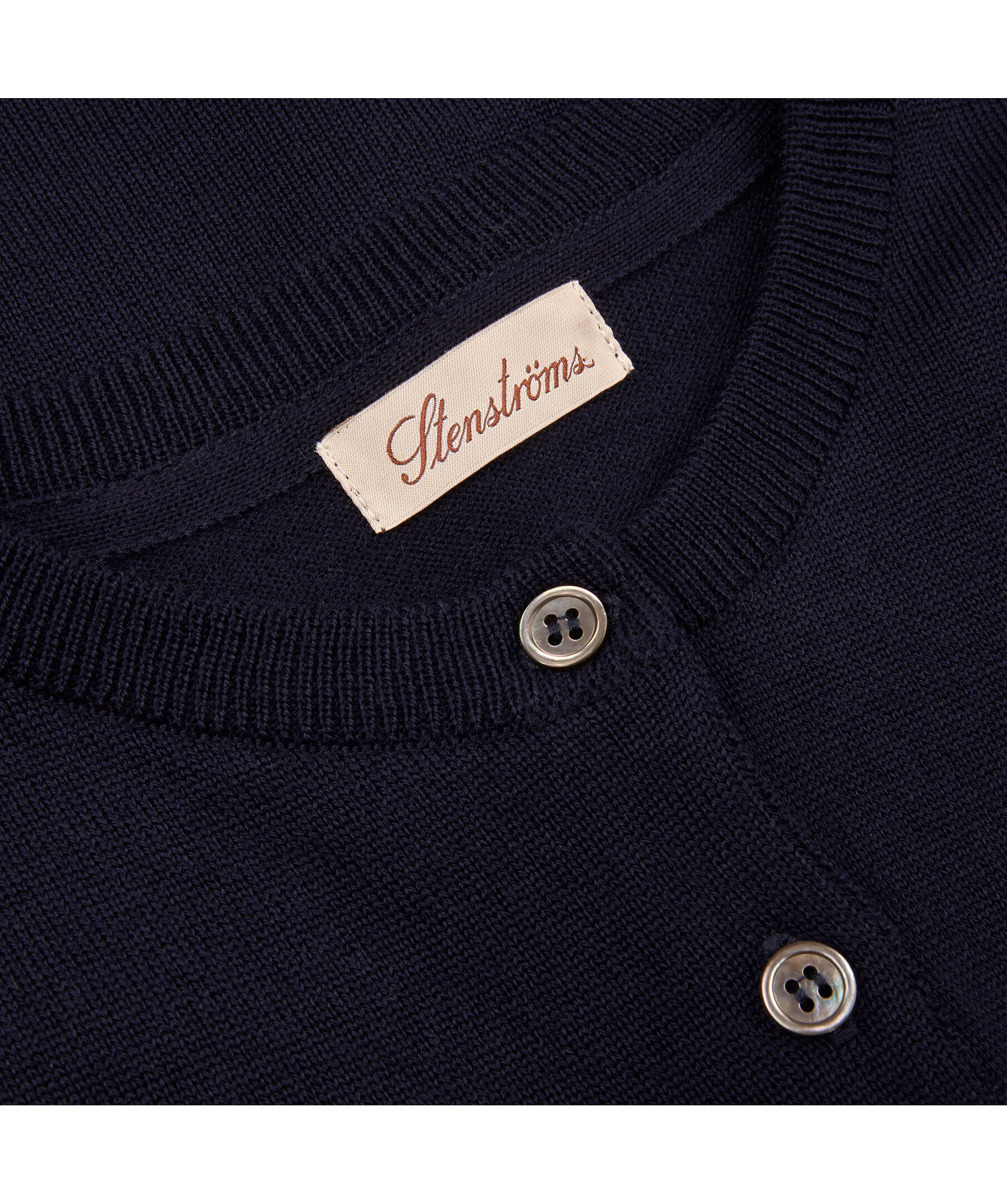 Marinblå, klassisk, stickad cardigan från Stenströms. Gjord av italiensk merinoull och är det perfekta mellanlagret när temperaturen faller. Designad med ribbstickade ärmslut och fåll. Knäppning framtill med knappar av pärlemor och rundad halsringning.
