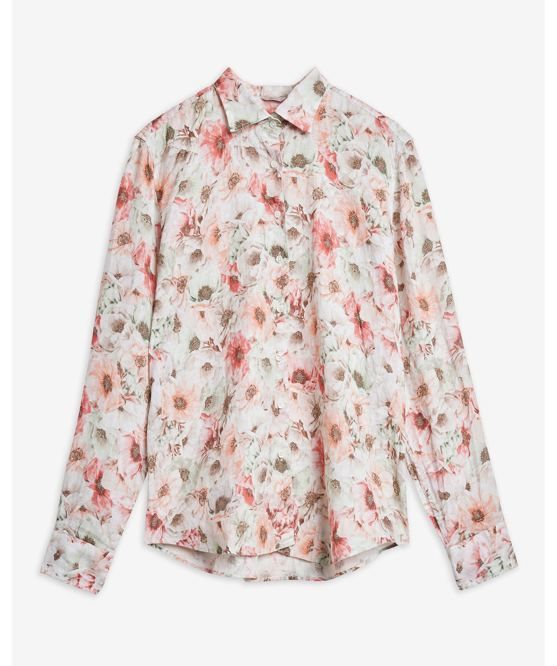 Ljusorange blommig skjorta är tillverkad av linne och har en oversized passform. Skjortan har pärlemorknappar, enkla manschetter och en klassisk krage.