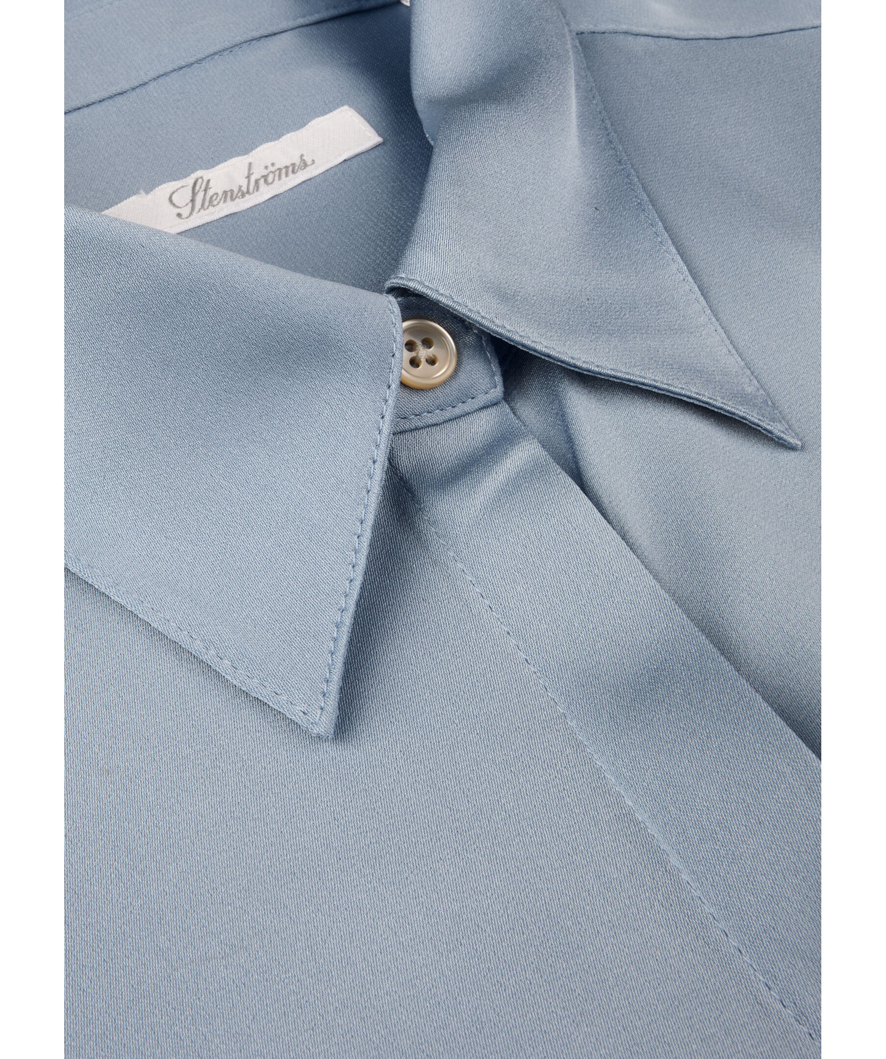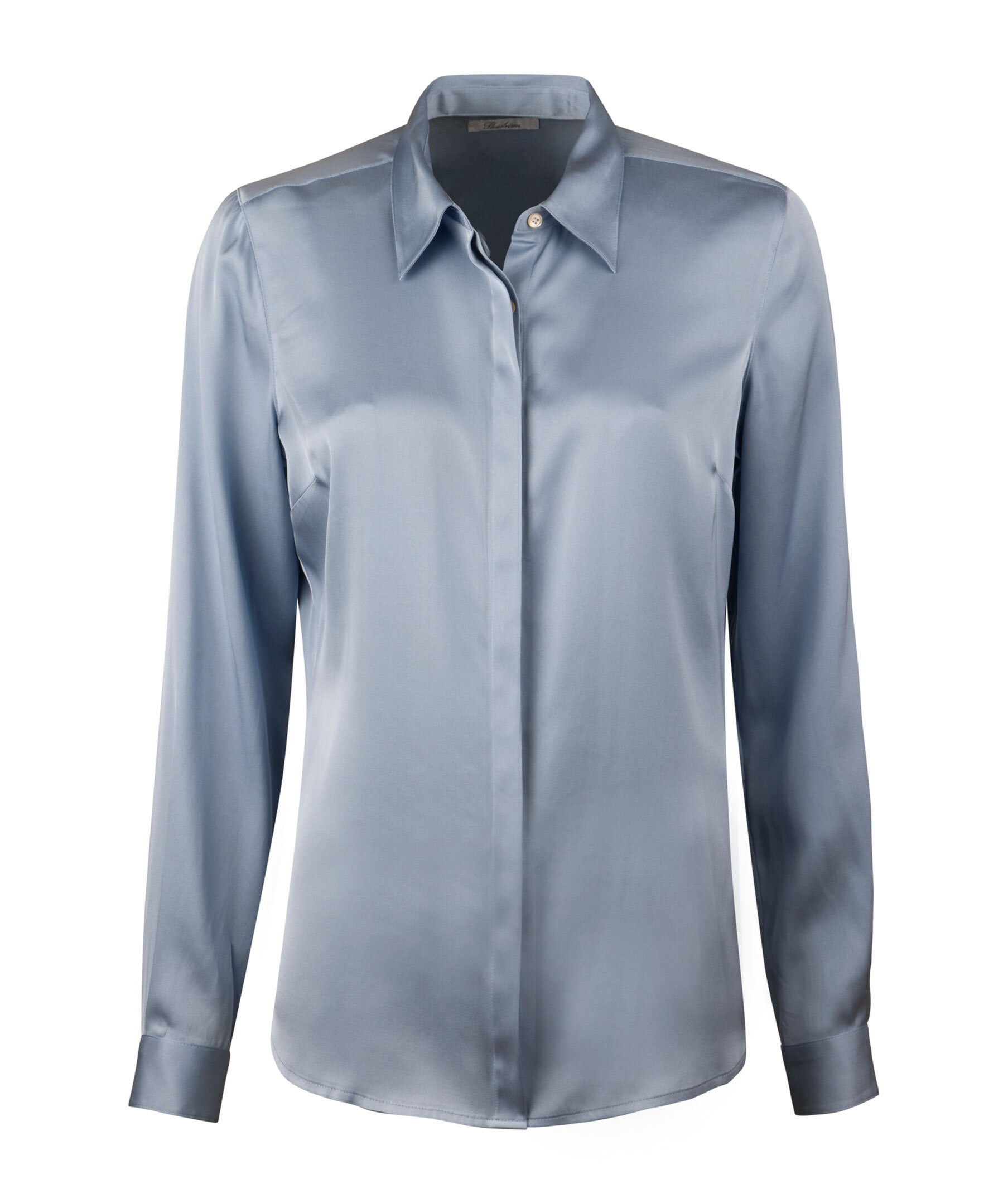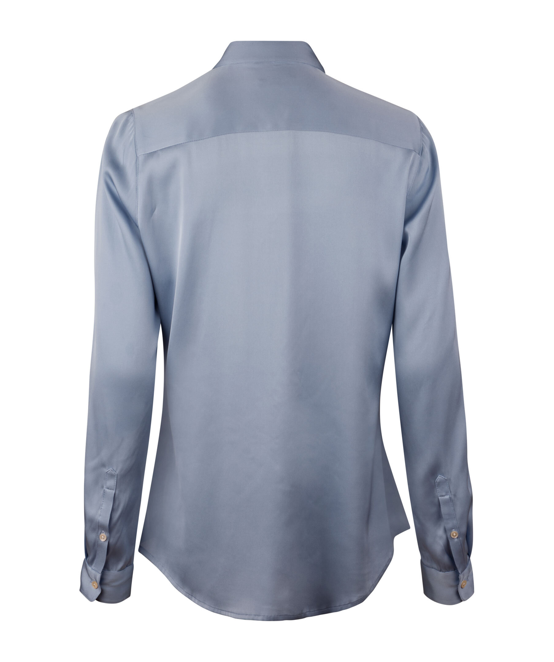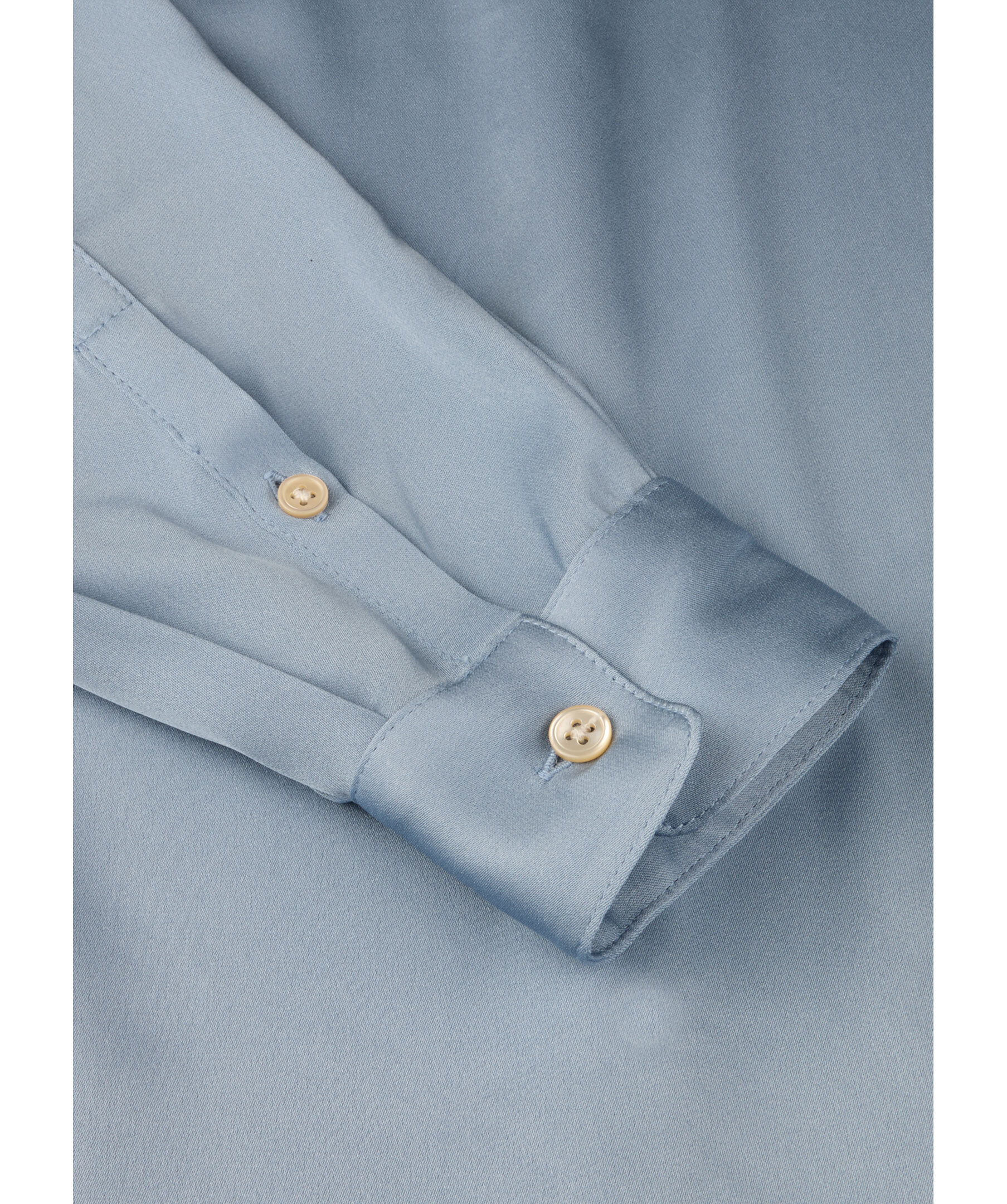 Denna skjorta är tillverkad av siden och har en feminin passform. Skjortan har en dold knappslå, enkla manschetter och en klassisk krage.