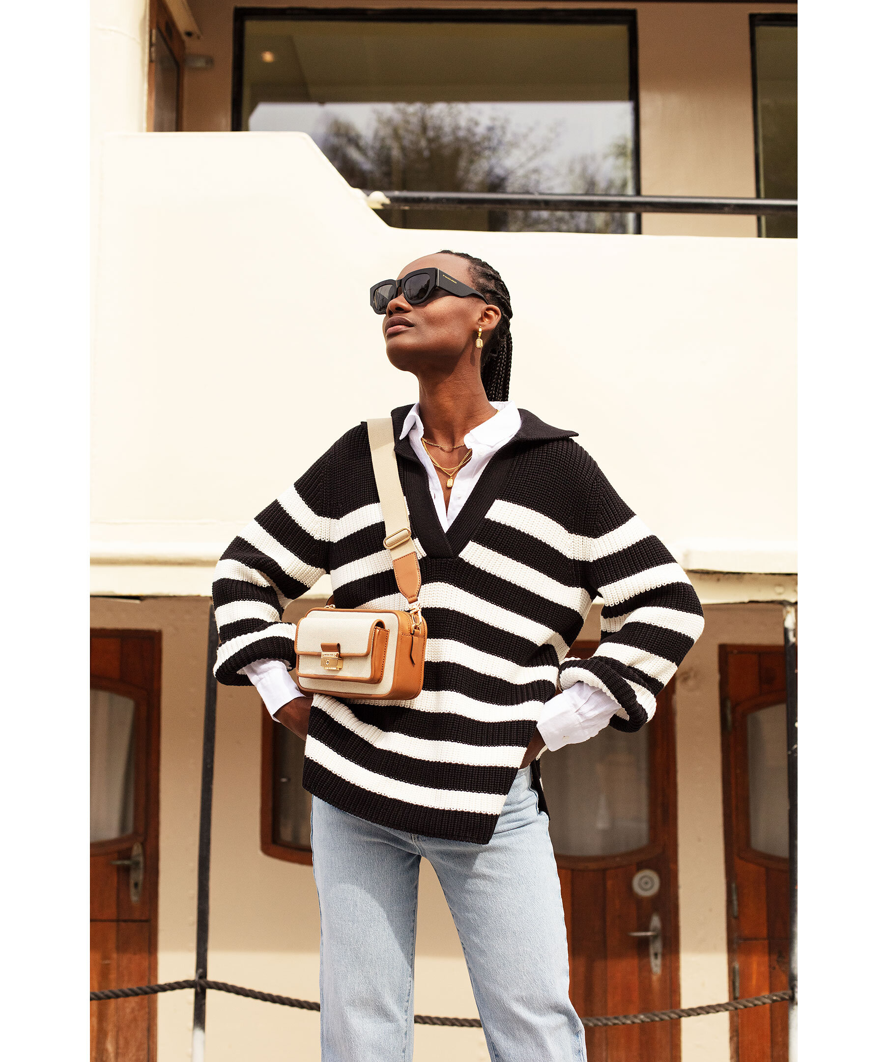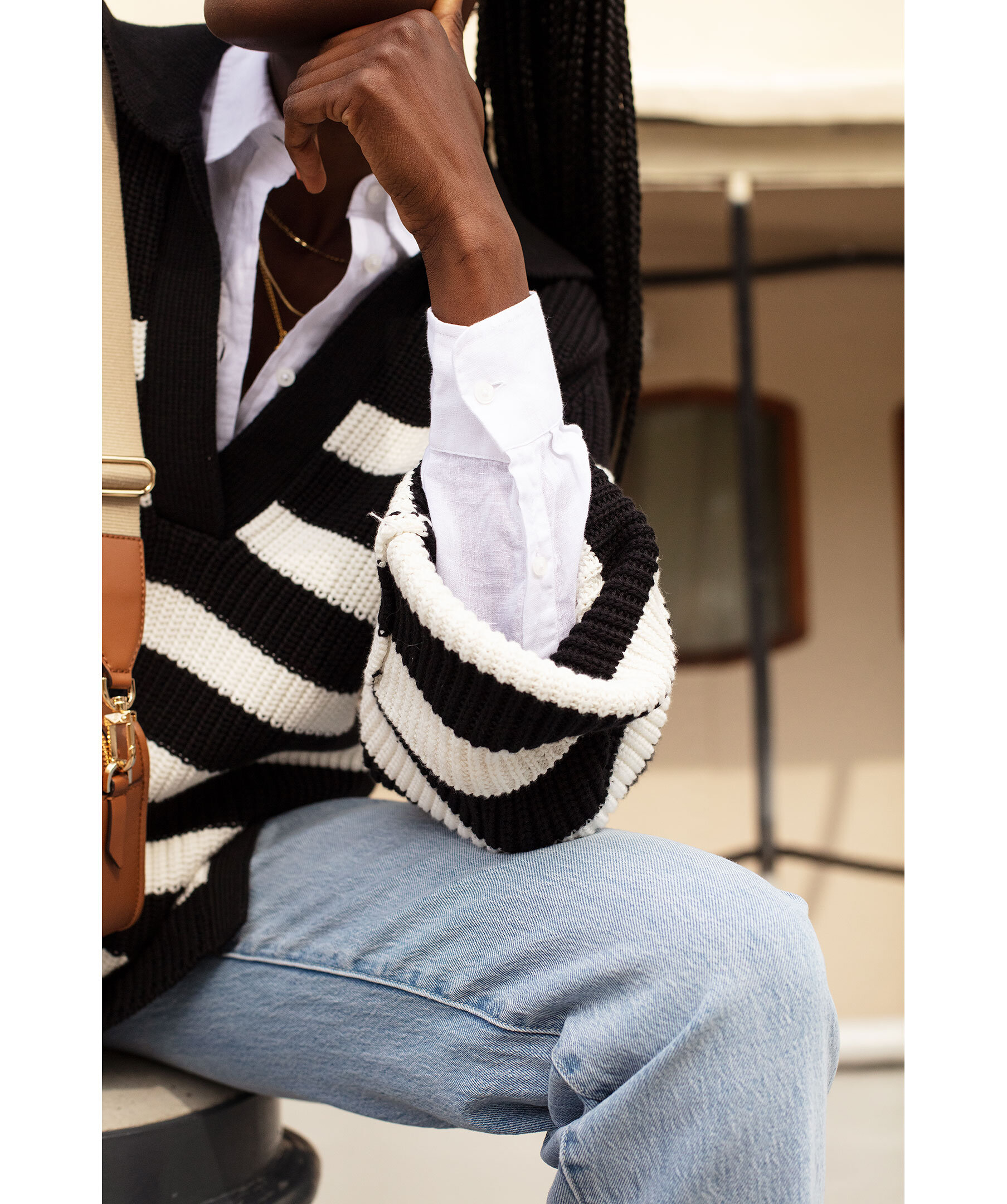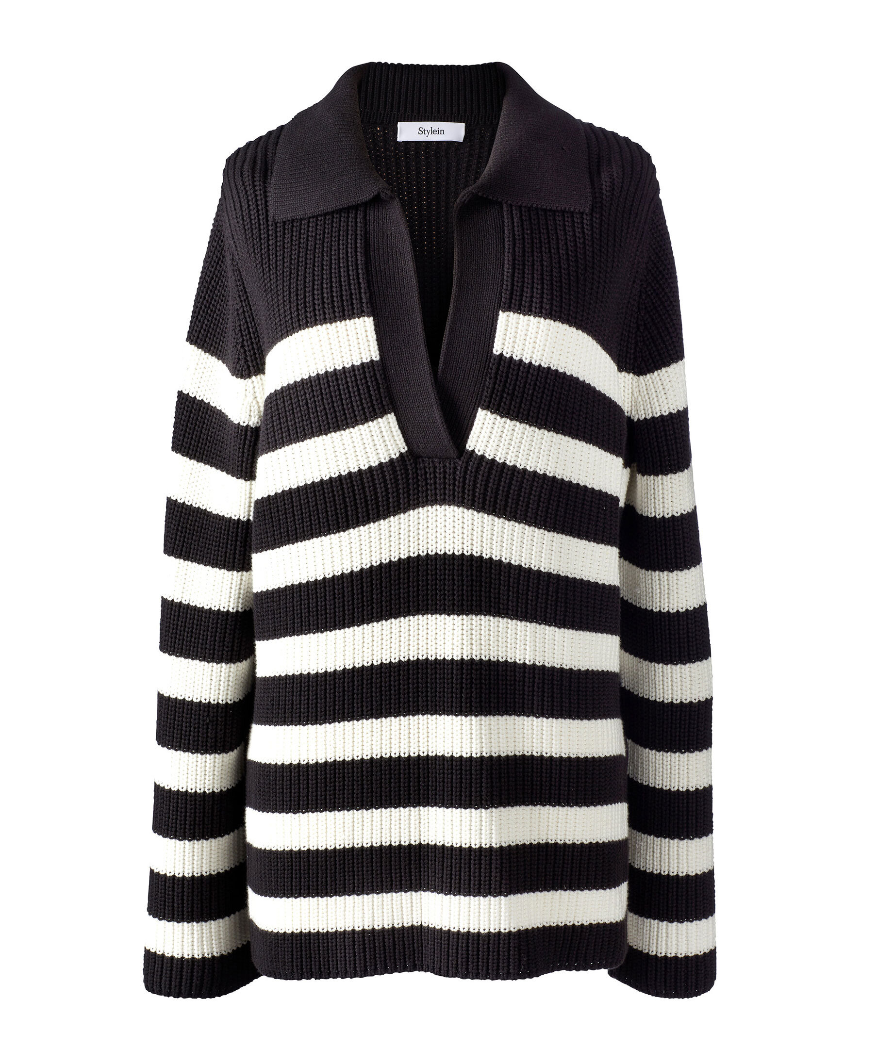 Svart stickad chuncky sweater med vita ränder från Stylein. V-ringad med finstickad krage. Slitsar i sidorna. Tillverkad i 100% Organisk bomull. Oversized fit. Modellen är 182cm lång och har på sig storlek XS.