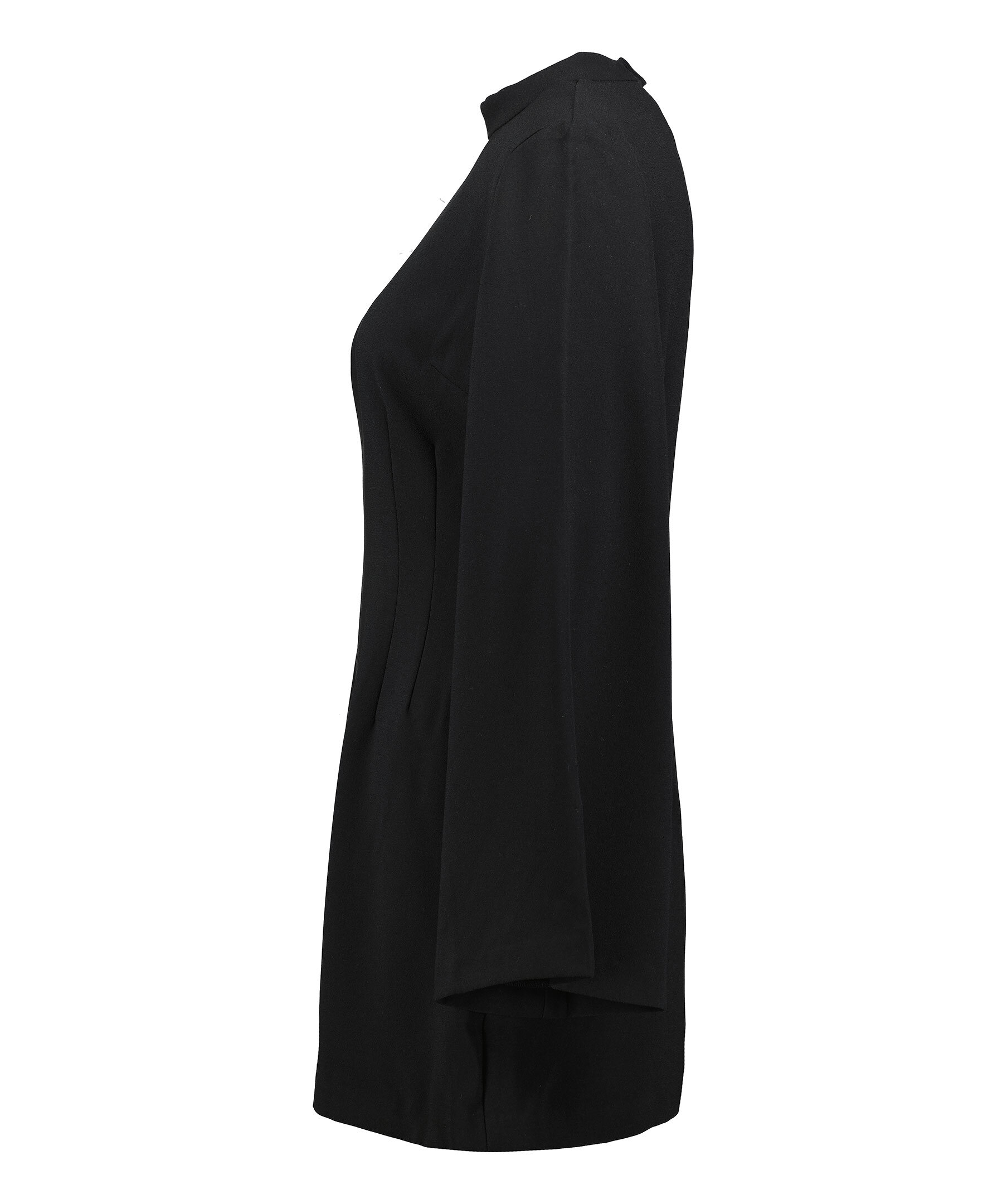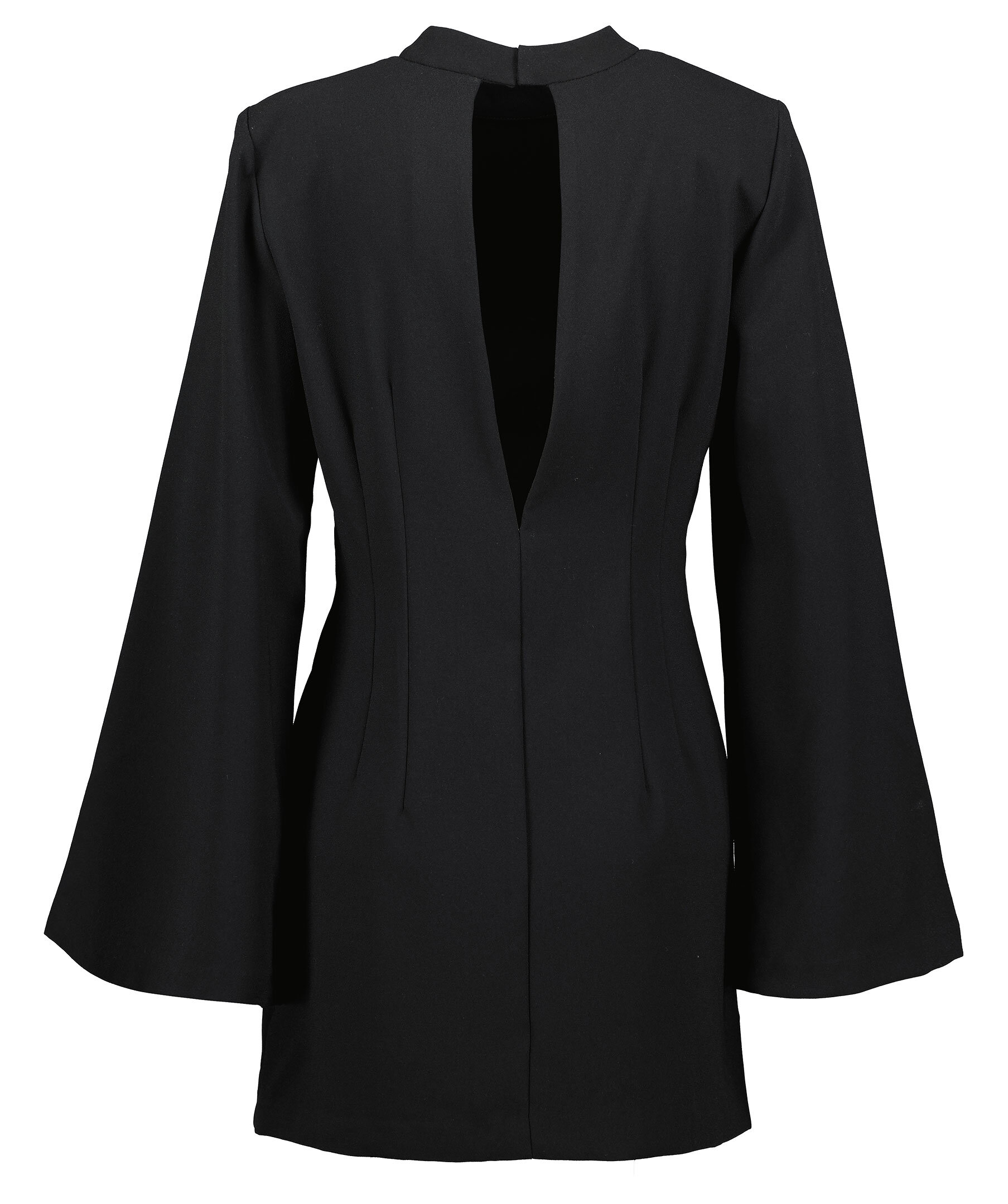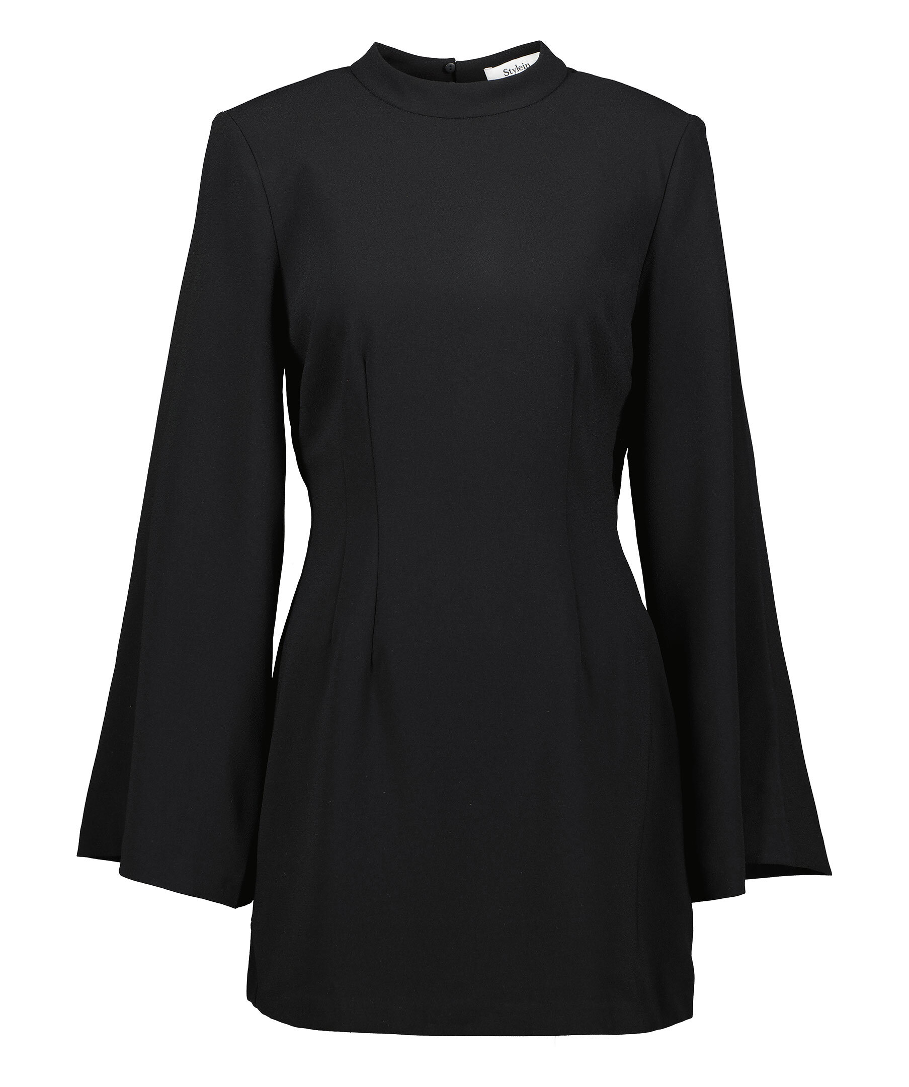 Svart klänning från Stylein. Hög krage, öppen i ryggen. Trumpet ärmar. Dragkedja i vänster sida för en lättare påtagning. Känningen slutar mitt på låret.
