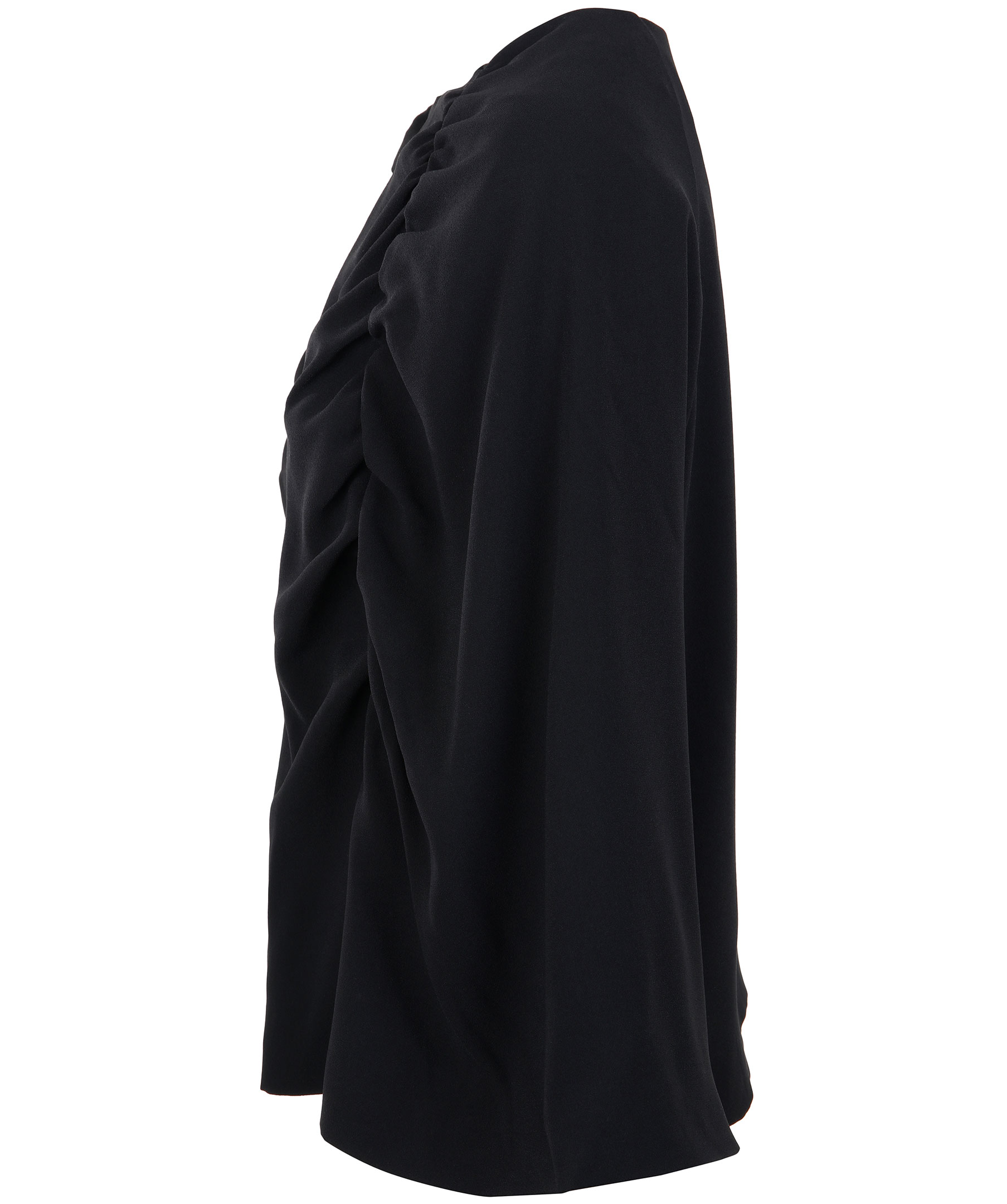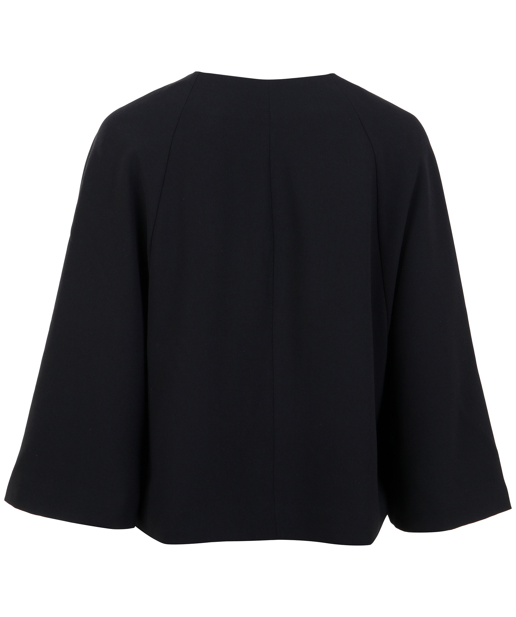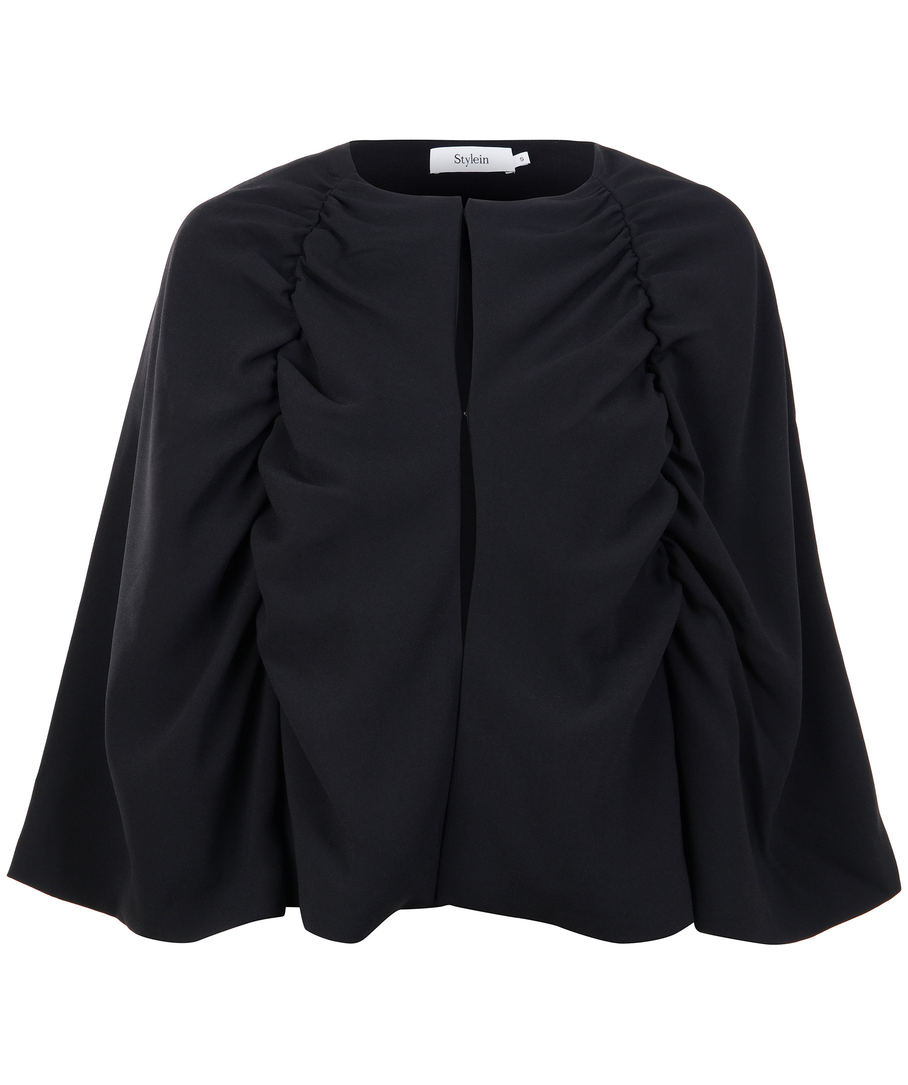 Svart boxig kavaj från Stylein. Draperade detaljer fram, rundad halsringning, stängs med tre krokar med hällor fram. Vida ärmar som fastsydda i sidorna nästan hela vägen ner. Tillverkad i polyester.