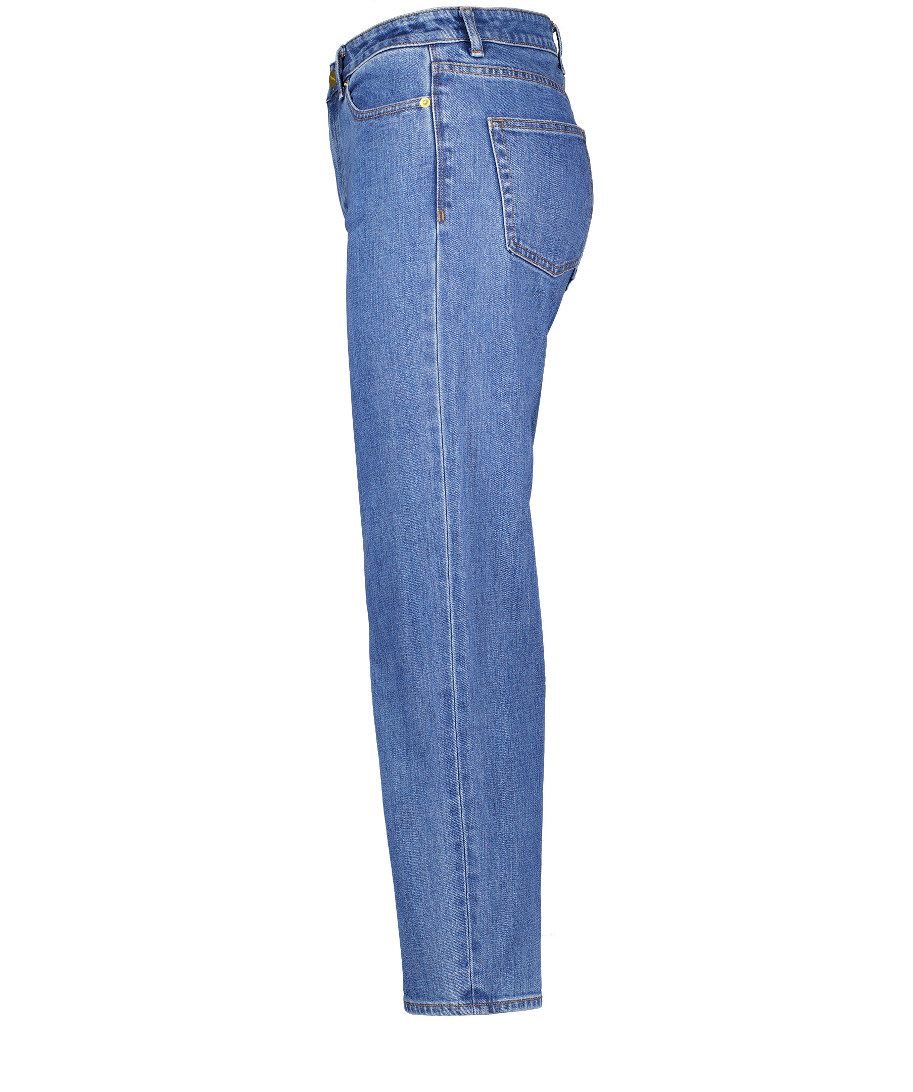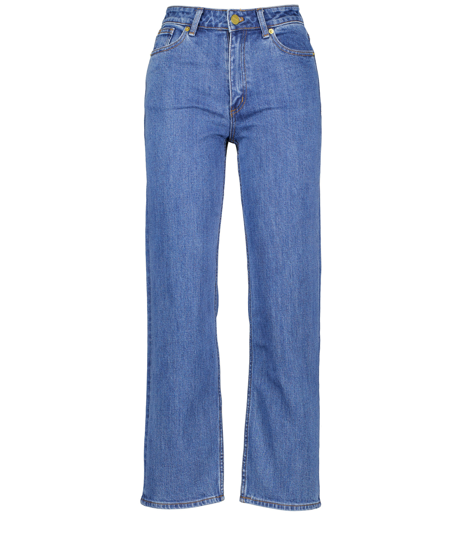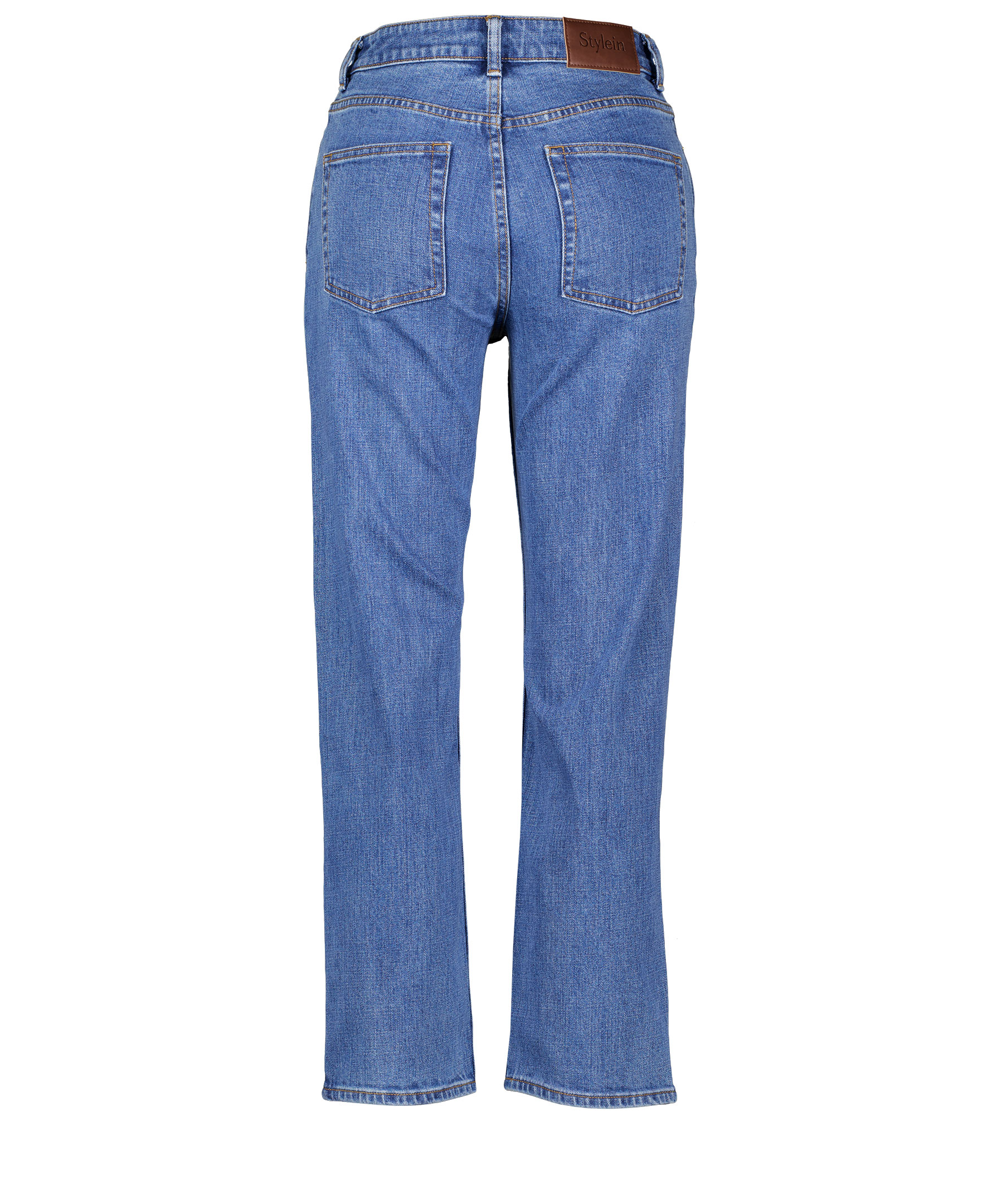 Blåa, avslappnade jeans från Stylein i fem ficks modell. Medelhög midja med raka croppade ben. Tvätten är en ljusblå stenad denim. Guldfärgade nitar och dold gylf med dragkedja och guldfärgad knapp med logotyp på. Etikett med logotyp bak i midjan. Tillverkad i stretchig bomull.